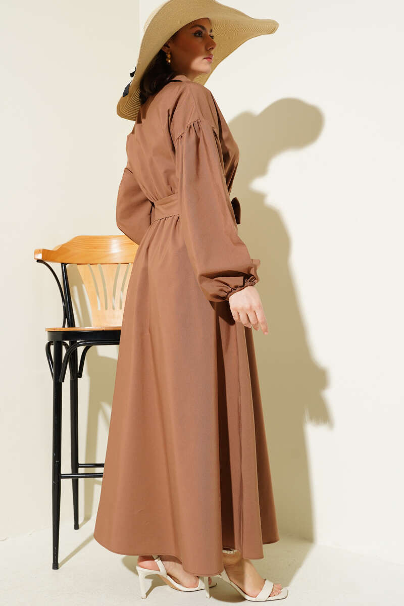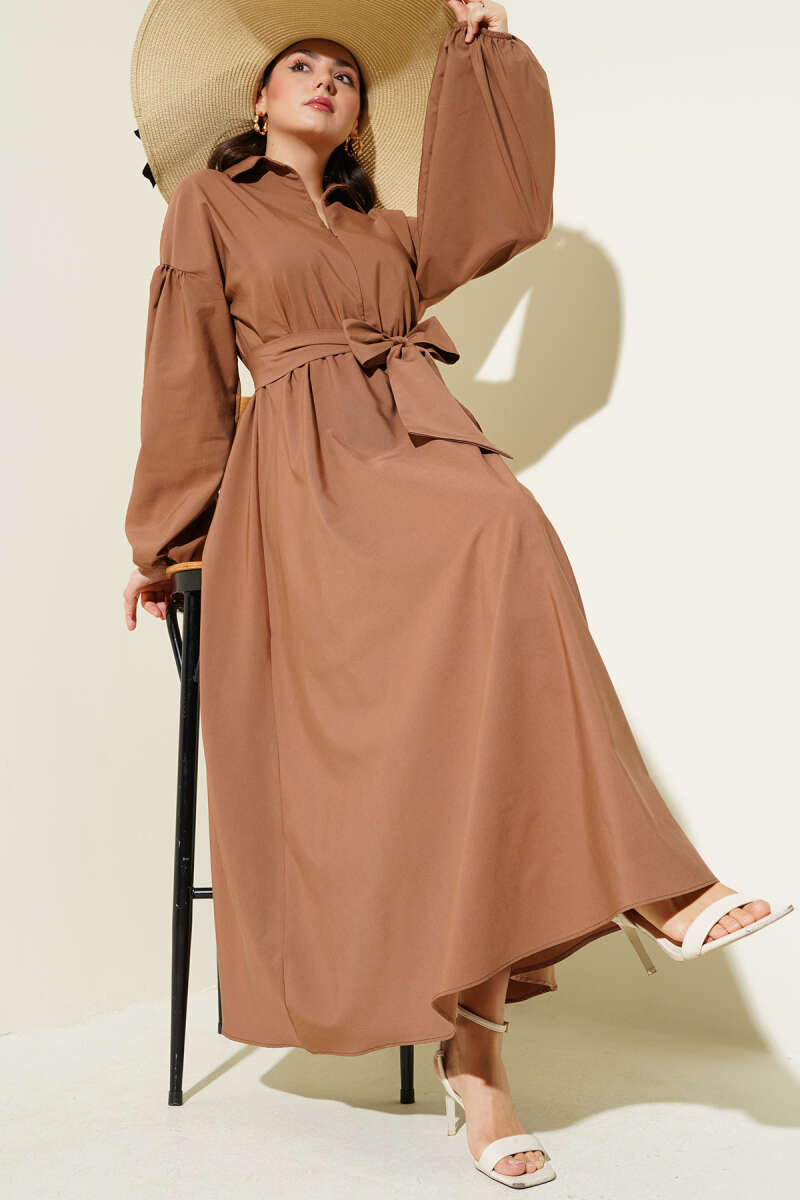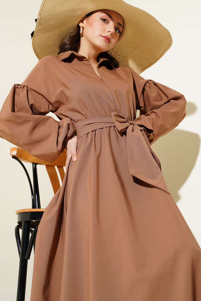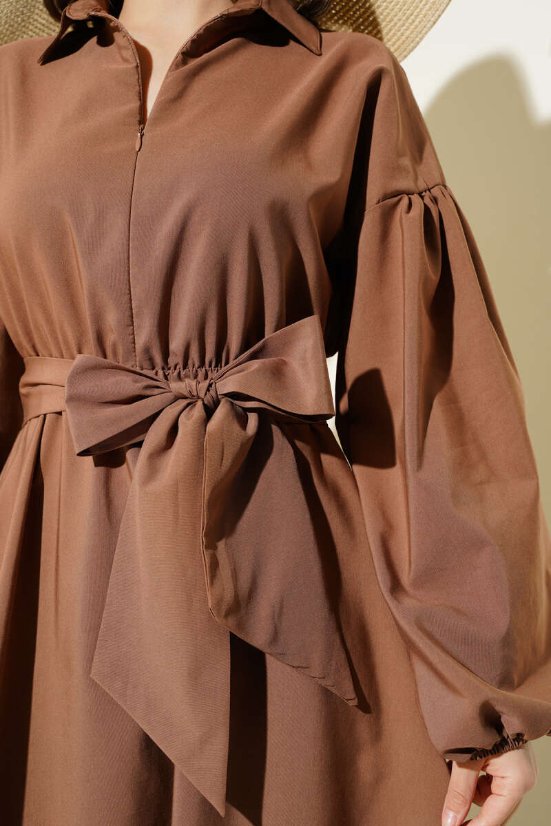 Yarım Fermuarlı Balon Kol Terikoton Elbise Latte
