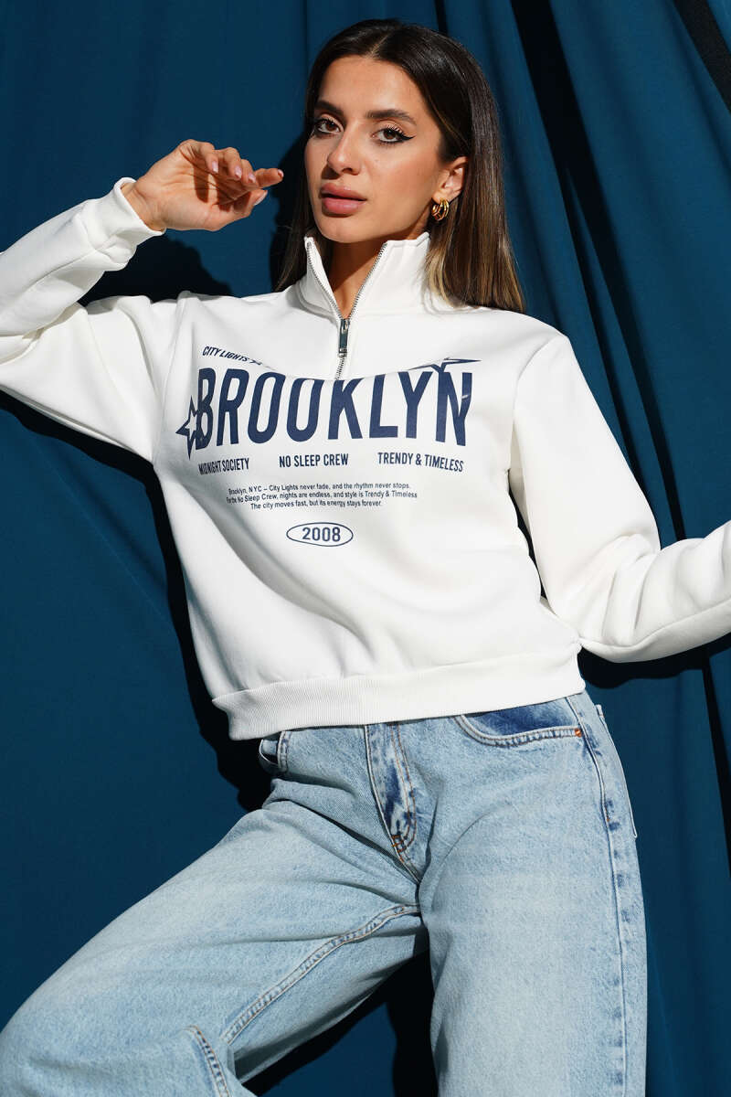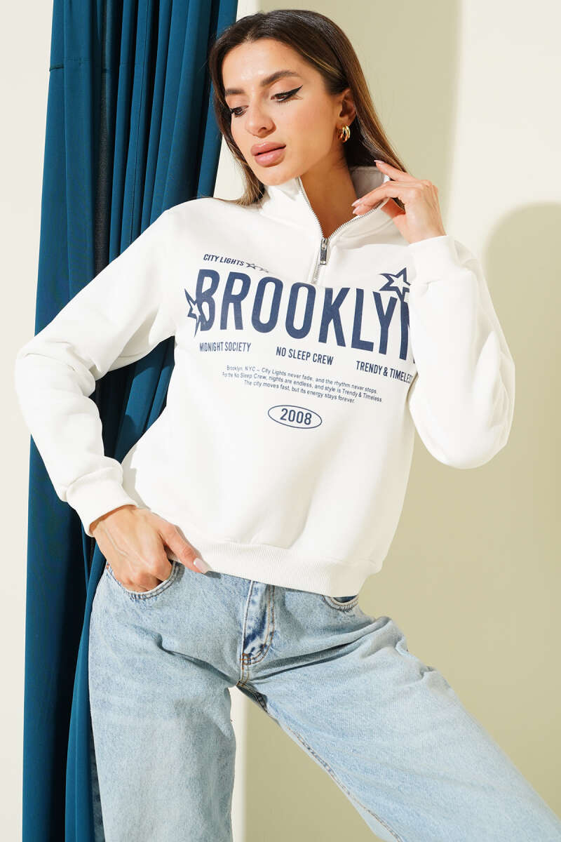 Yarım Fermuarlı Baskılı Üç İplik Sweat Ekru