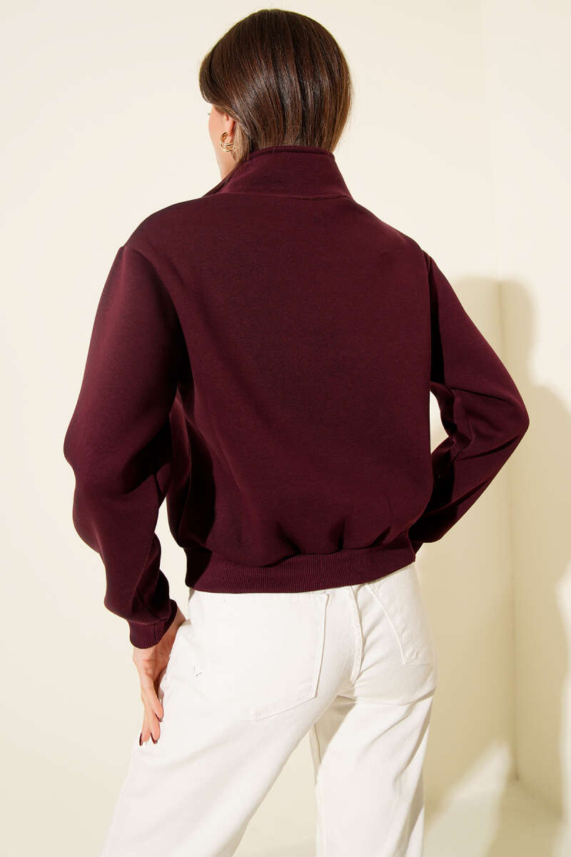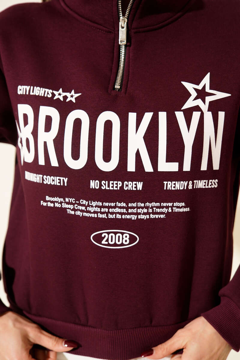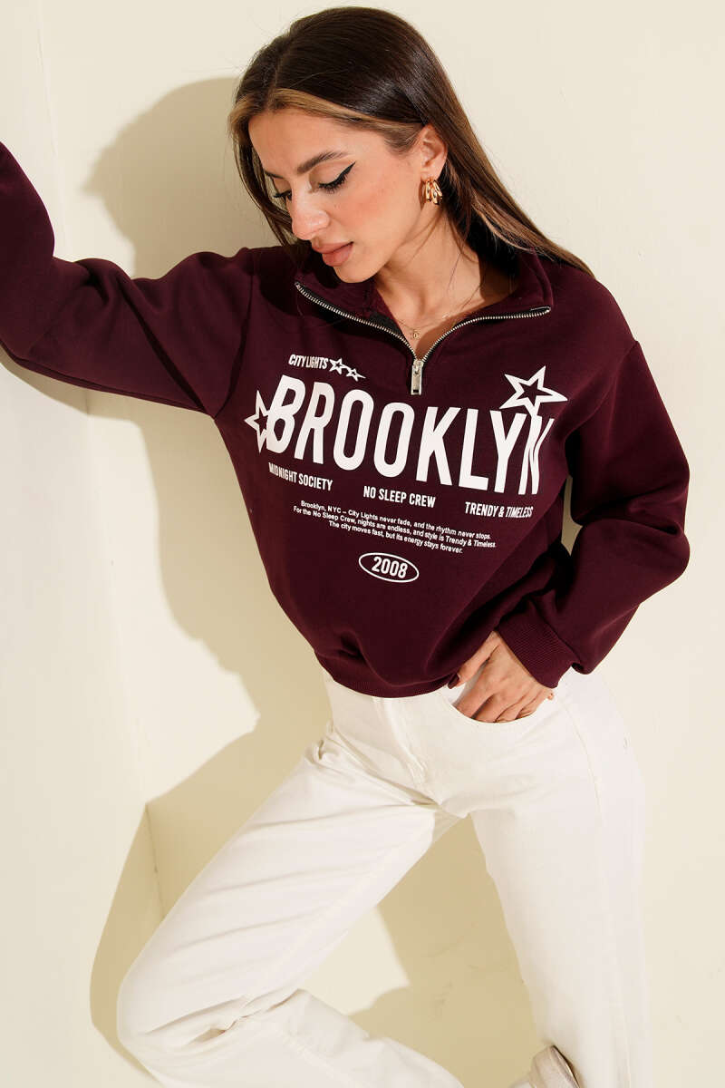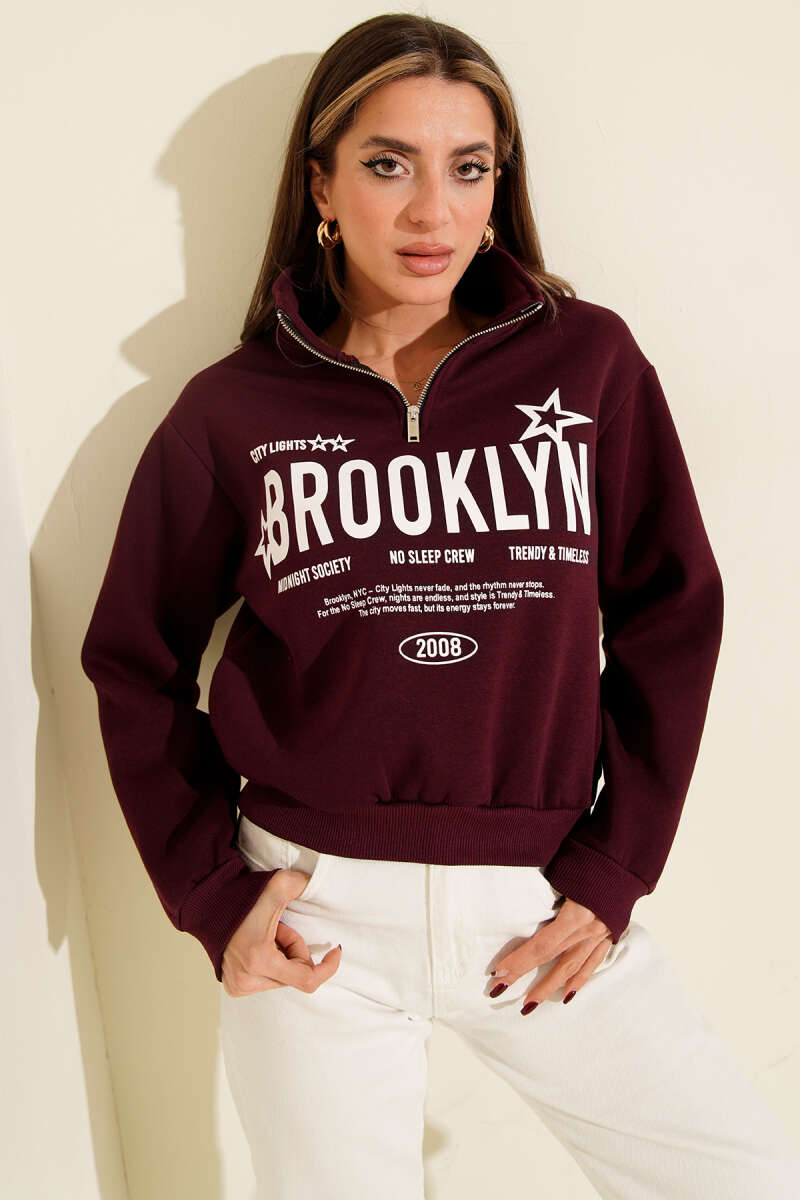 Yarım Fermuarlı Baskılı Üç İplik Sweat Mürdüm