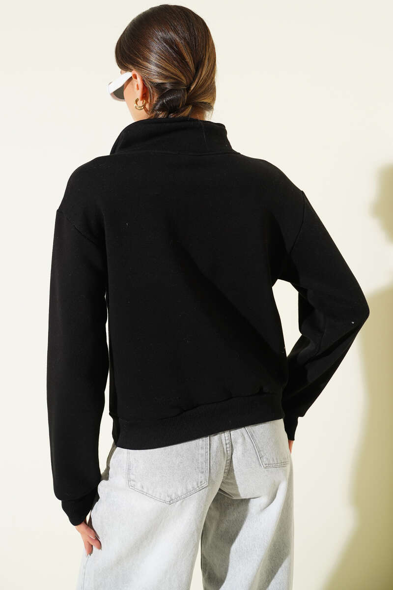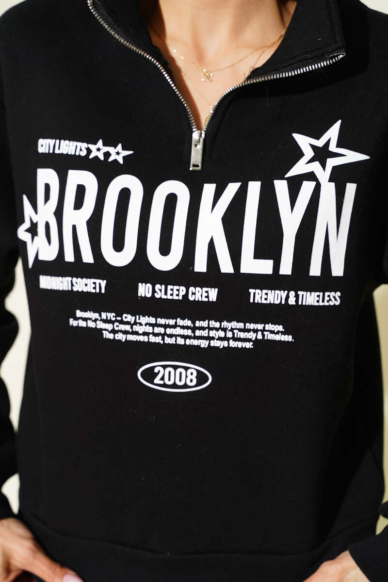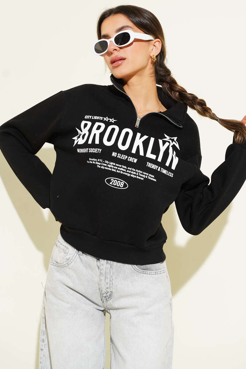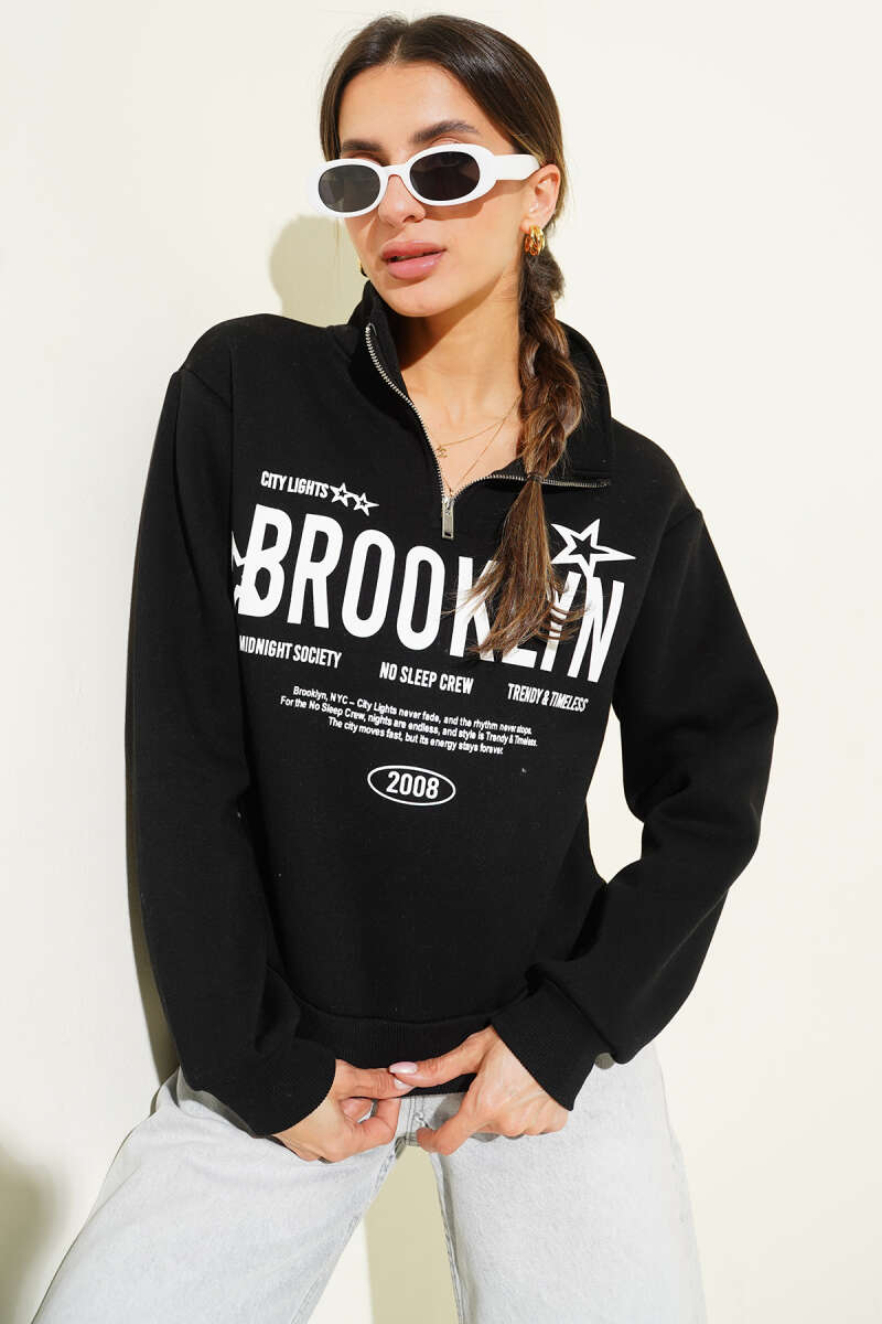 Yarım Fermuarlı Baskılı Üç İplik Sweat Siyah