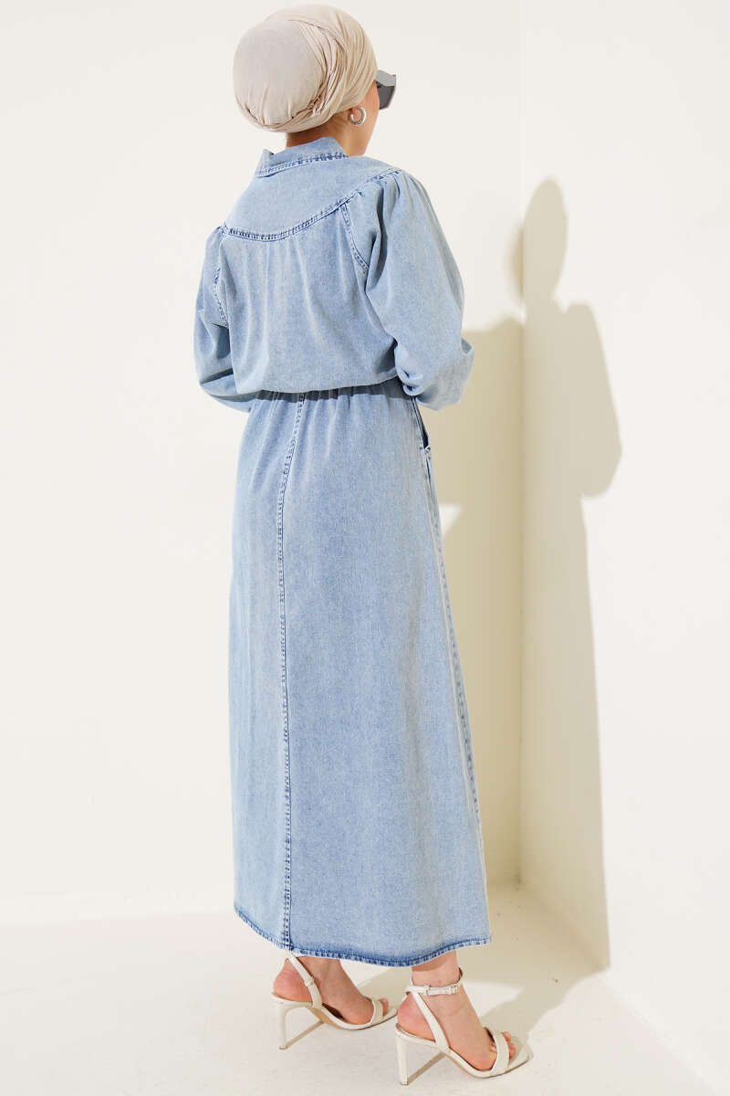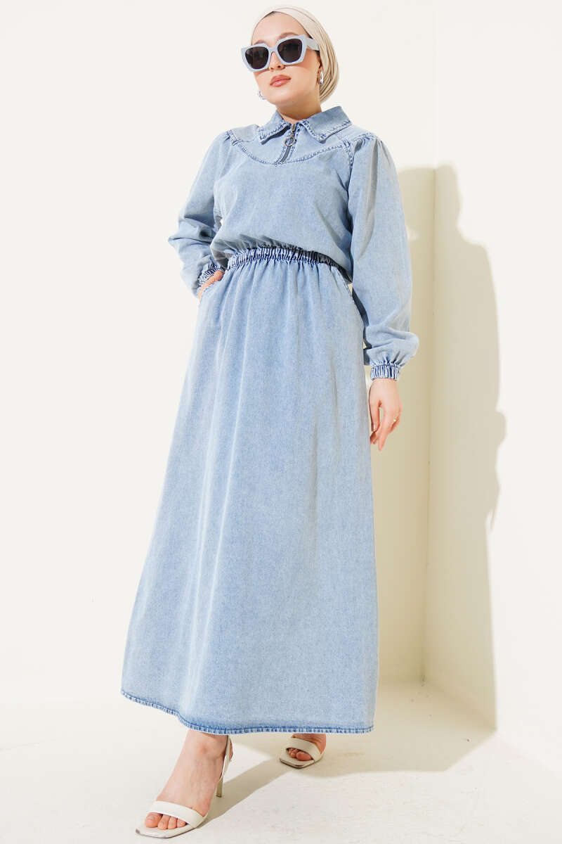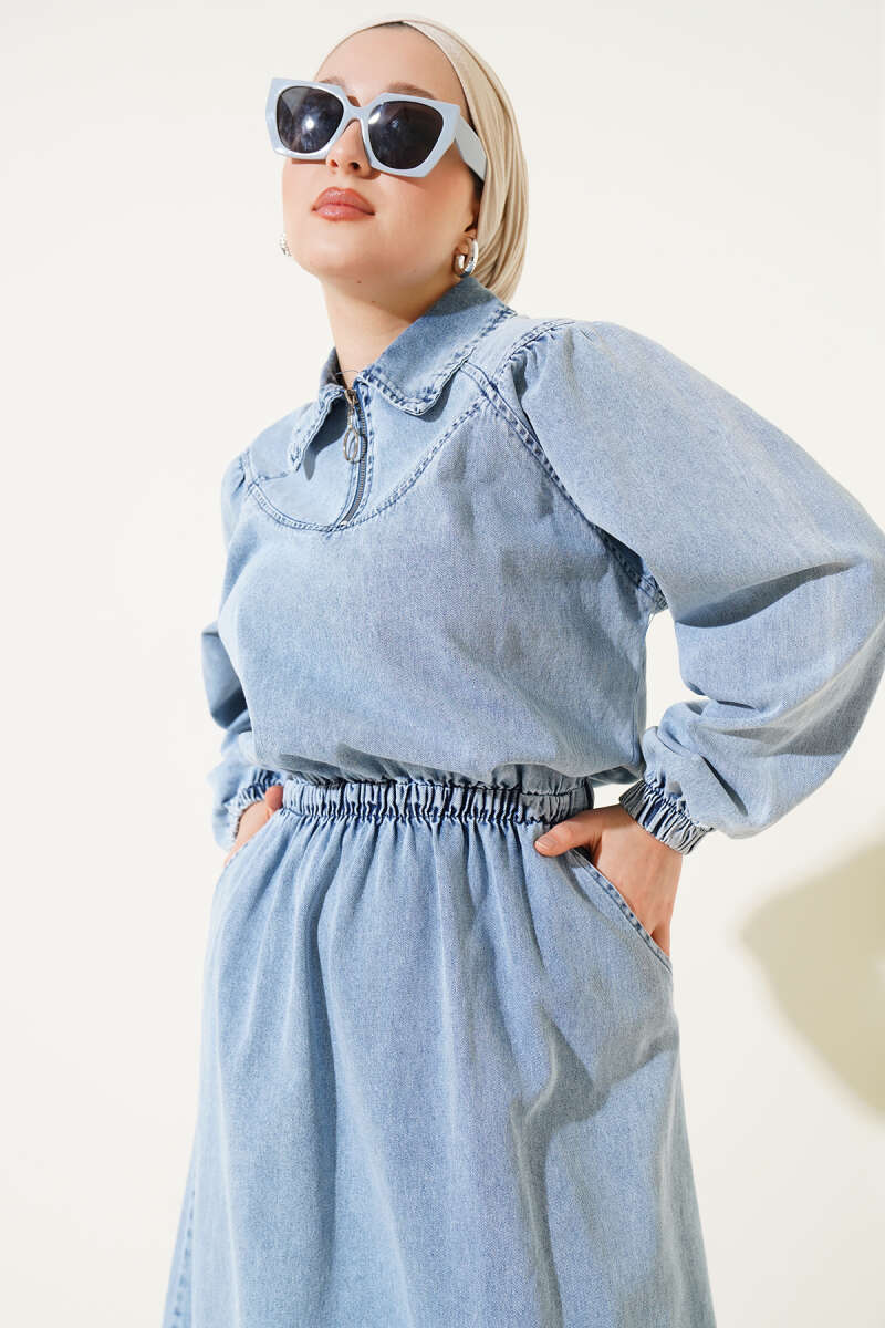 Yarım Fermuarlı Bel Lastikli Kot Elbise Açık Mavi