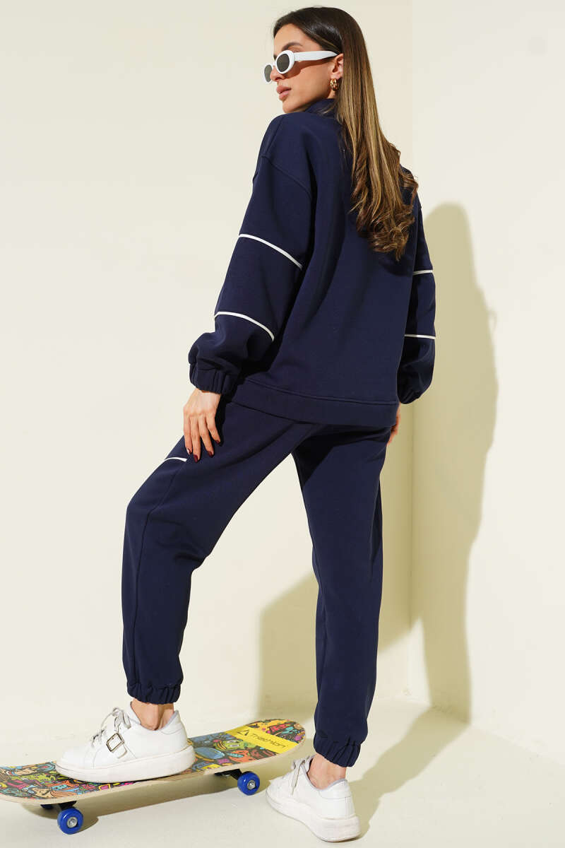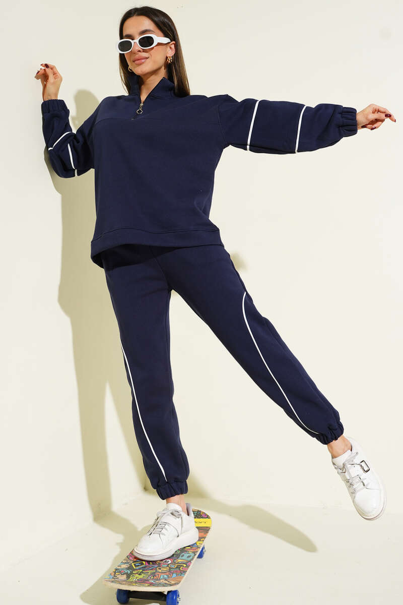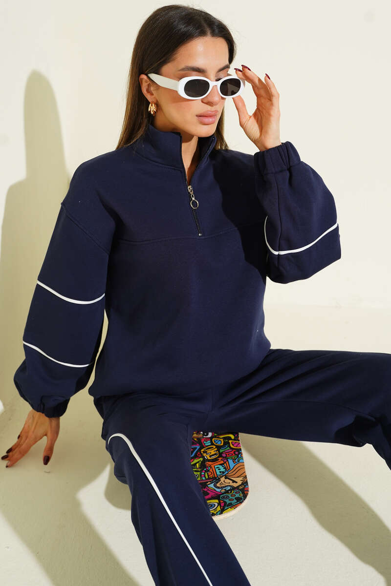 Yarım Fermuarlı Biyeli Üç İplik İkili Takım Lacivert
