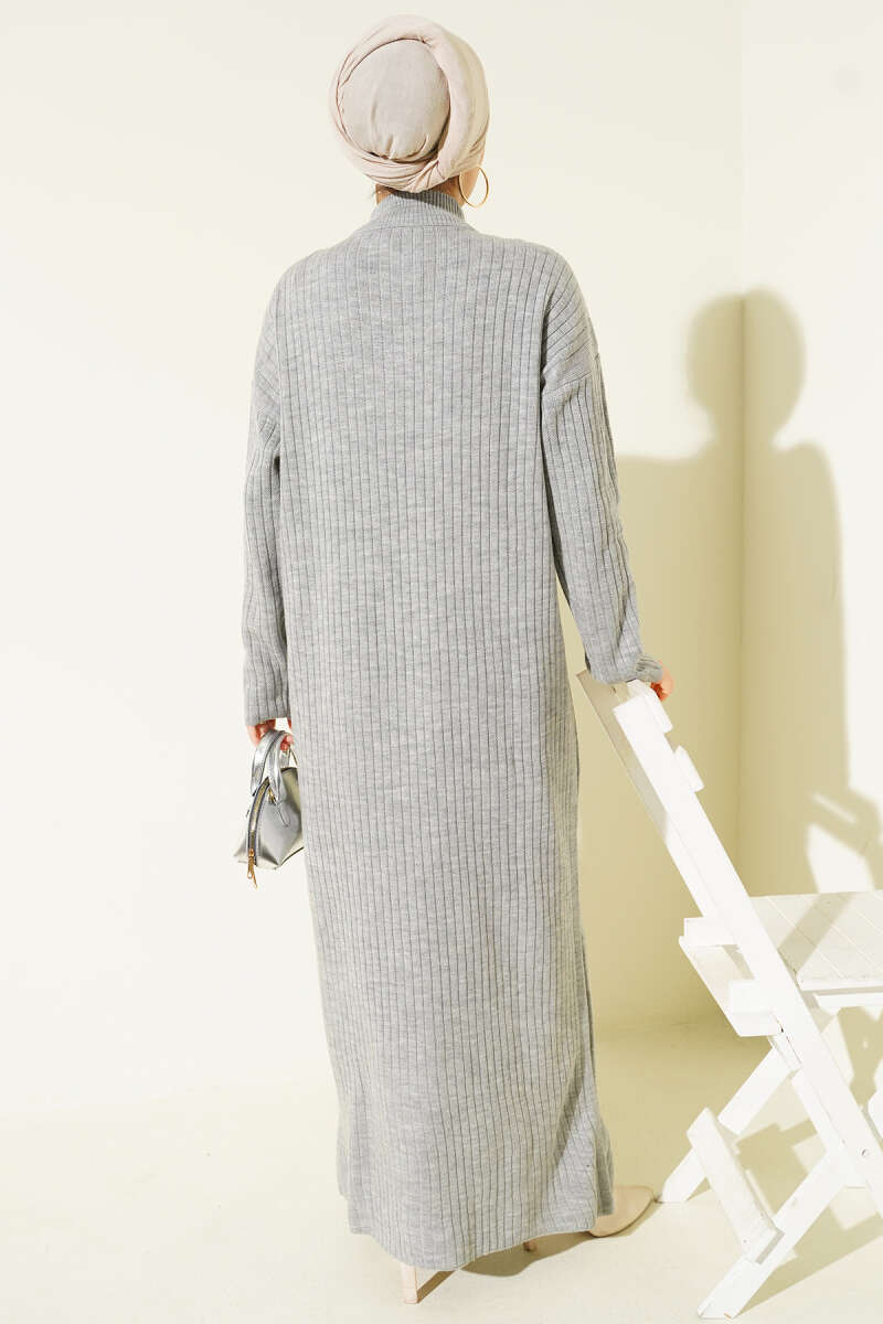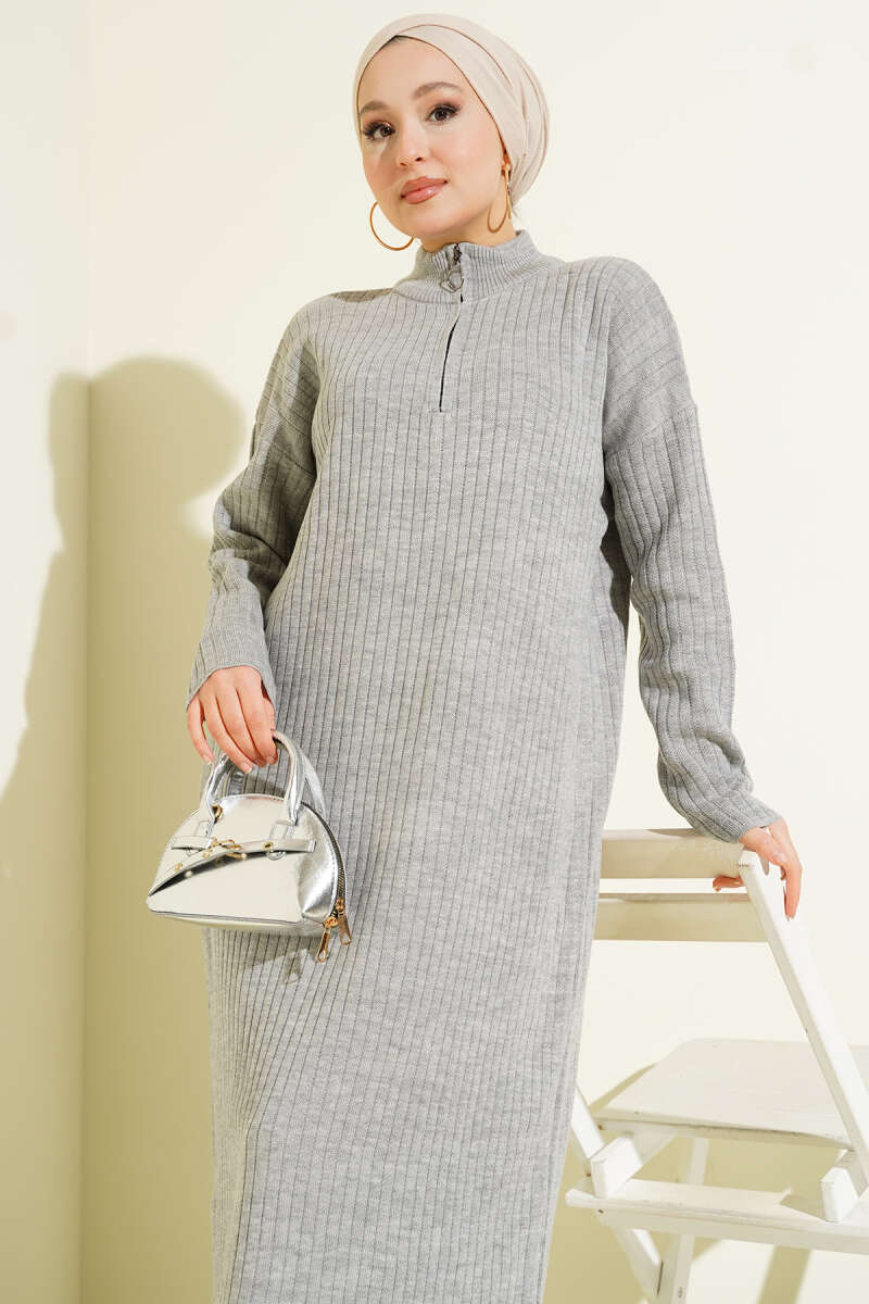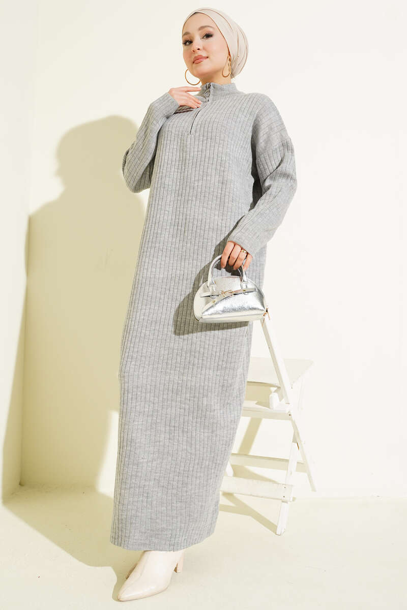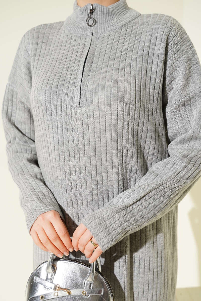 Yakası Yarım Fermuarlı Triko Elbise Füme