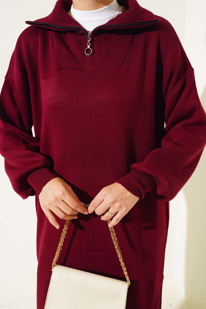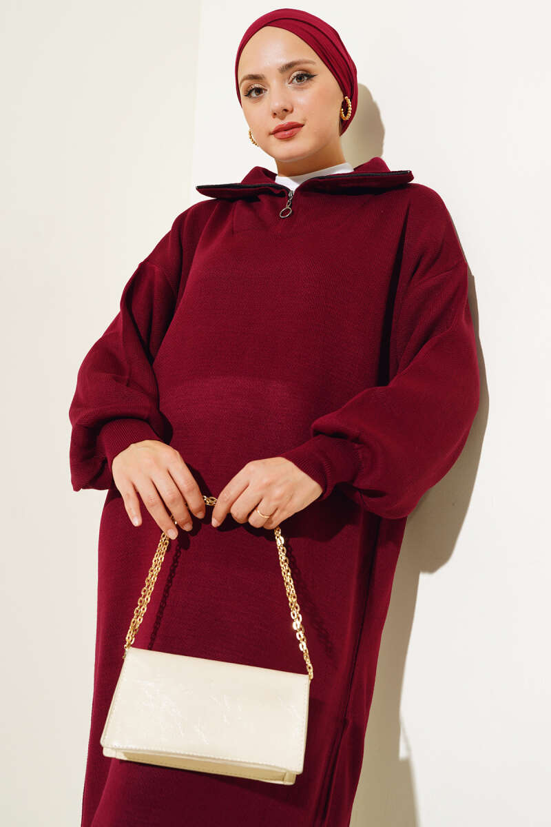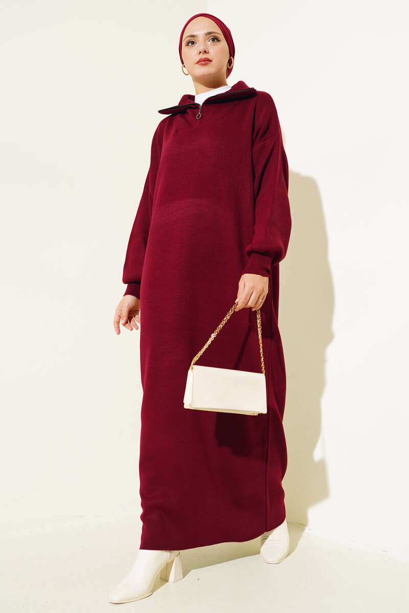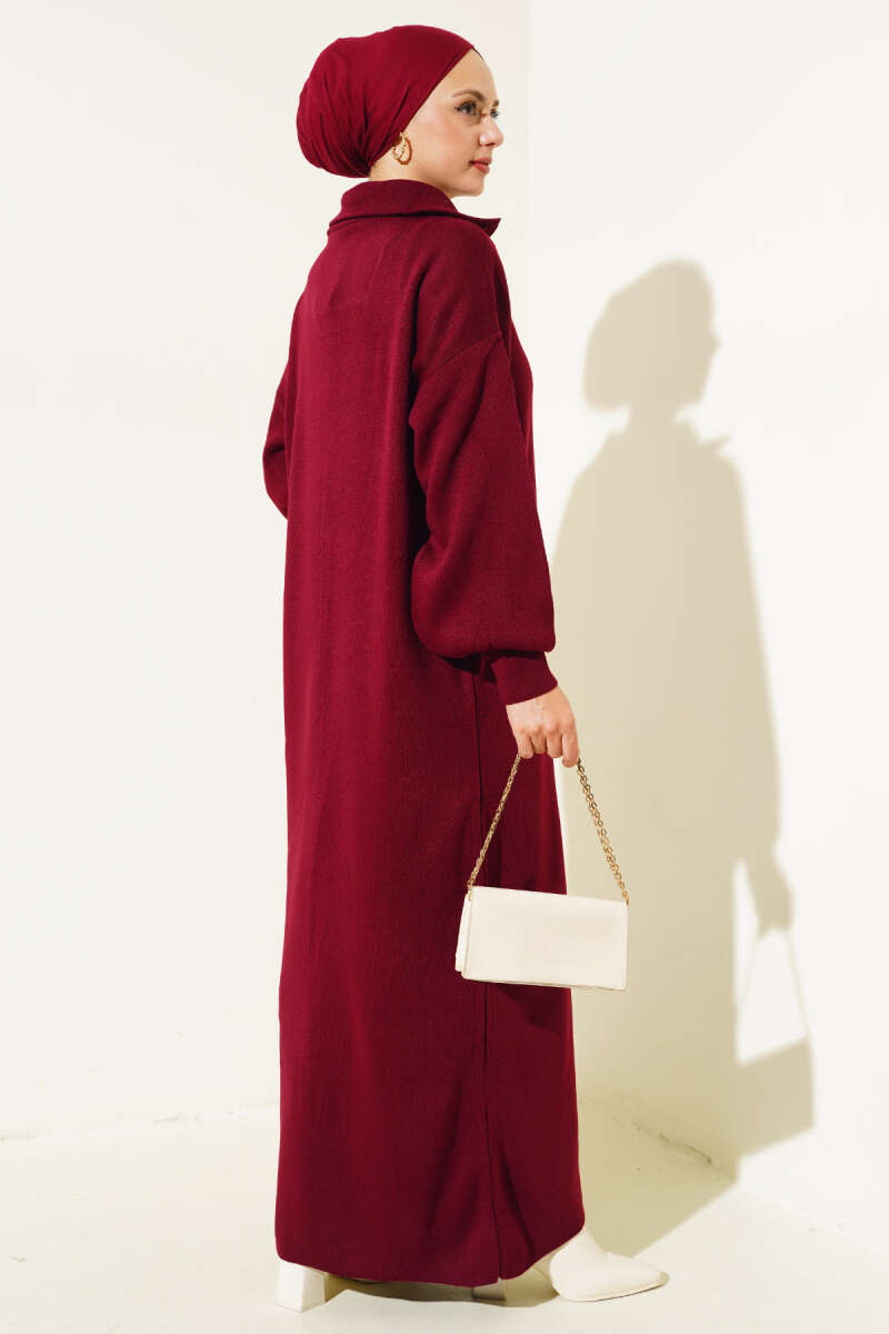 Gömlek Yaka Düğmeli Triko Elbise Bordo