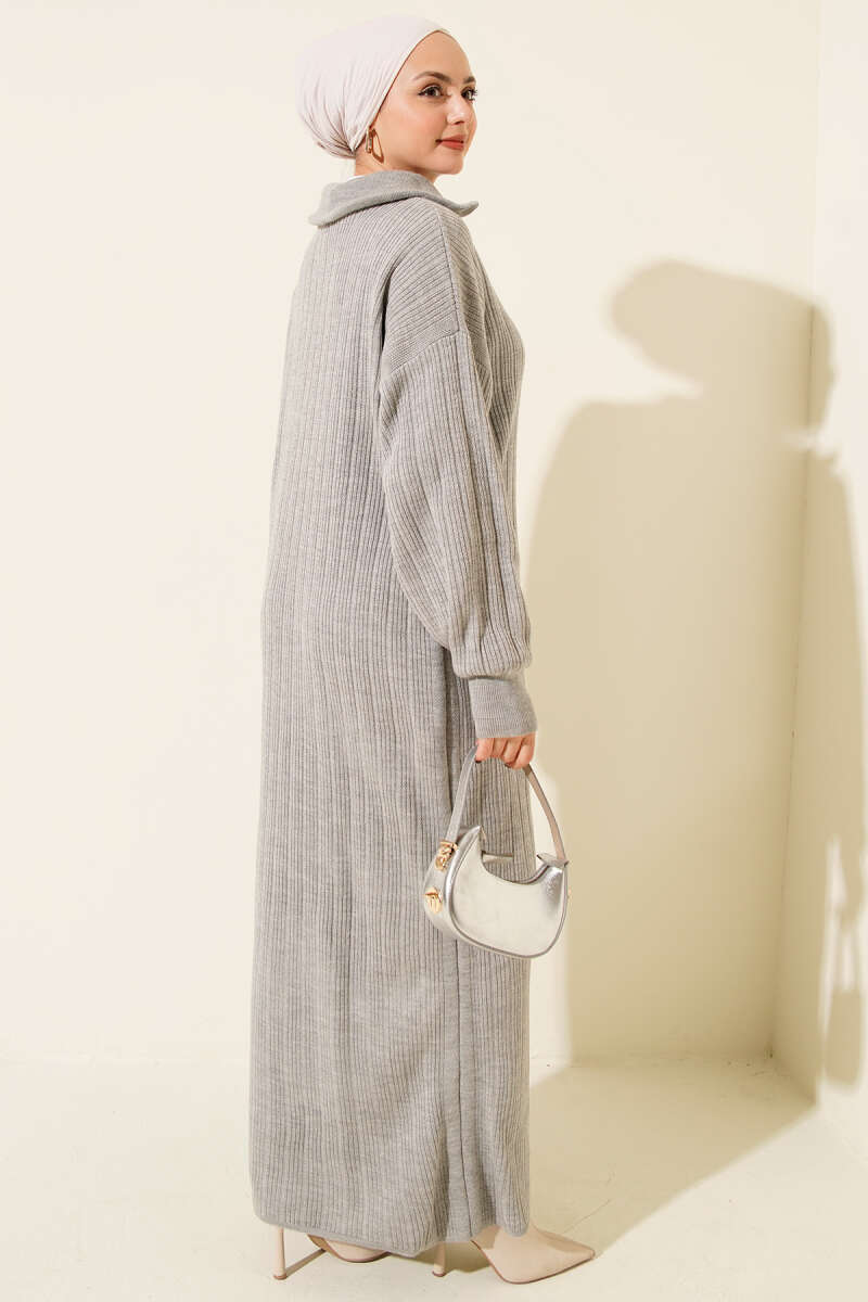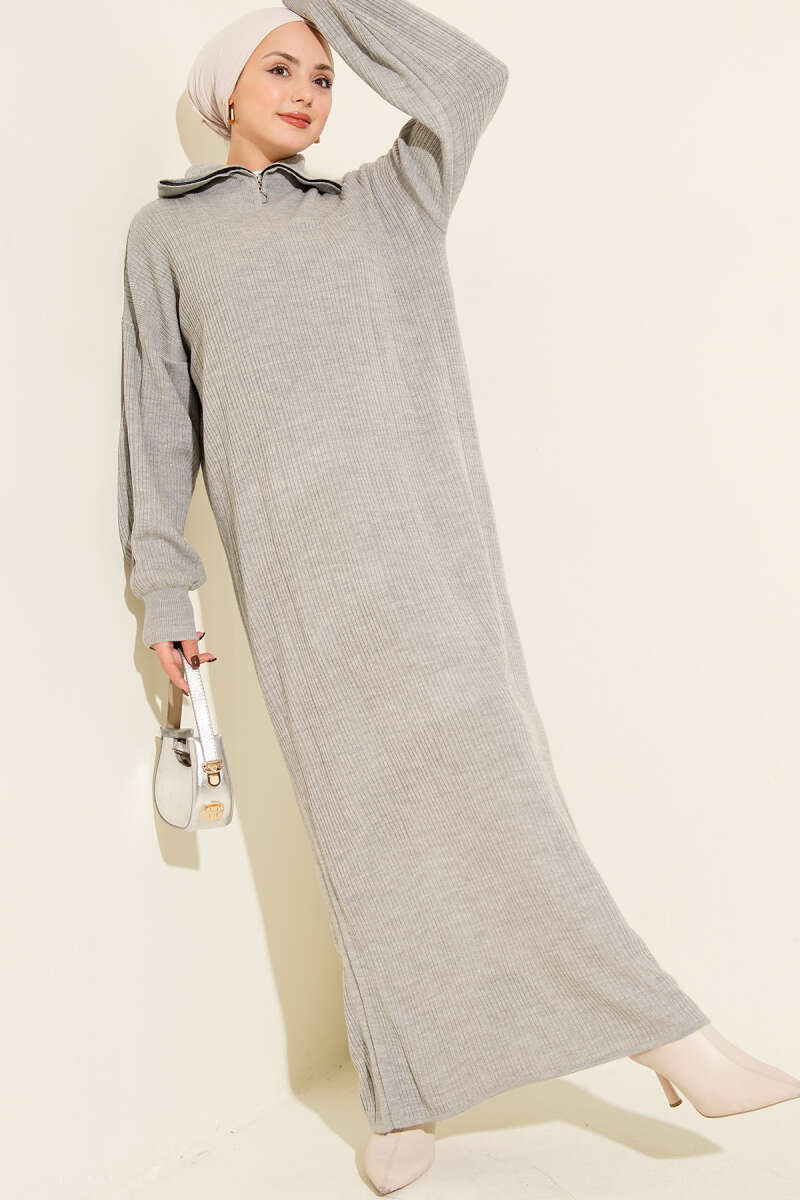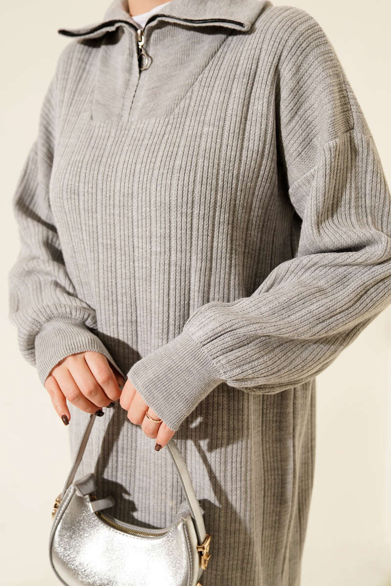 Yarım Fermuarlı Fitili Triko Elbise Taş