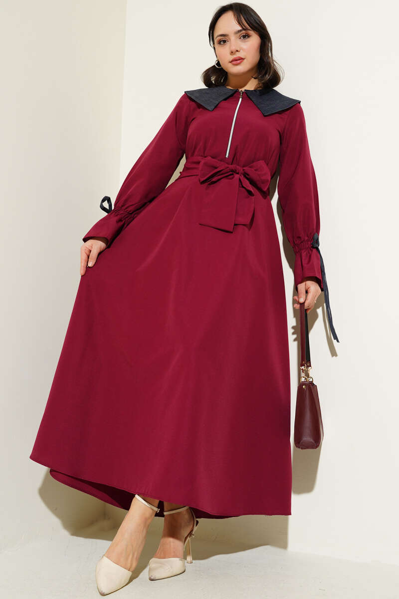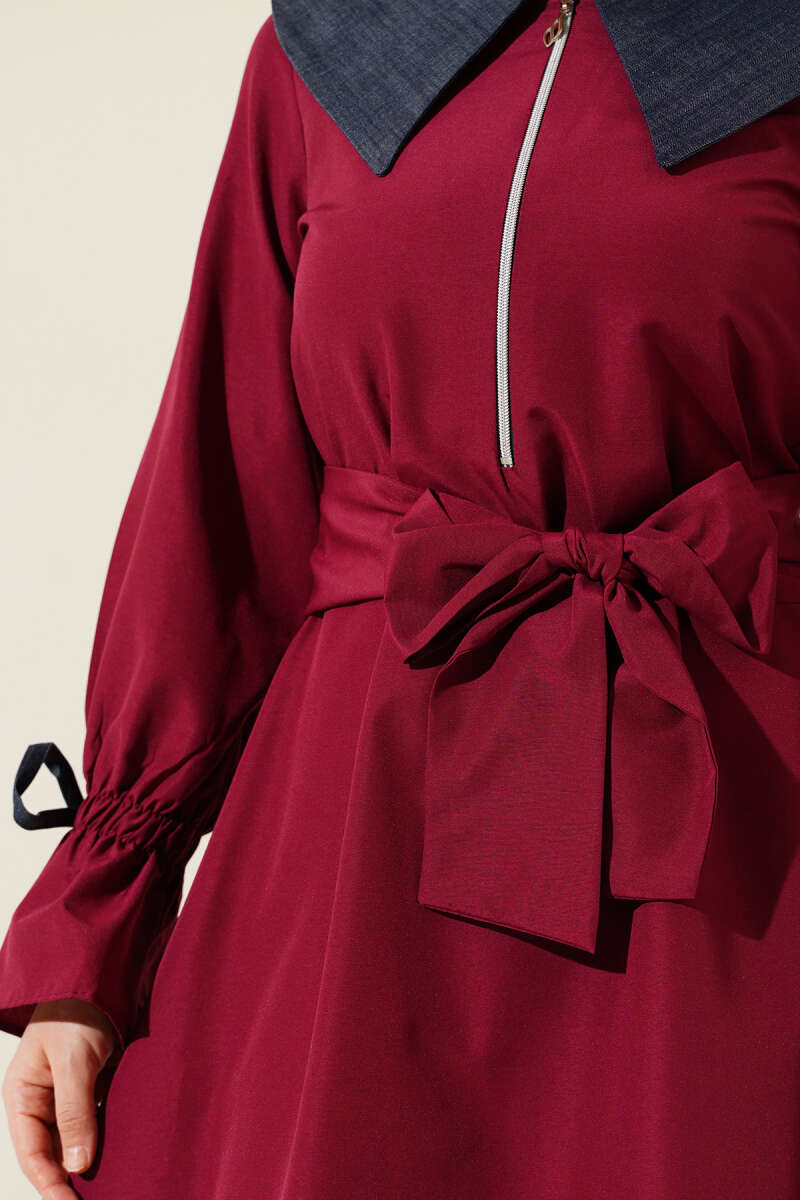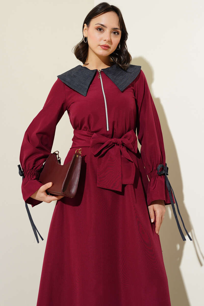 Ekose Desenli Kemerli Elbise Bordo