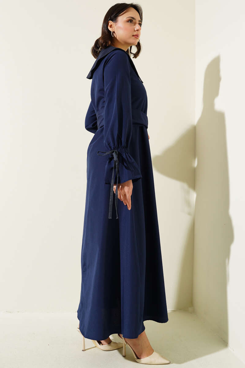 Metal Düğme Süslemeli Bağcıklı Elbise Siyah