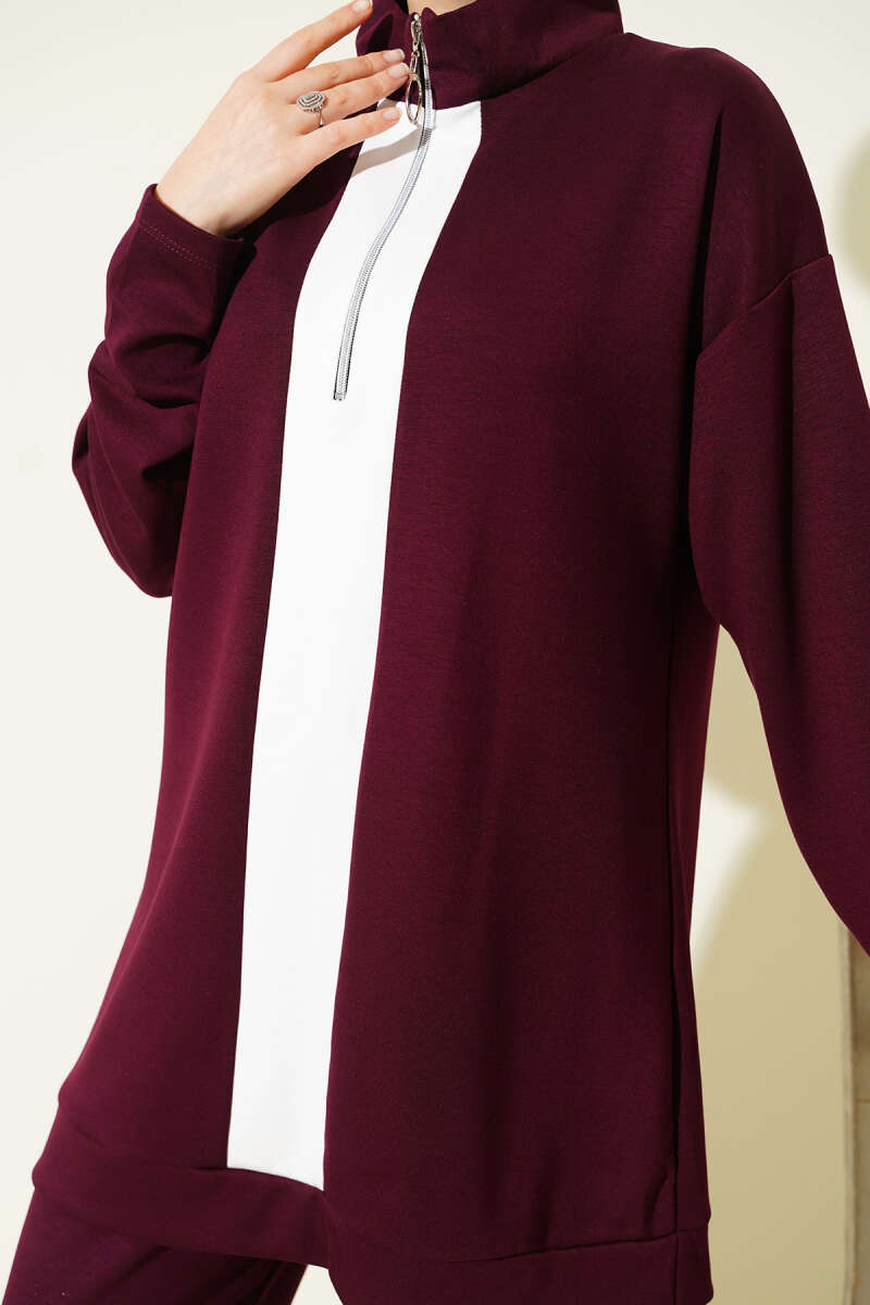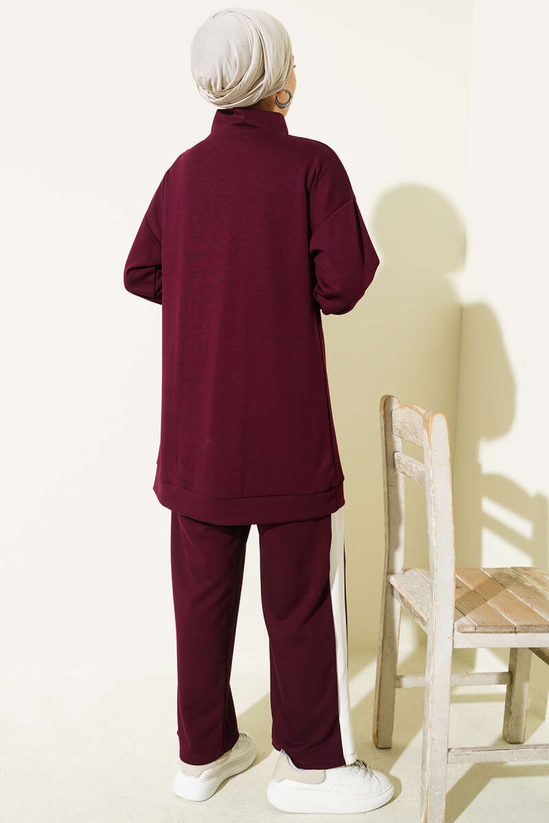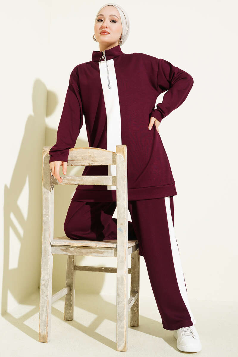 Yarım Fermuarlı Loyşa Şeritli İkili Takım Kahve