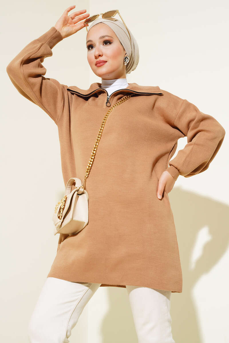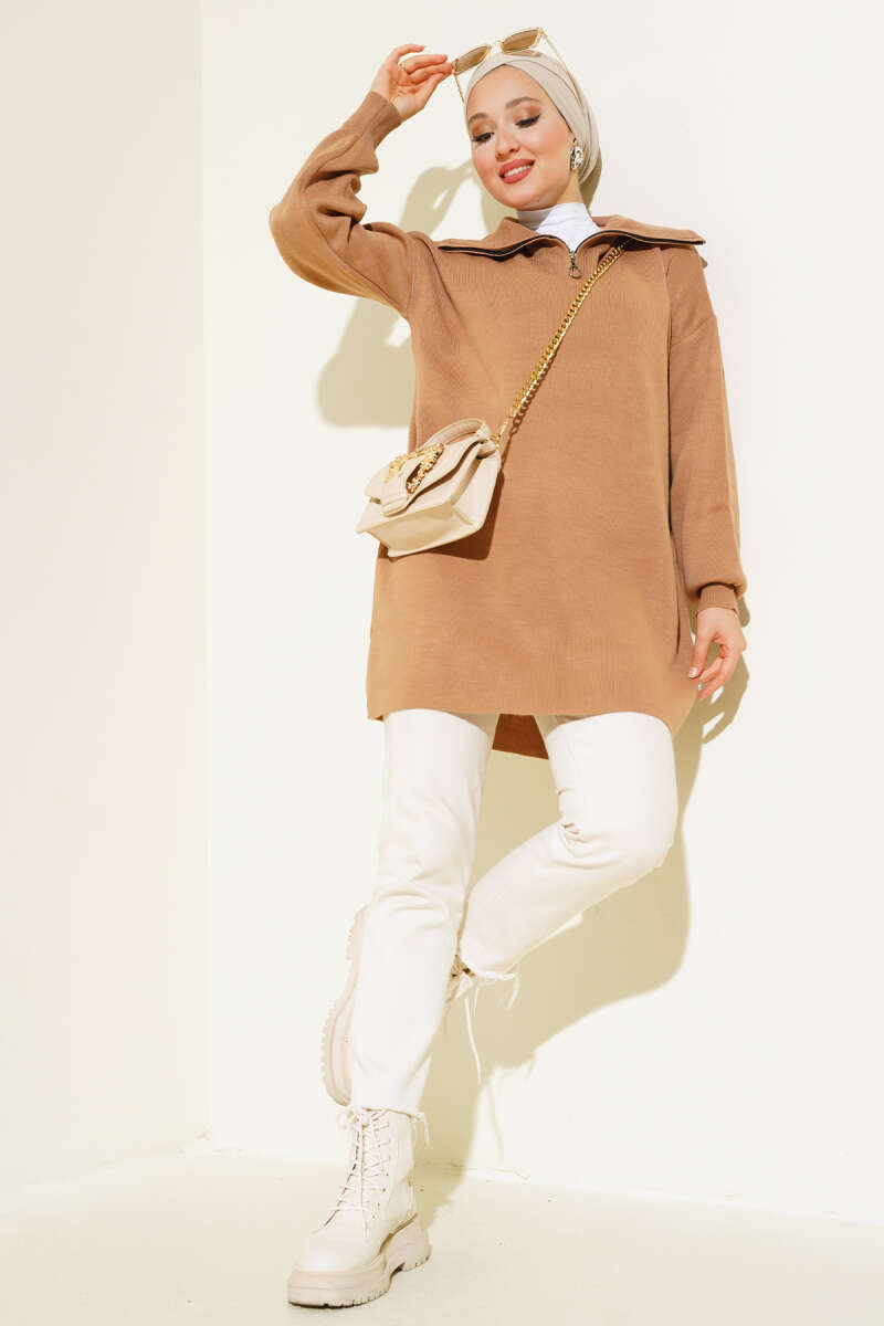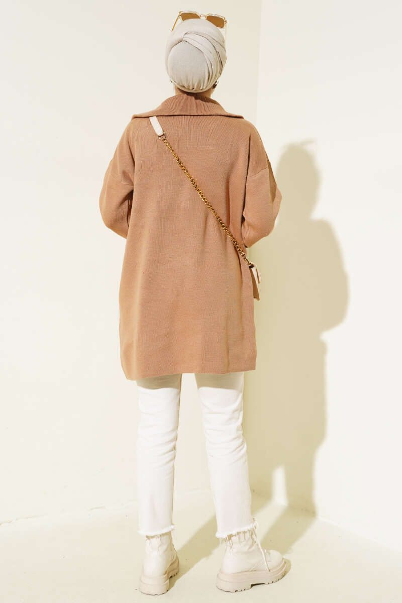 Dik Yaka Fermuarlı Triko Hırka Kahve