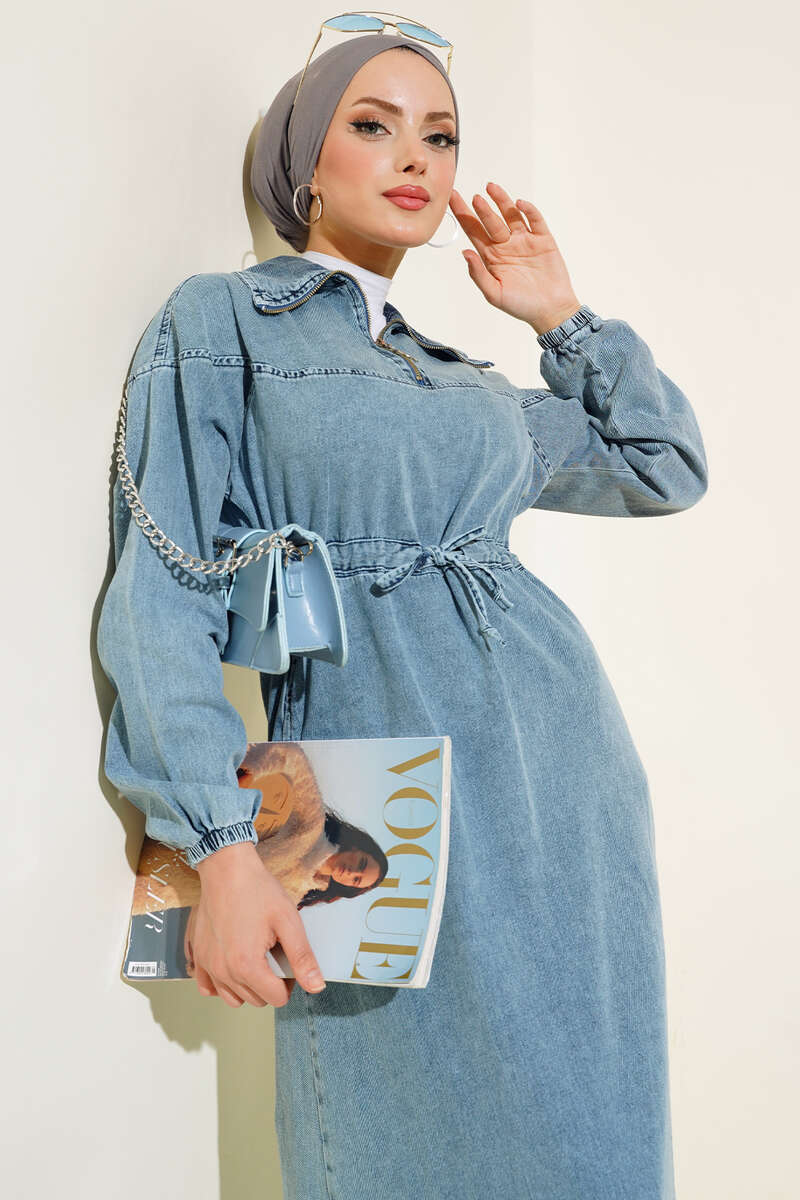 Yeni sezon kot elbise modelimiz sizlerle beraber. Elbisemizin yakası yarım fermuarlıdır. Kol bilekleri lastiklidir. Elbisemizin beli tünelli olup, ip bağcıklıdır. İki adet cebi vardır. Astarsızdır. Hem şık hem sportif tasarımlı elbisemiz tam size göre.