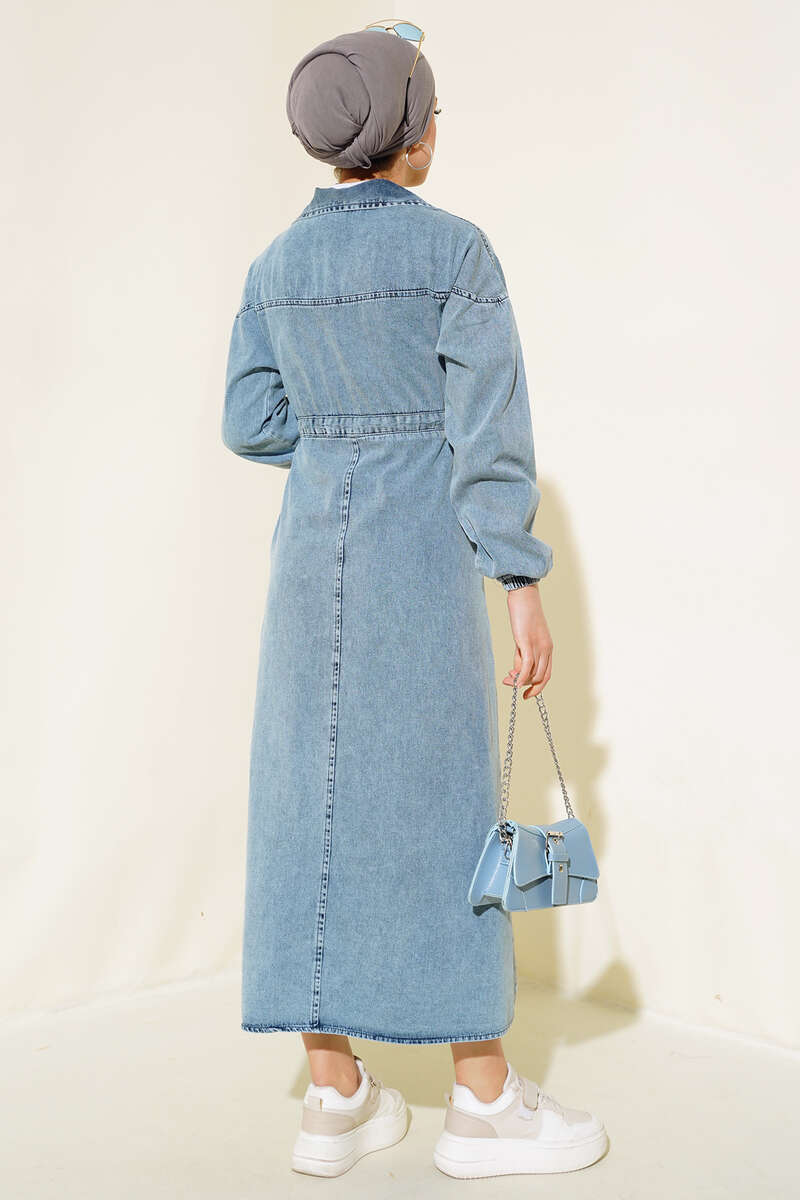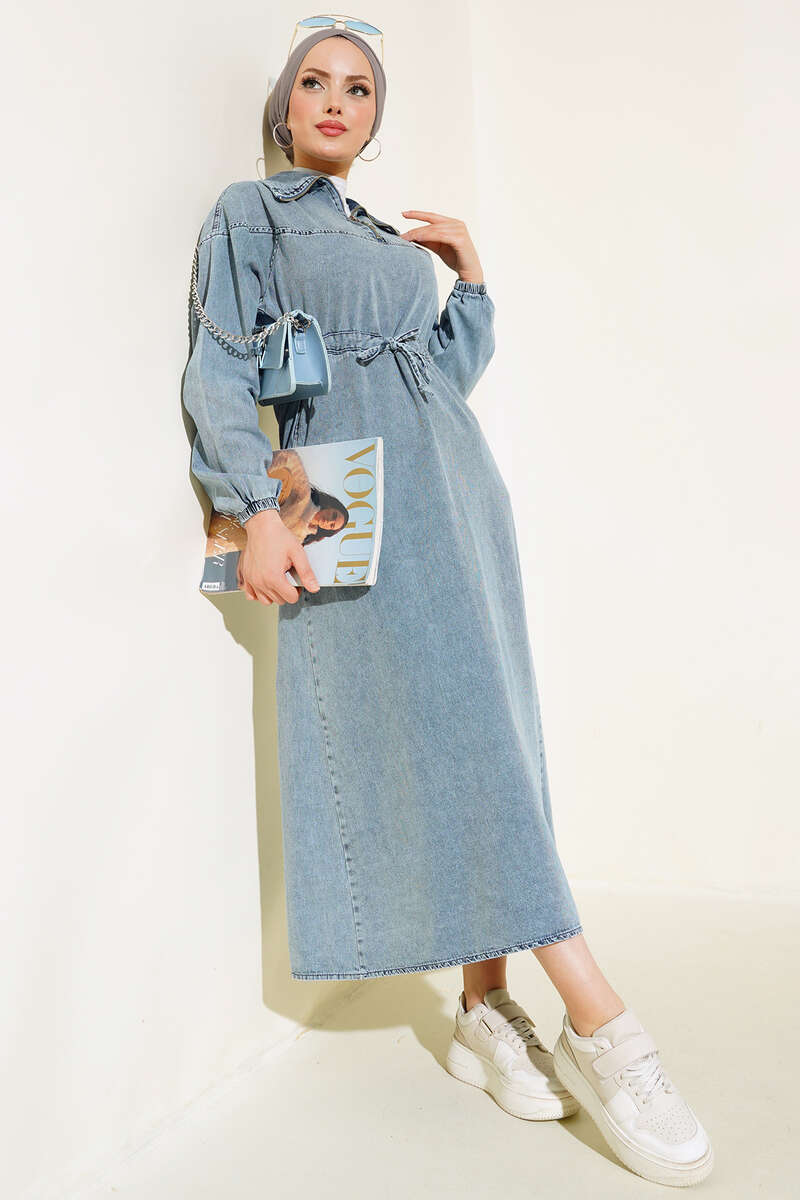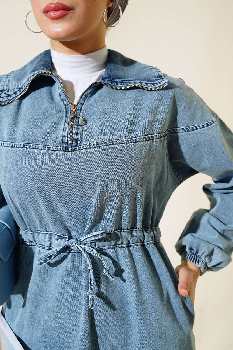 Yeni sezon kot elbise modelimiz sizlerle beraber. Elbisemizin yakası yarım fermuarlıdır. Kol bilekleri lastiklidir. Elbisemizin beli tünelli olup, ip bağcıklıdır. İki adet cebi vardır. Astarsızdır. Hem şık hem sportif tasarımlı elbisemiz tam size göre.