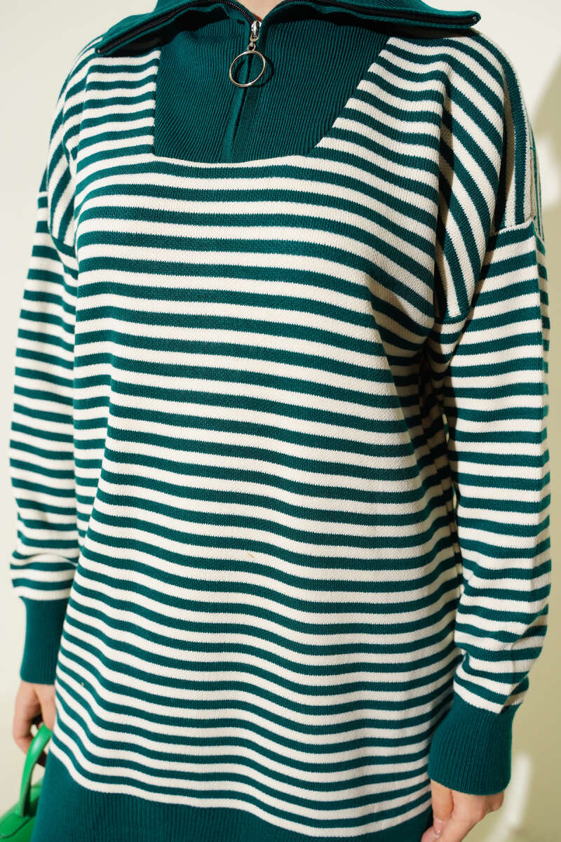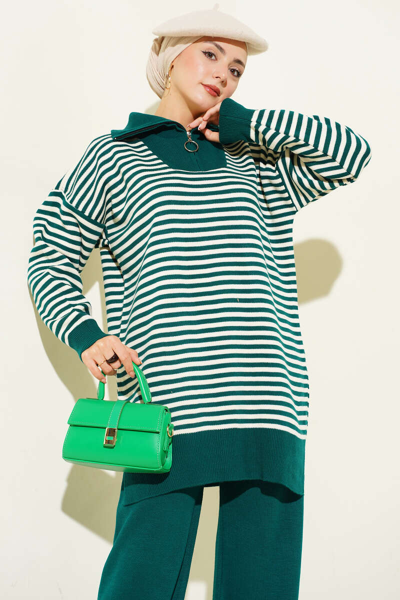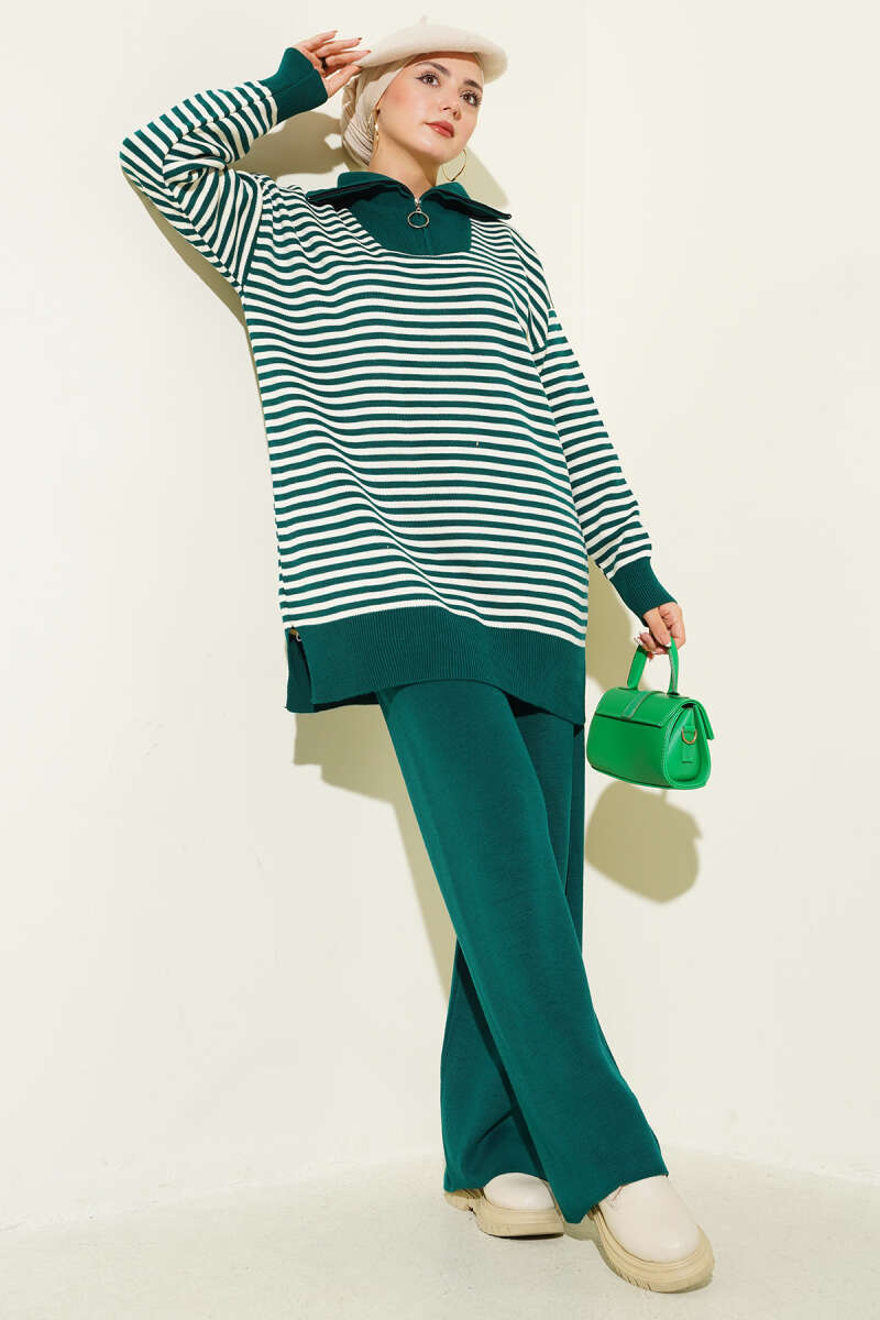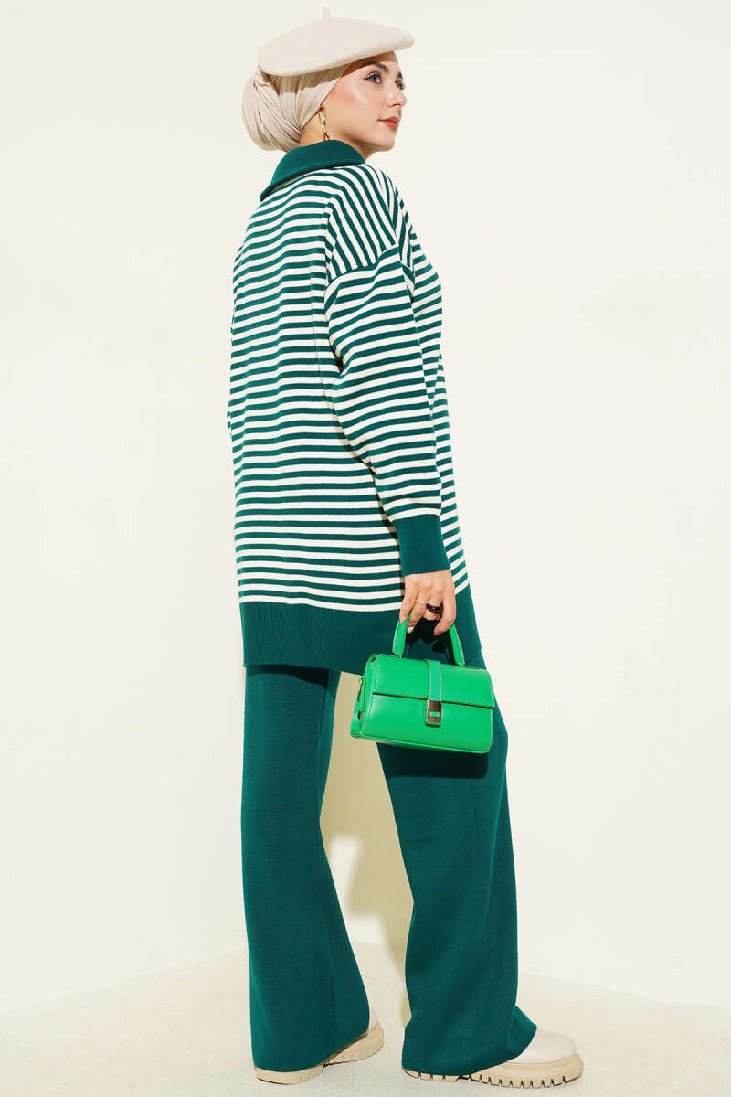 Şerit Detaylı Düğmeli Triko İkili Takım Zümrüt