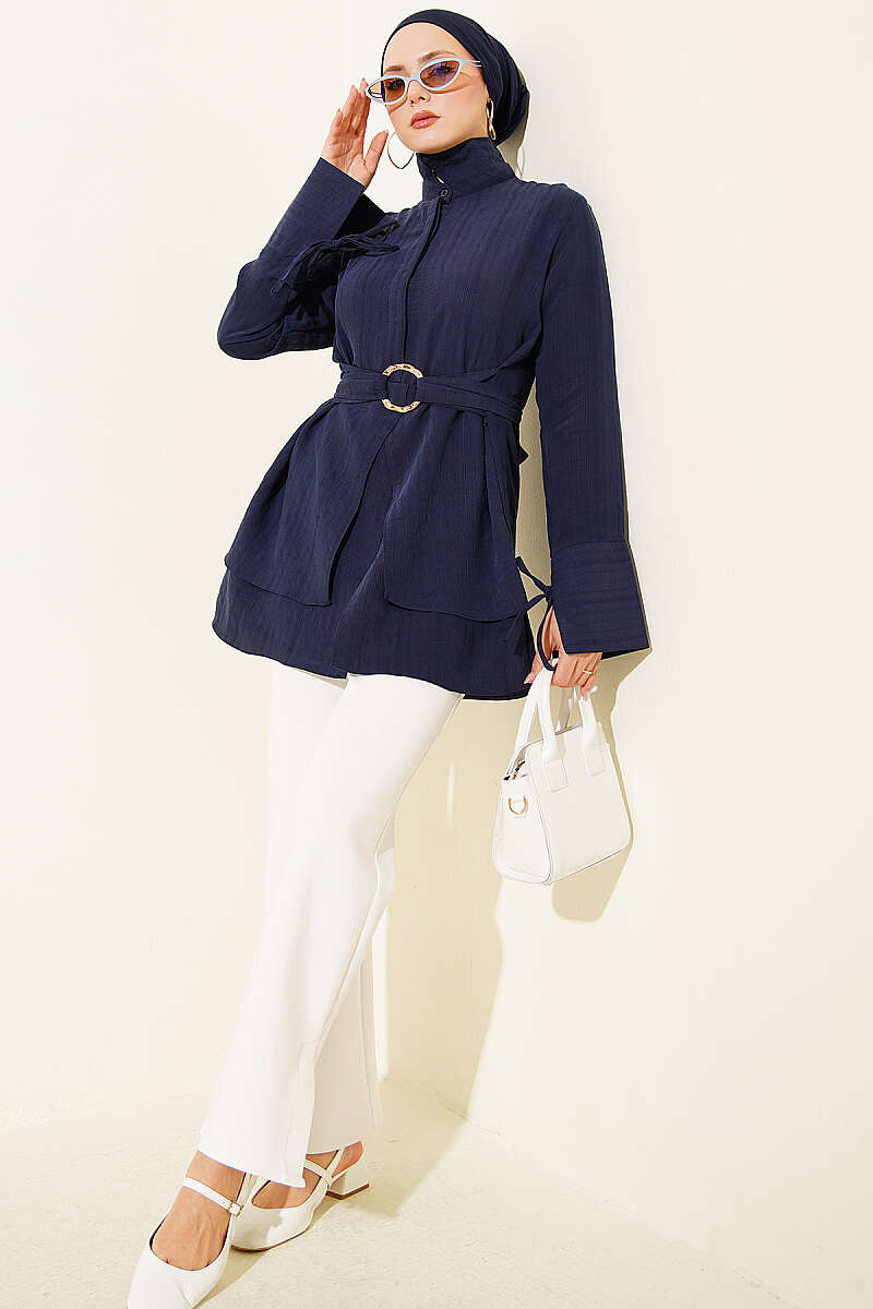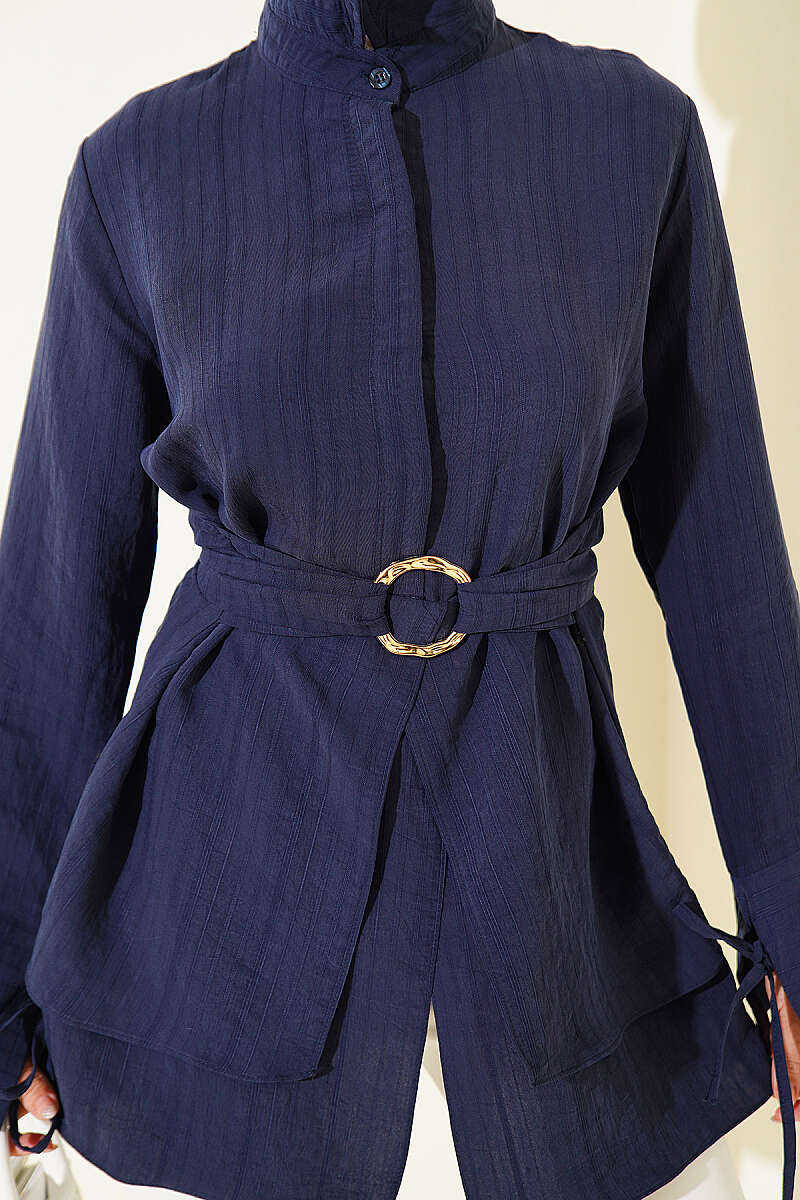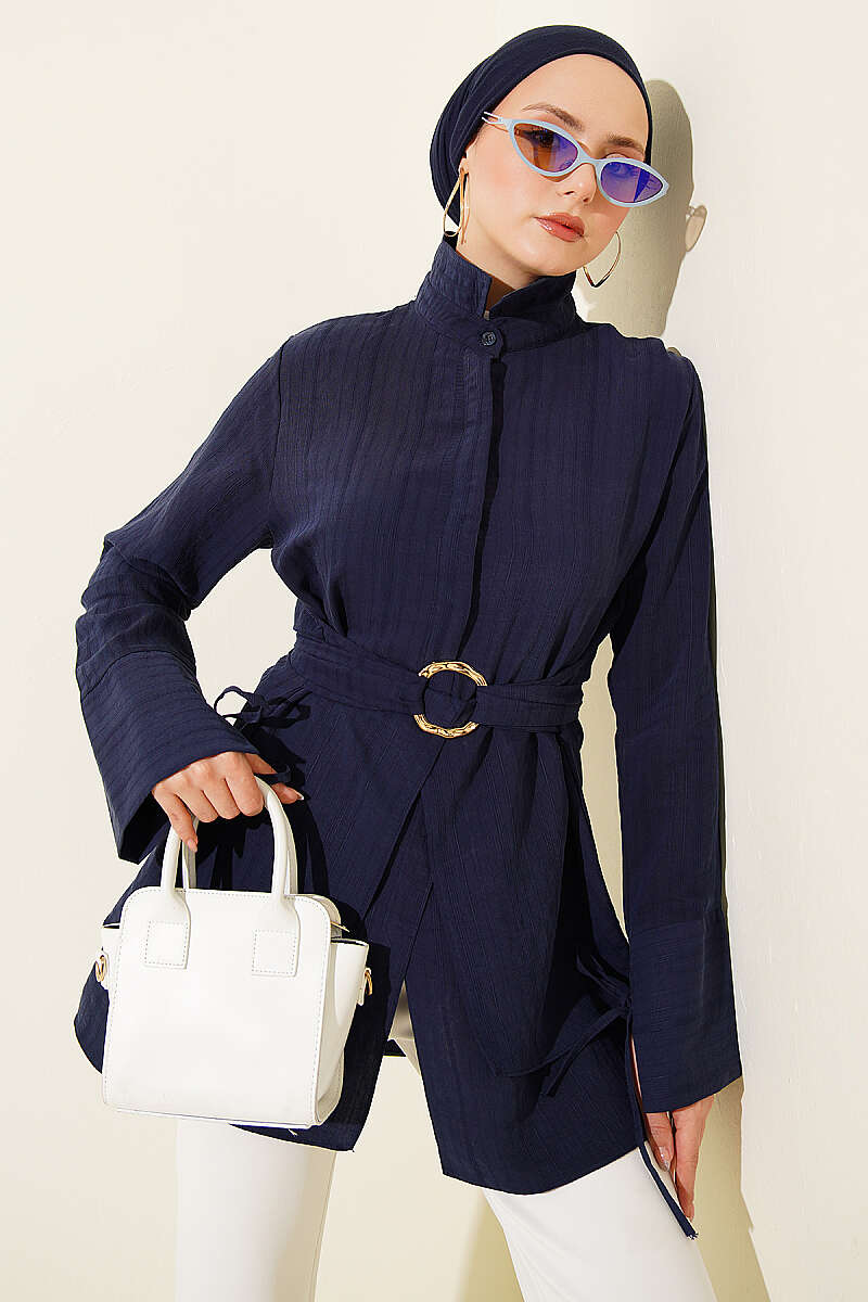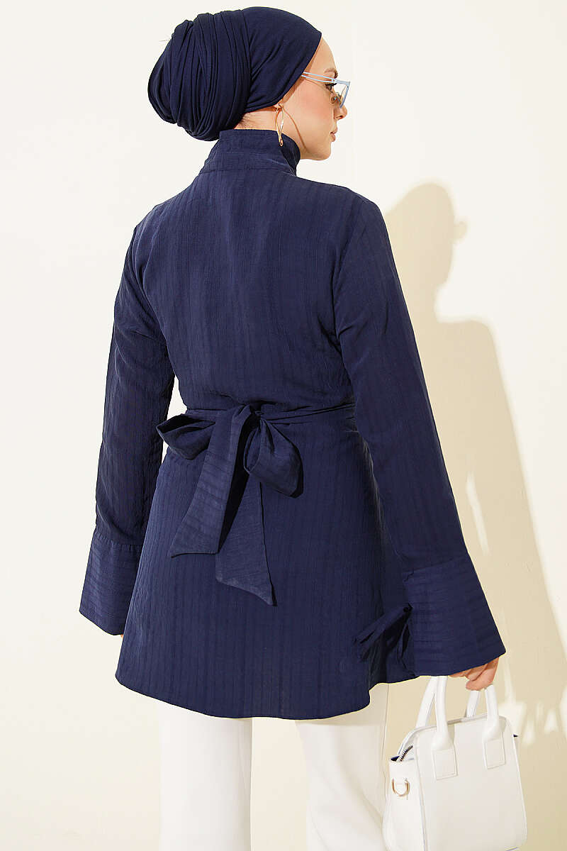 Yarım Gizli Düğmeli Bağlamalı Tunik Lacivert