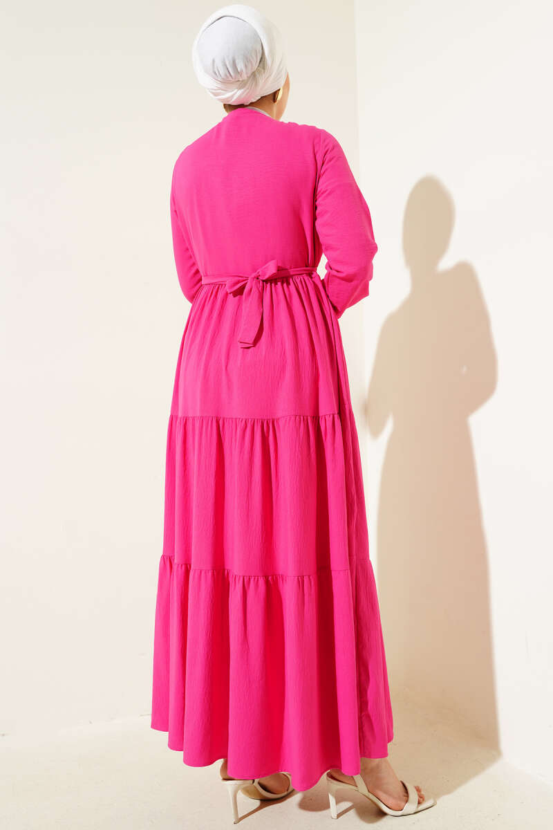 Boydan Düğmeli Pensli Kuşaklı Elbise Bordo