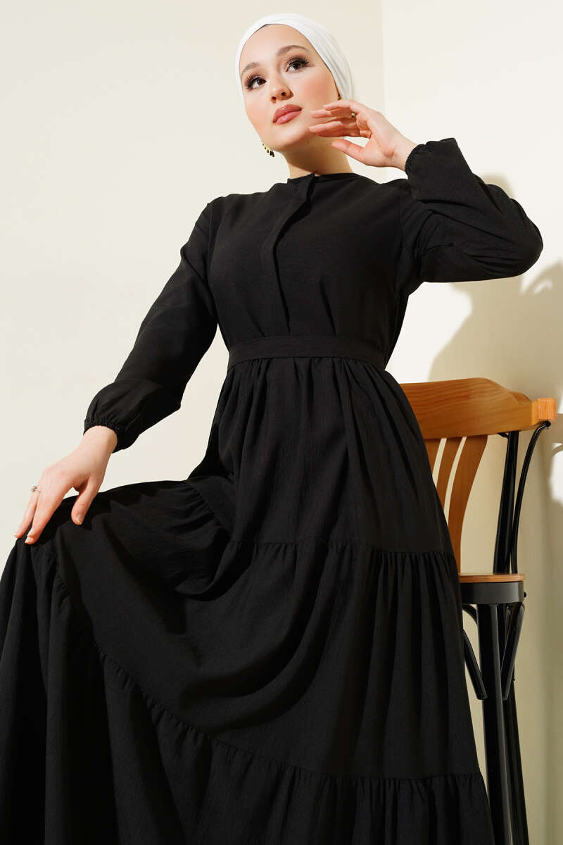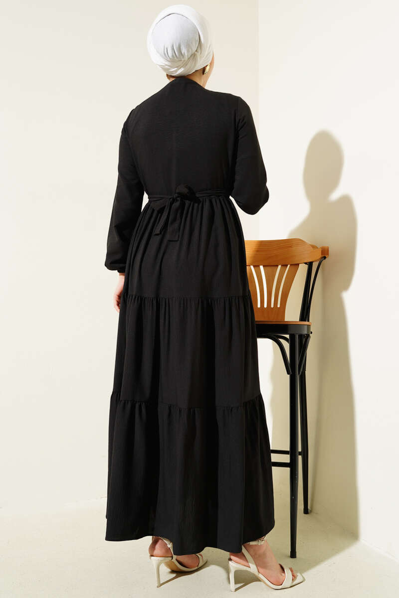 Boydan Düğmeli Pensli Kuşaklı Elbise Siyah