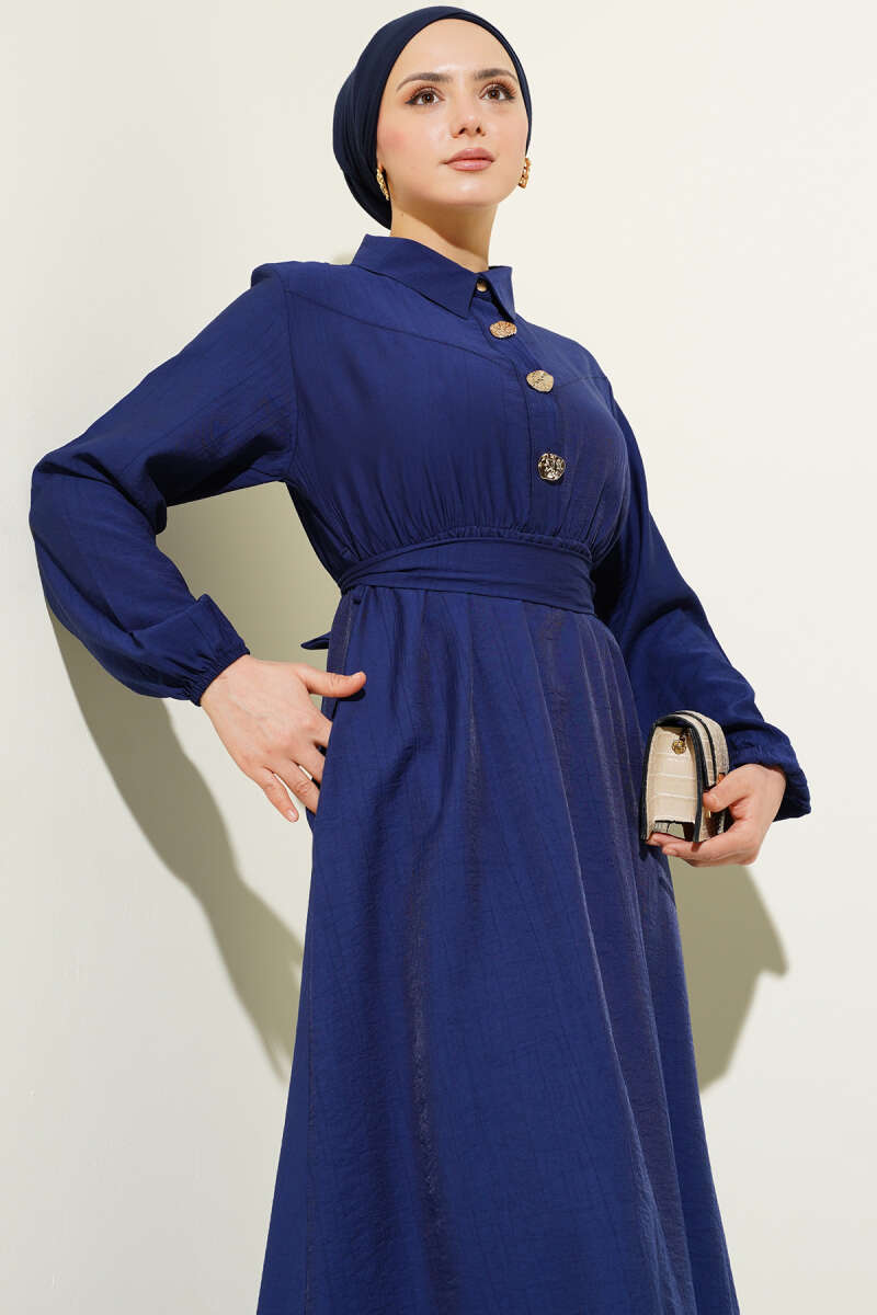 Metal Düğmeli Kolsuz Kot Elbise Lacivert