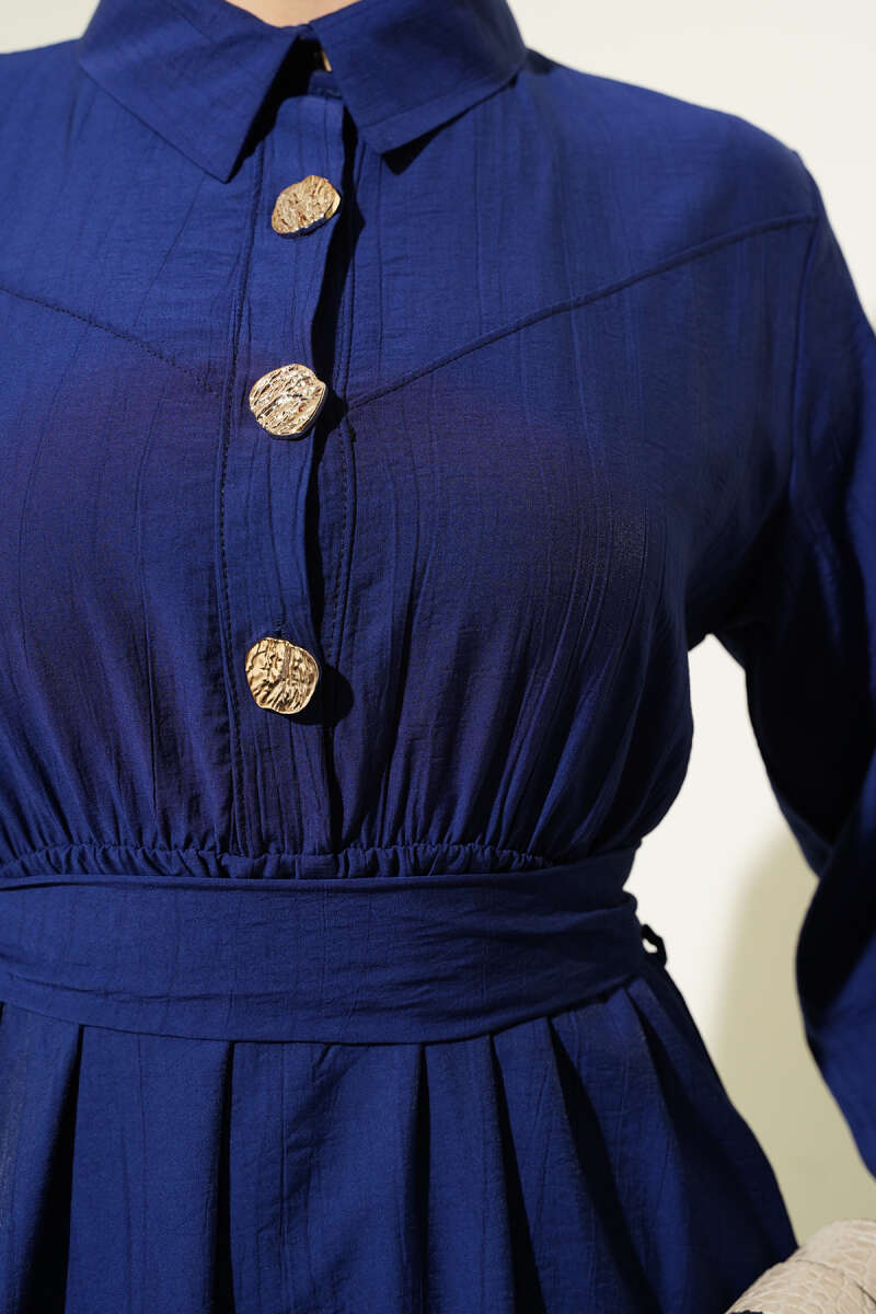 Metal Düğmeli Kolsuz Kot Elbise Koyu Mavi