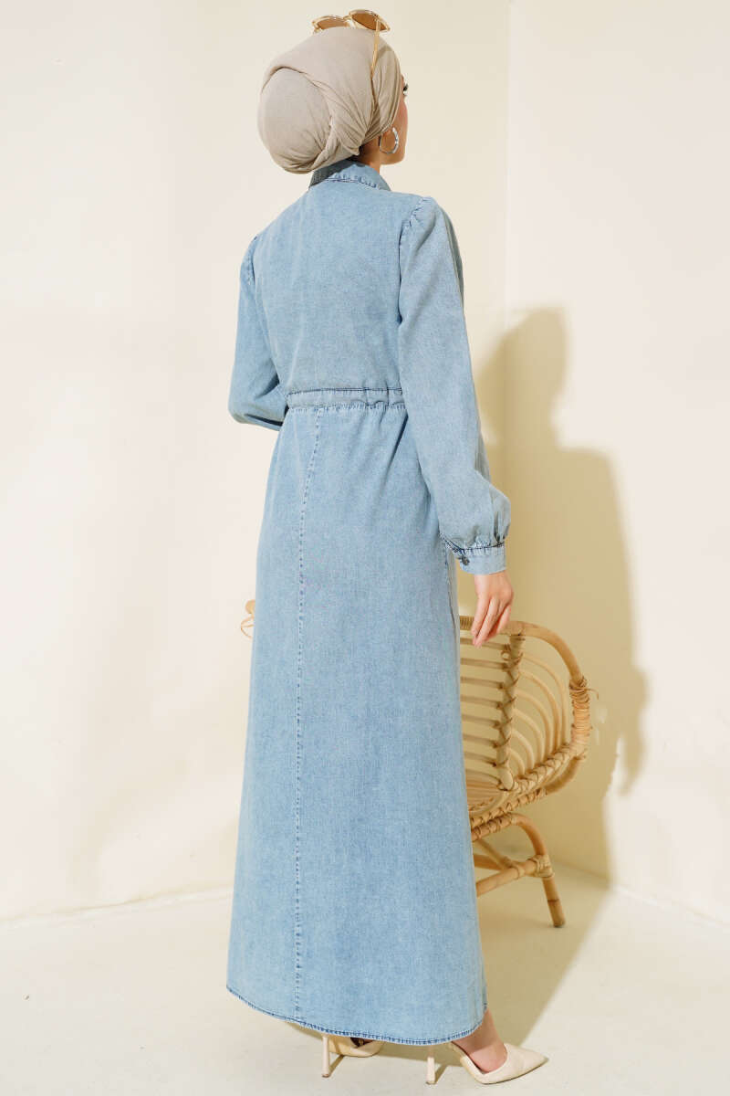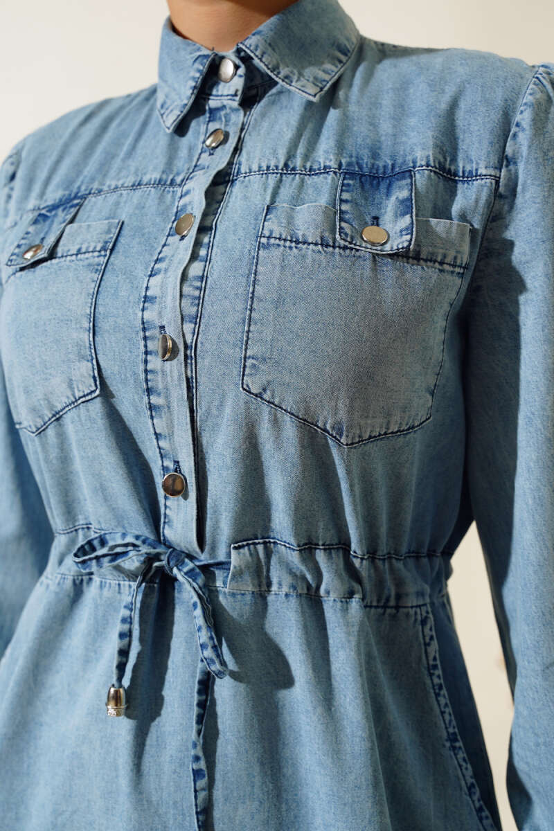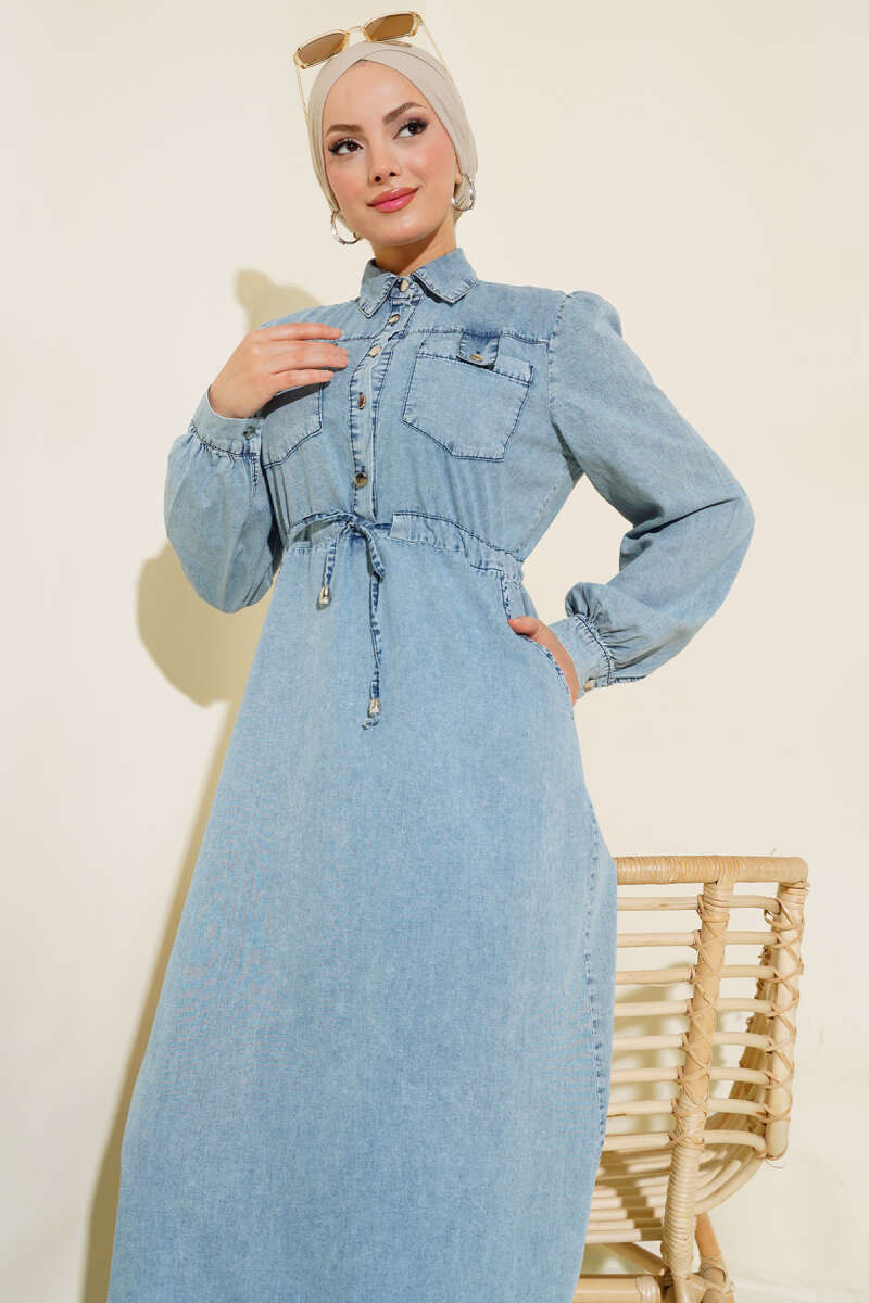 Yeni sezon kot elbise modelimiz sizlerle beraber. Elbisemizin beli tünelli ve ip bağcıklıdır. Göğsünde iki adet cebi vardır. Gömlek yakalıdır. Elbisemizin önü yarım metal düğmelidir. Yanları ceplidir. Astarsızdır. Kol bilekleri manşetli ve düğmelidir. Elbisemiz hem şık hem sportif modeliyle sizleri bekliyor.