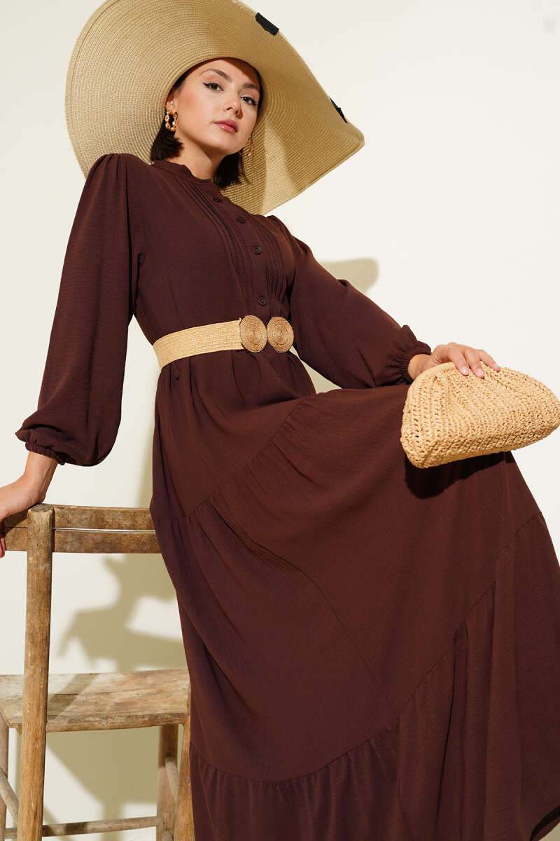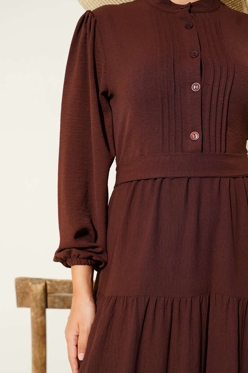 Pelerin Detaylı Pileli Triko Elbise Kahve