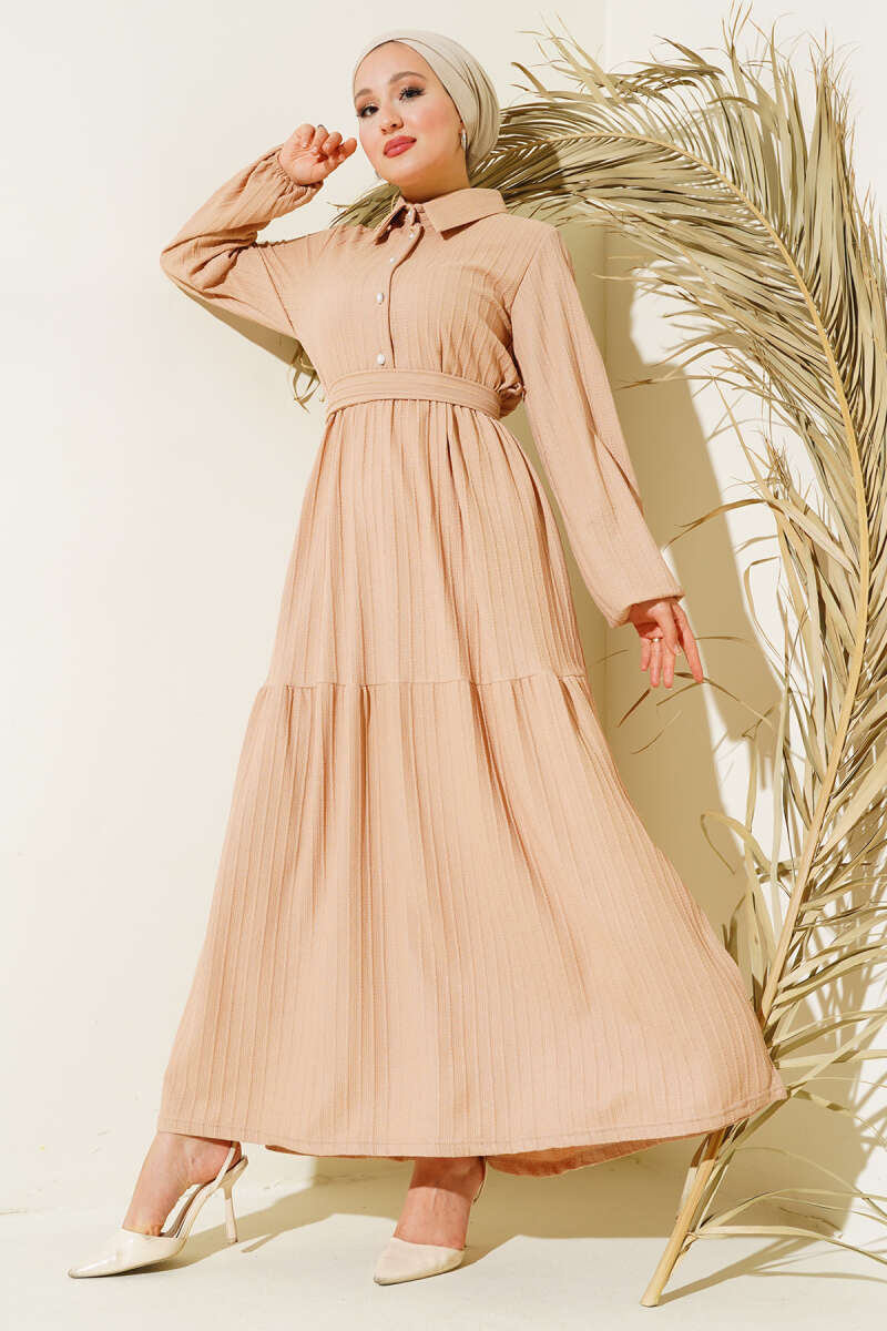 Yarım Taş Düğmeli Elbise Bej