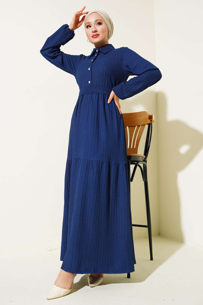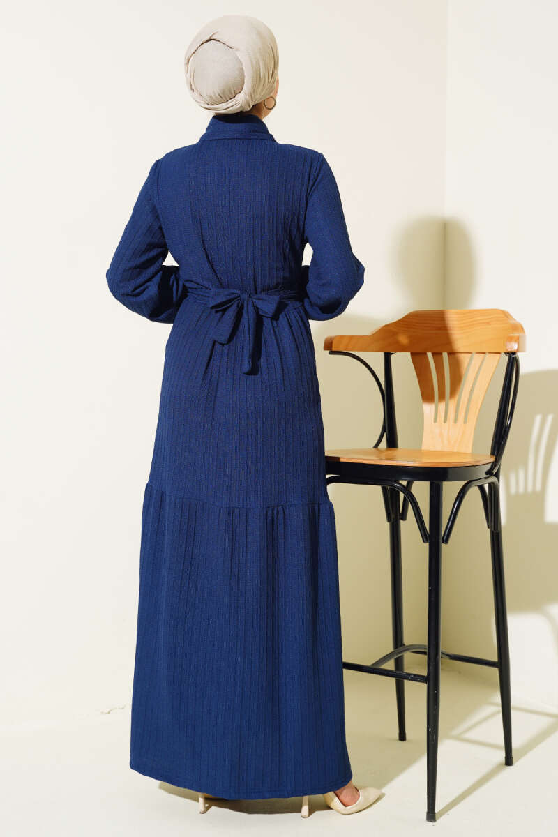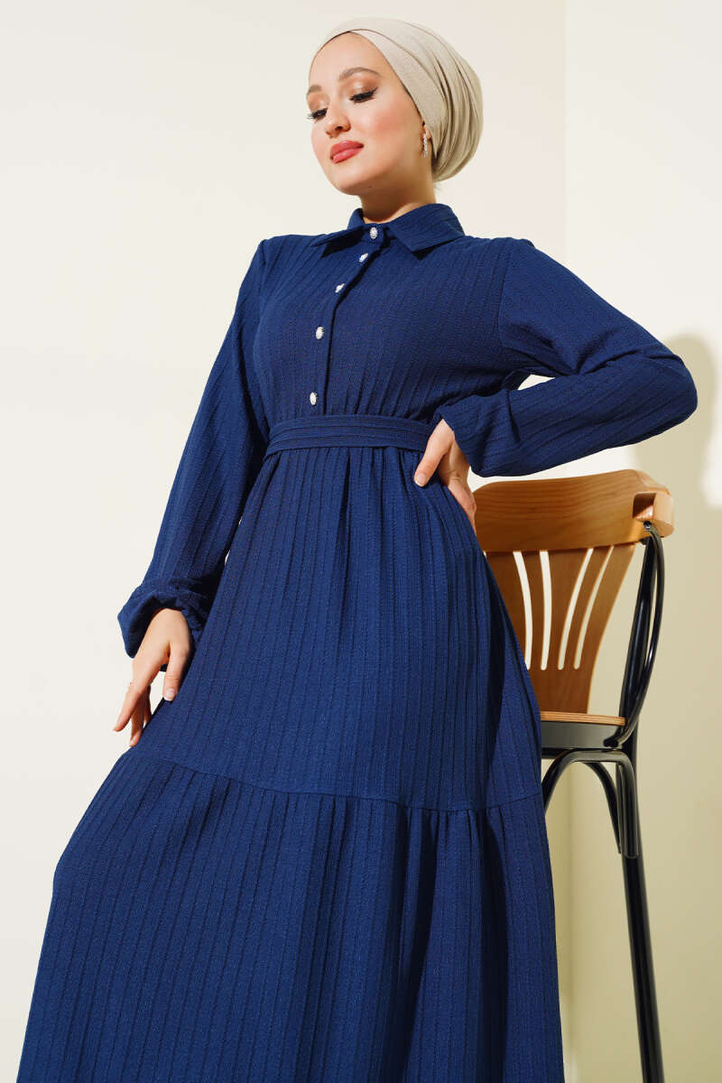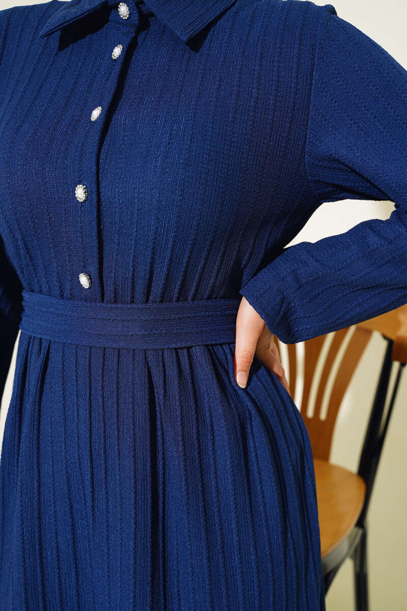 Düğmeli Tensel İnce Kemerli Elbise Lacivert
