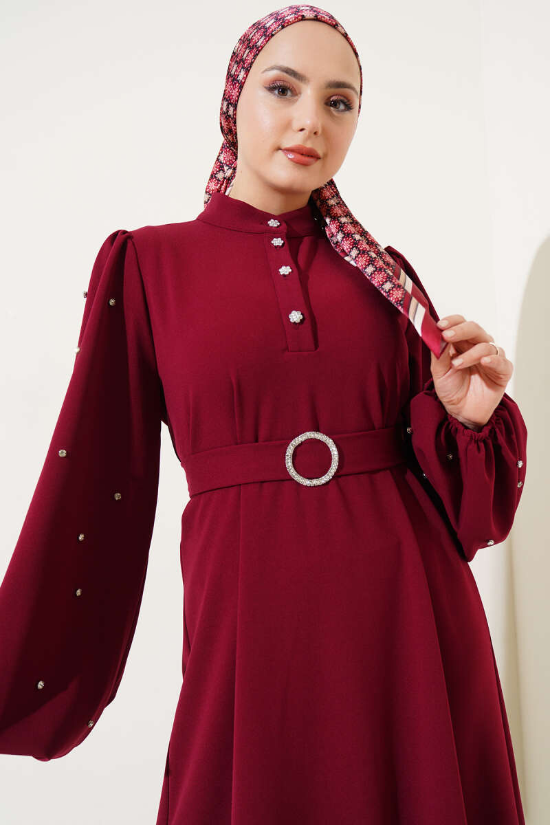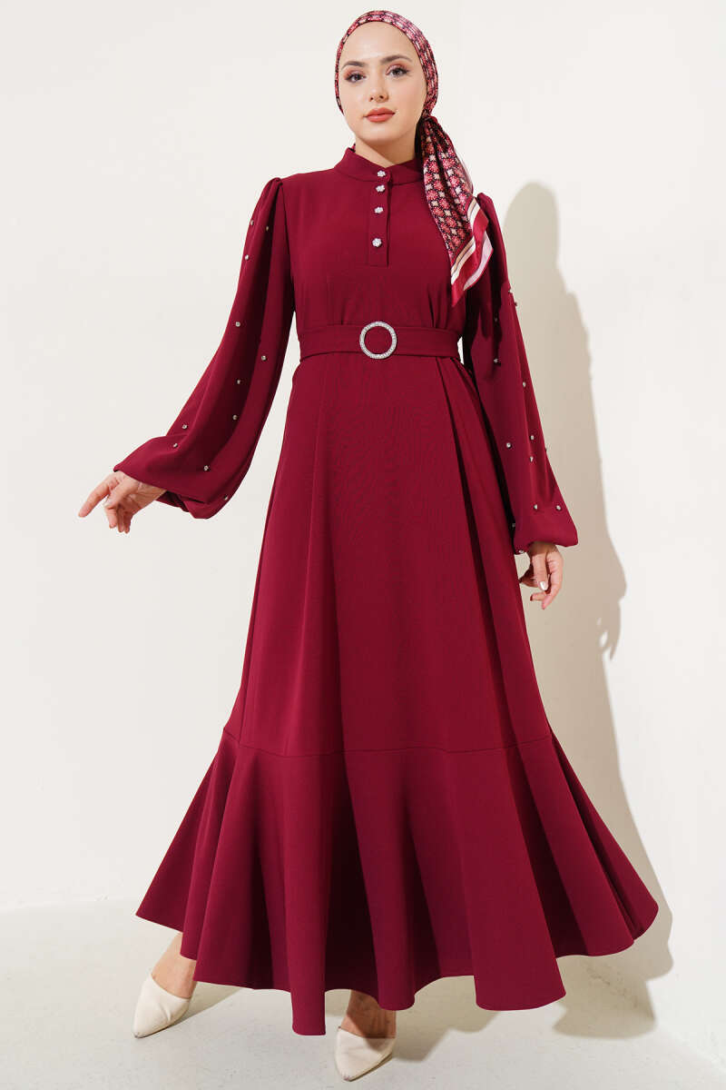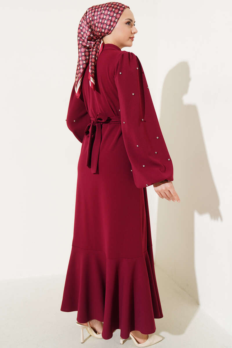 Omuz Pelerinli Taş Detaylı Abiye Elbise Bordo