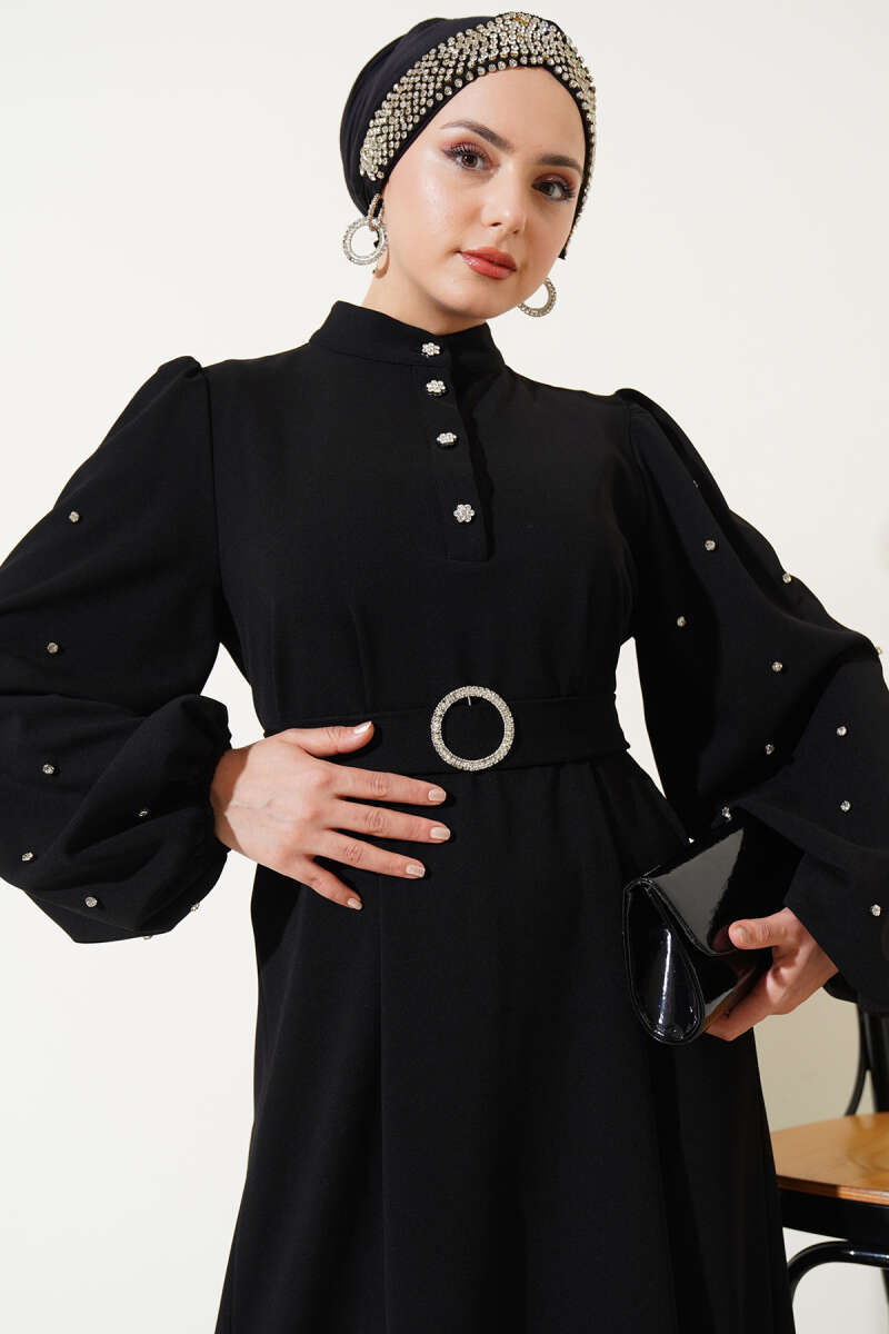 Omuz Pelerinli Taş Detaylı Abiye Elbise Siyah