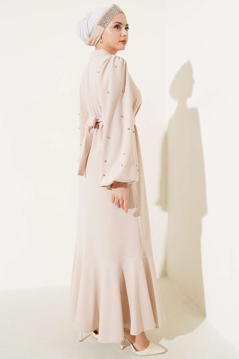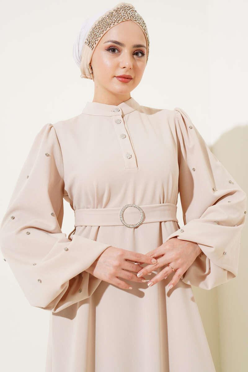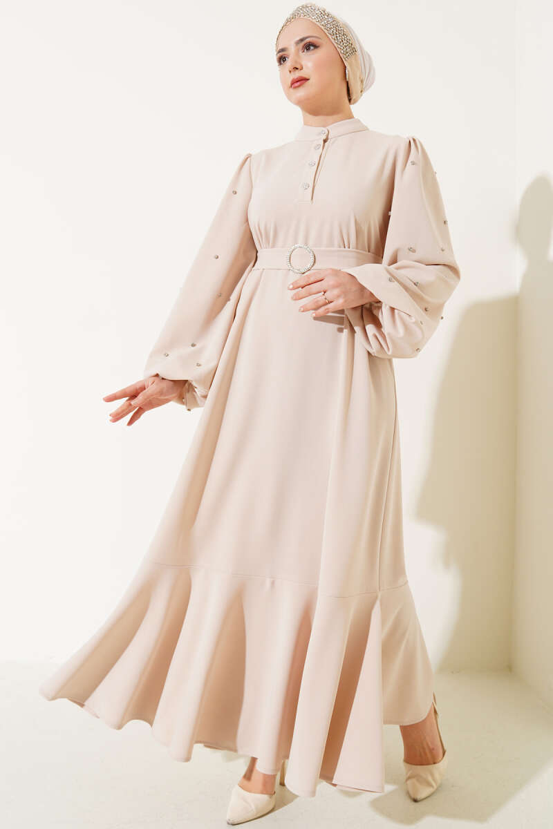 Yarım Taş Düğmeli Volanlı Elbise Taş