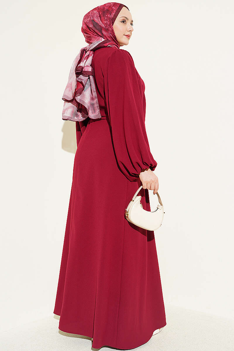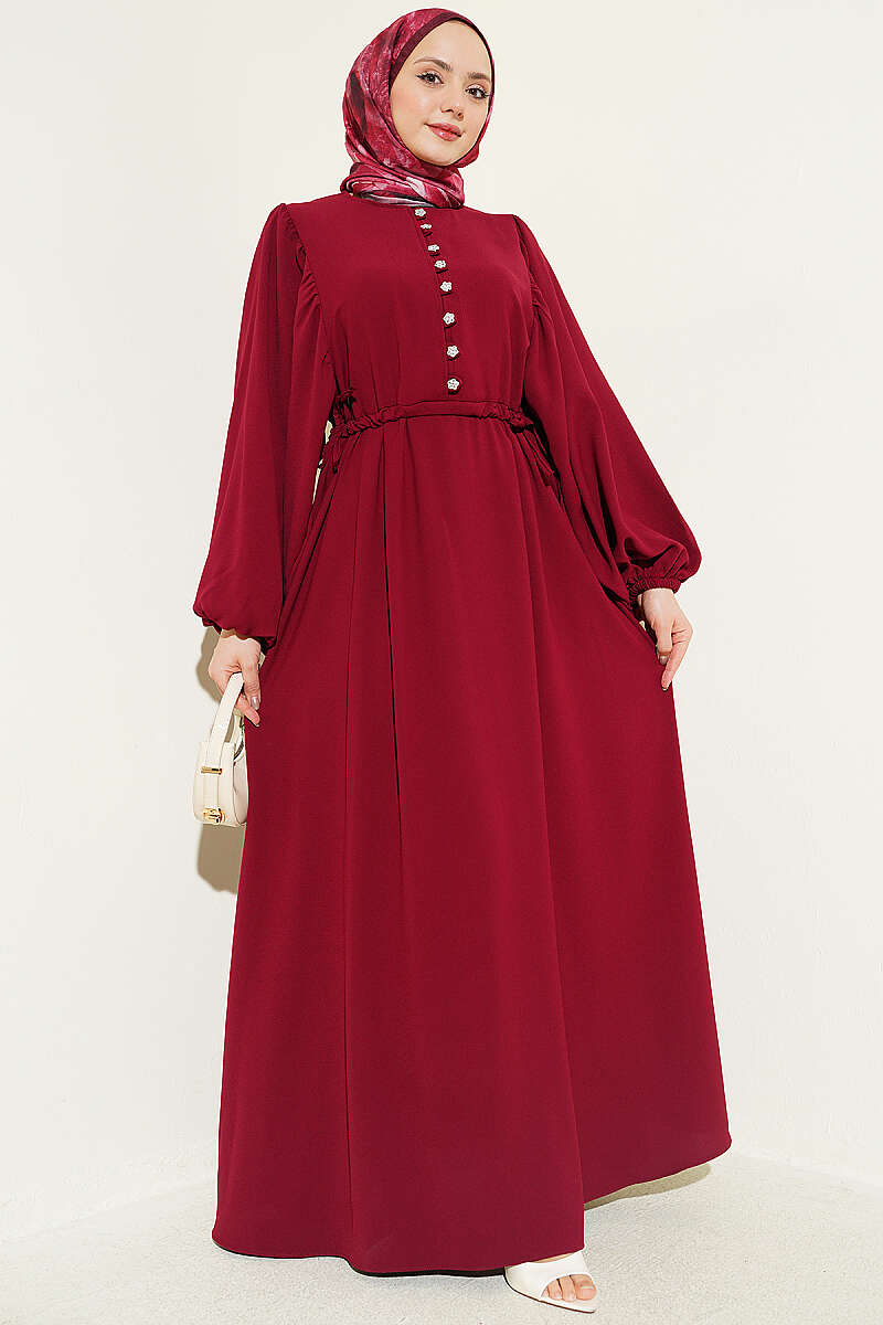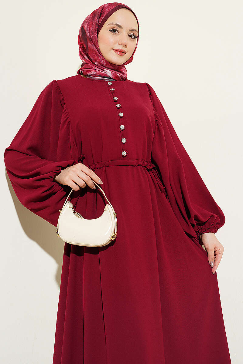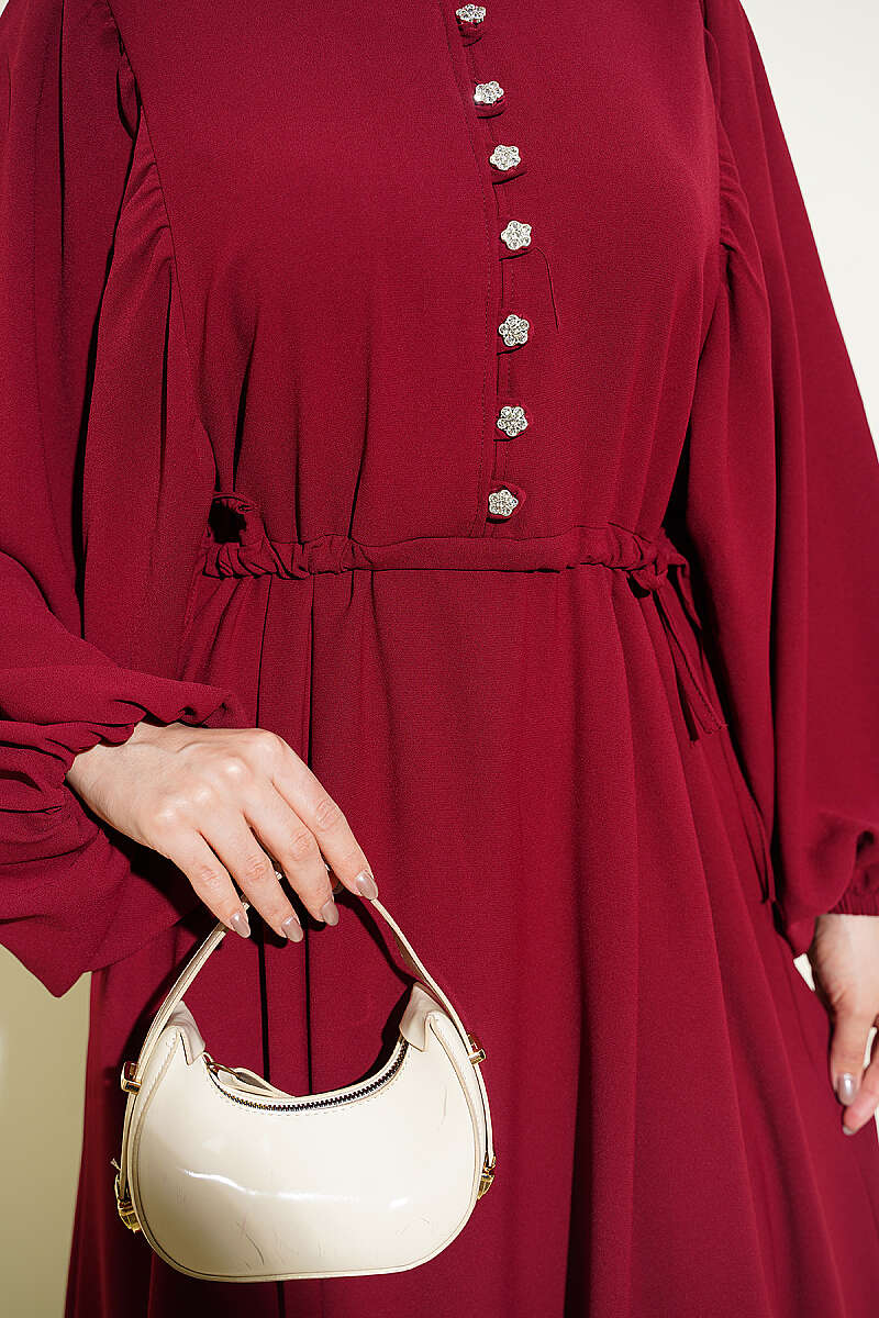 Yarım Taş Düğmeli Yan Bağcıklı Elbise Bordo