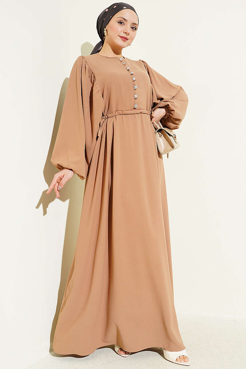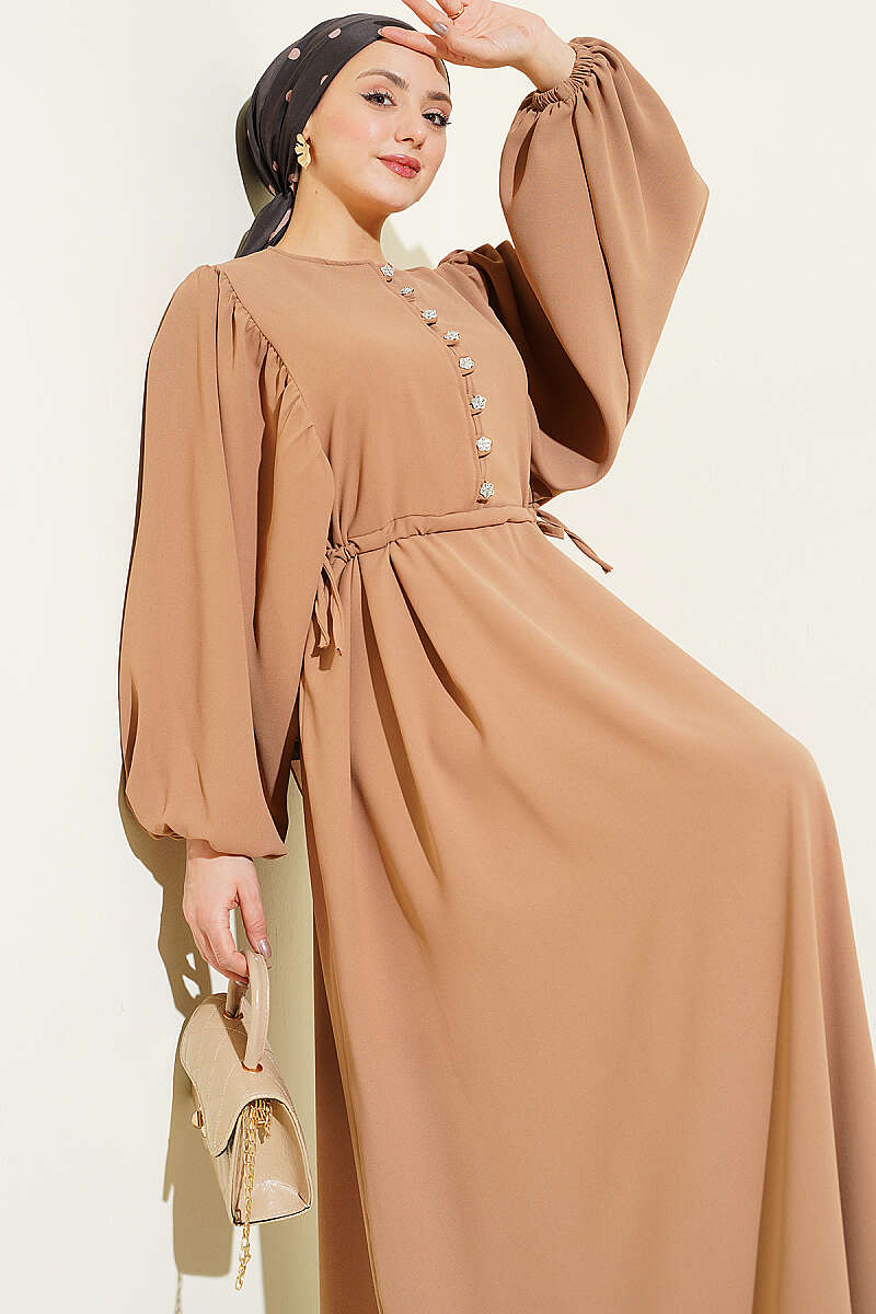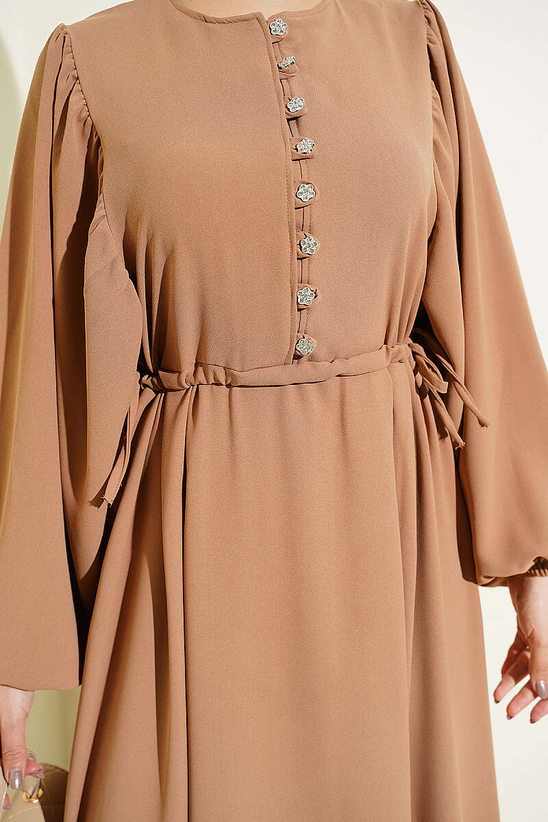 Yarım Taş Düğmeli Yan Bağcıklı Elbise Kum Bej