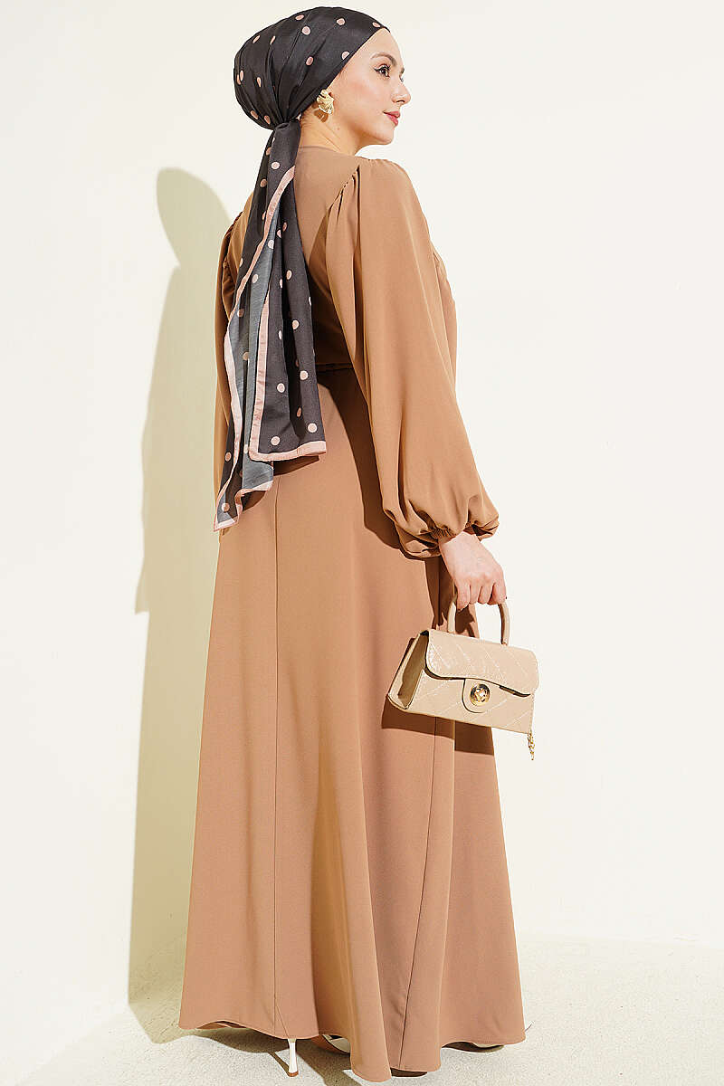 Bu elbise, göğüs kısmındaki zarif yarım taş düğme detayları ve modern kesimiyle özel günlerinizde asil bir şıklık sunar. Yan kısımlarda bulunan ayarlanabilir bağcık detayları, bel formunu dilediğiniz gibi vurgulamanıza olanak tanırken elbiseye hareketli ve özgün bir hava katar. Hacimli balon kol yapısı ve dökümlü uzun etek formu, tasarıma feminen bir dinamizm kazandırarak gün boyu konforlu bir kullanım vadeder. Akışkan kumaş dokusu ve sofistike süslemeleriyle, tek parçada zahmetsizce göz alıcı bir stil oluşturmak isteyenler için ideal bir tercihtir.