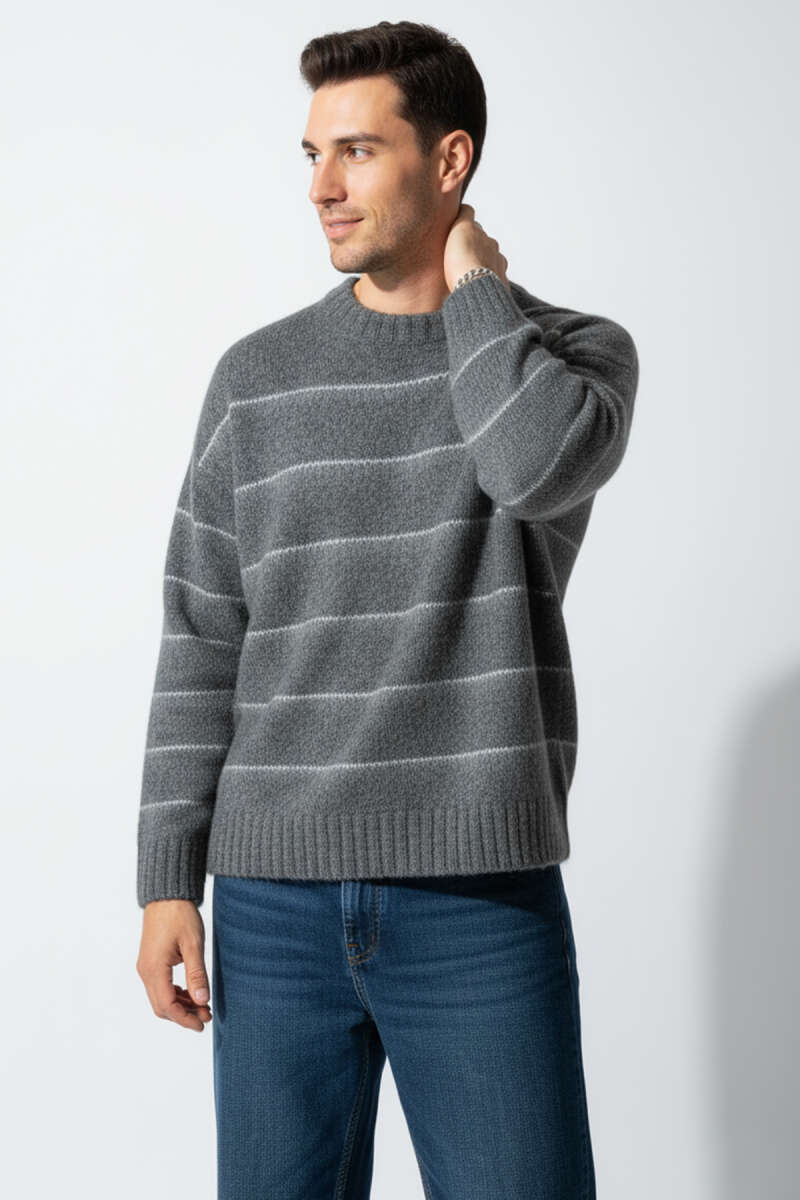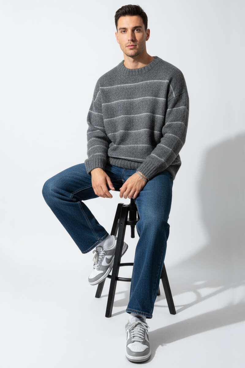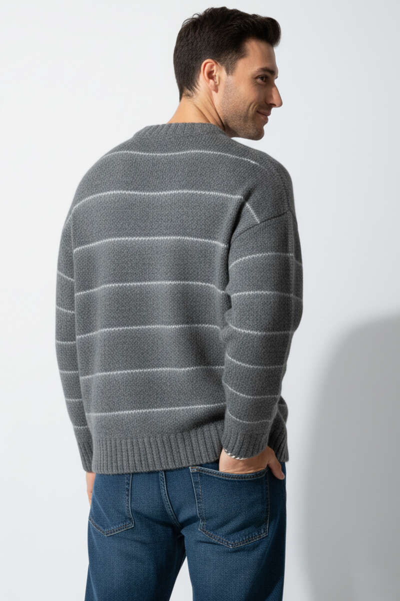 Çizgi Desen Örgü Triko Erkek Kazak Gri