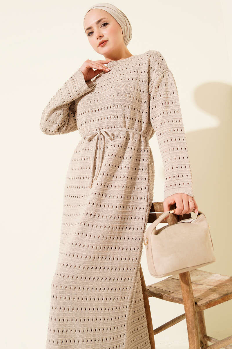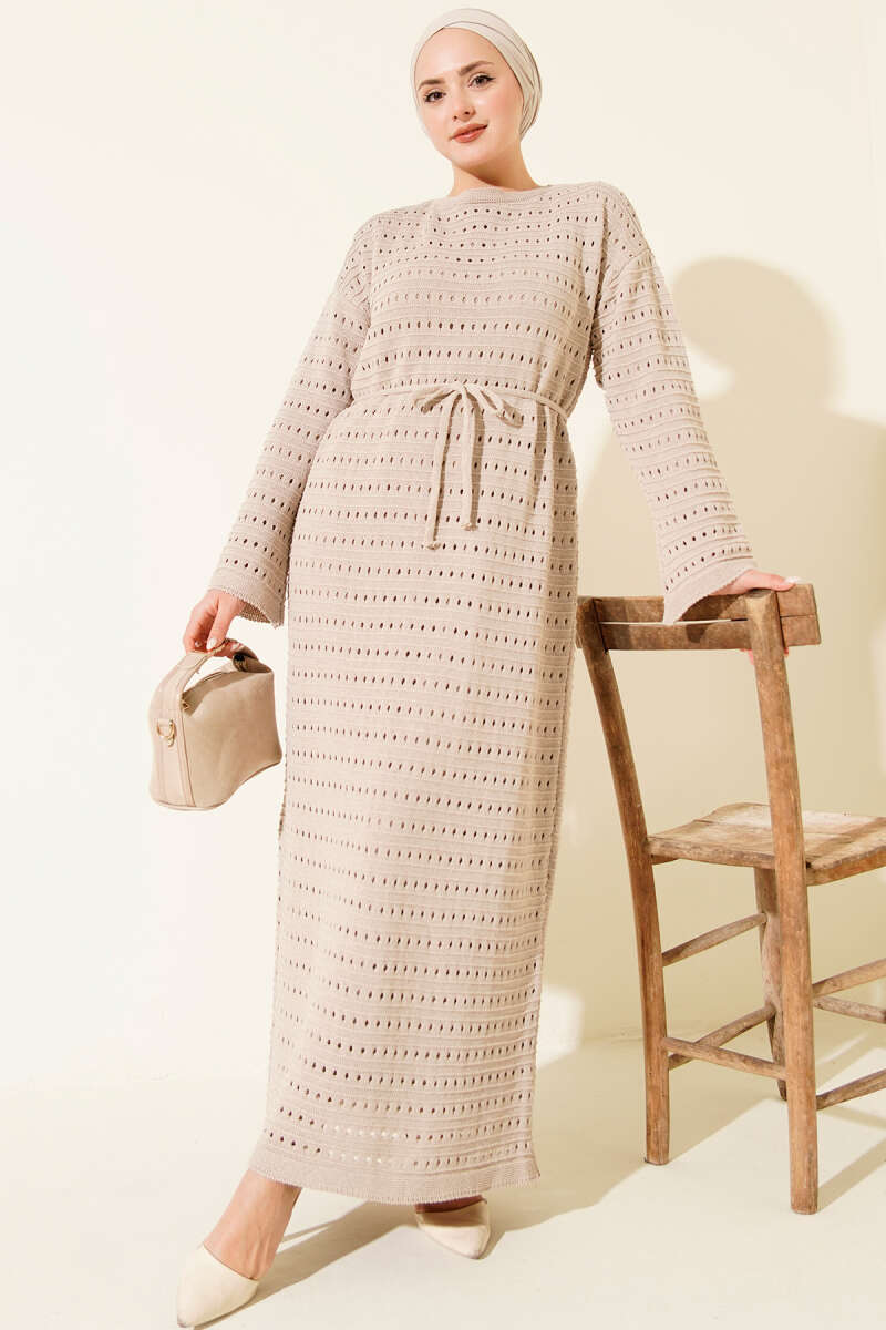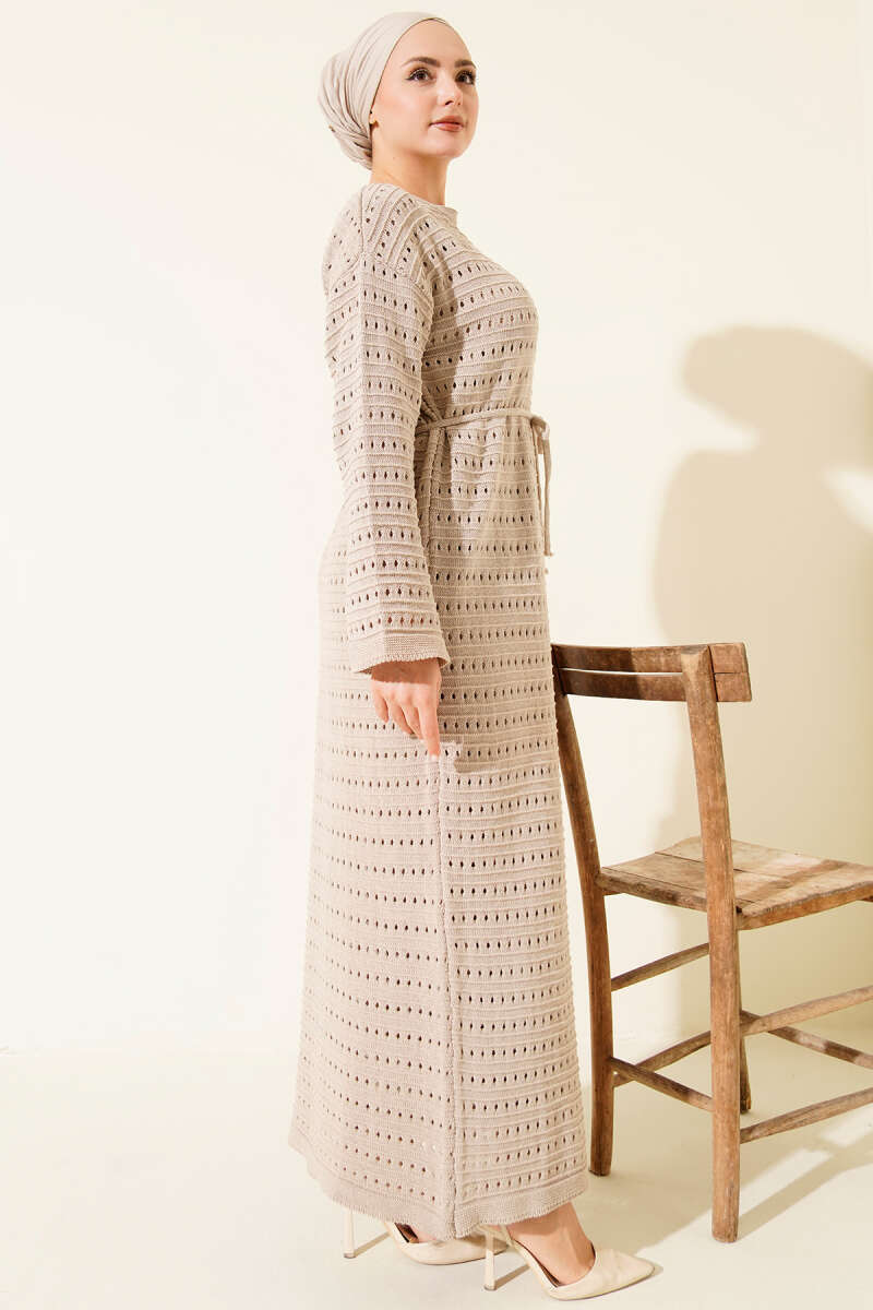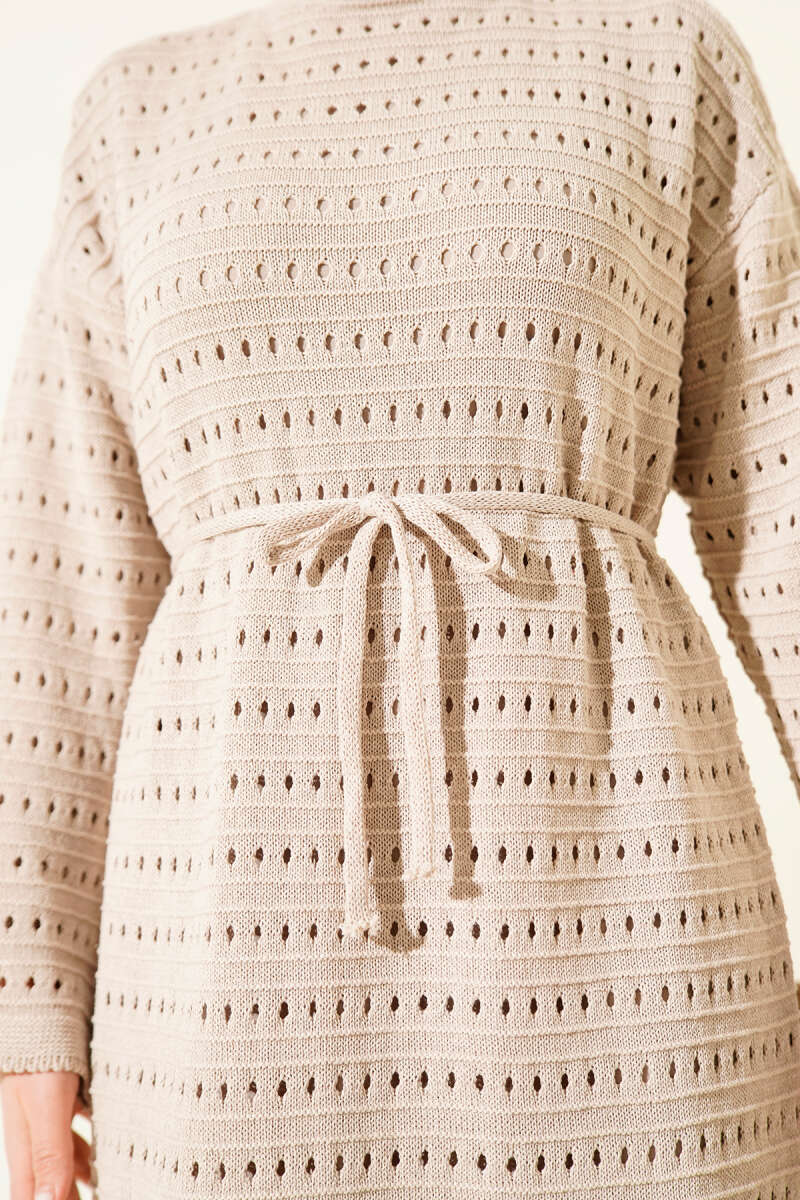 Yatay Ajurlu İp Kuşaklı Triko Elbise Vizon
