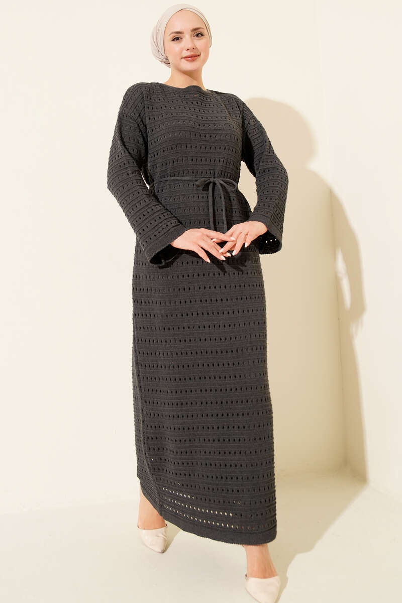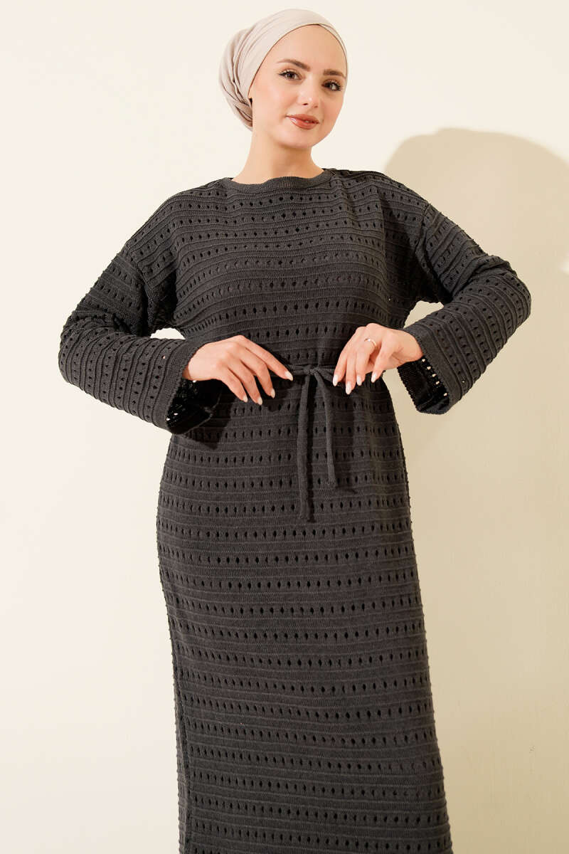 Yatay Ajurlu İp Kuşaklı Triko Elbise Taş