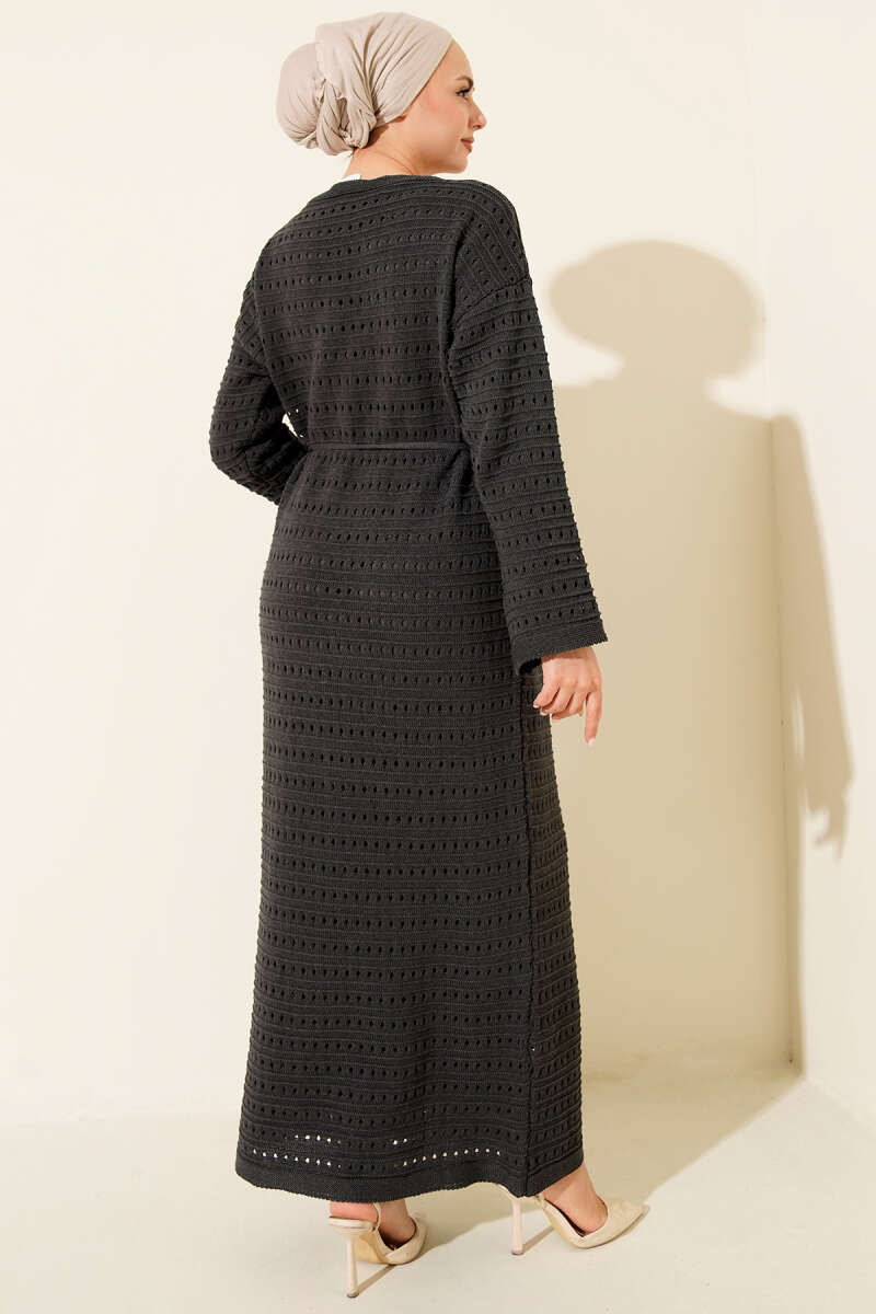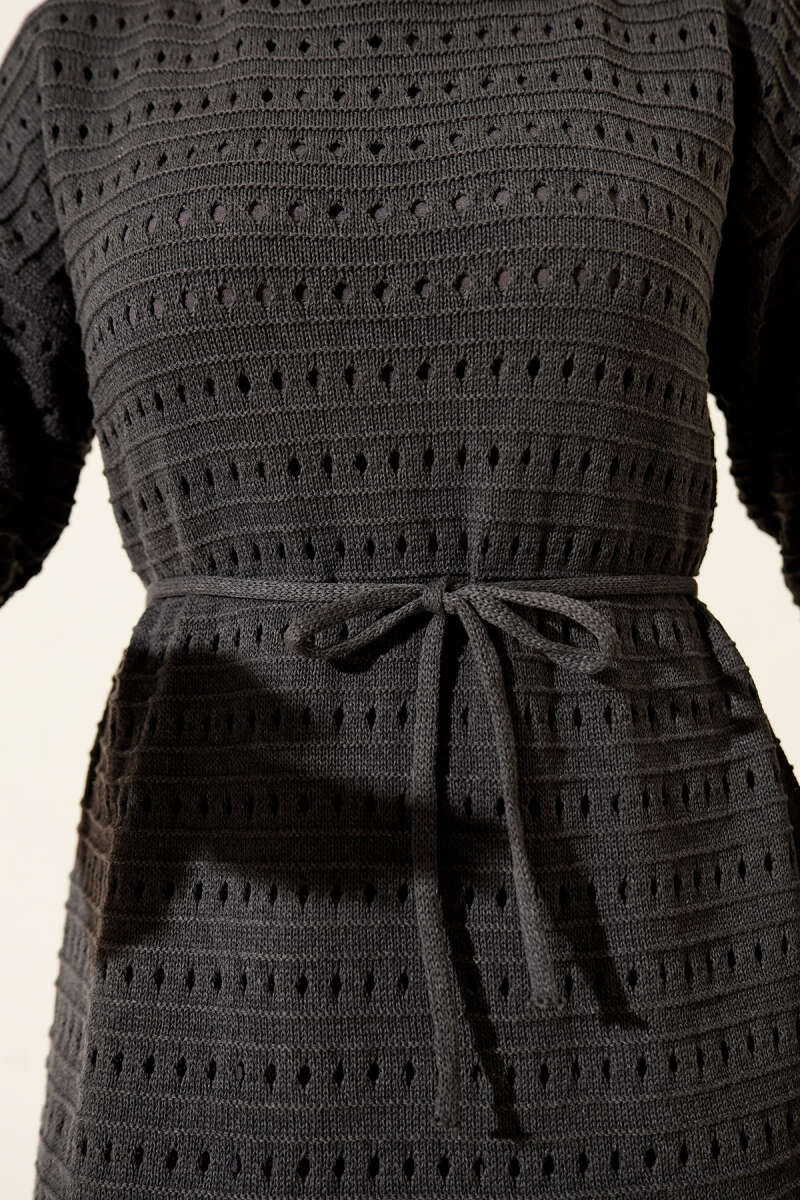 Yatay Ajurlu İp Kuşaklı Triko Elbise Siyah