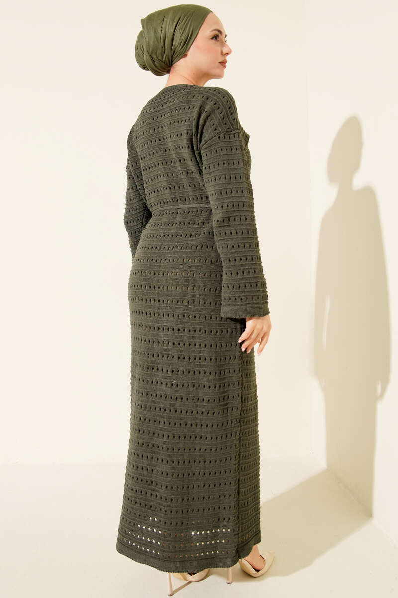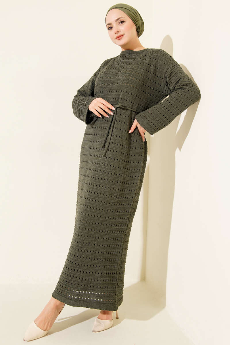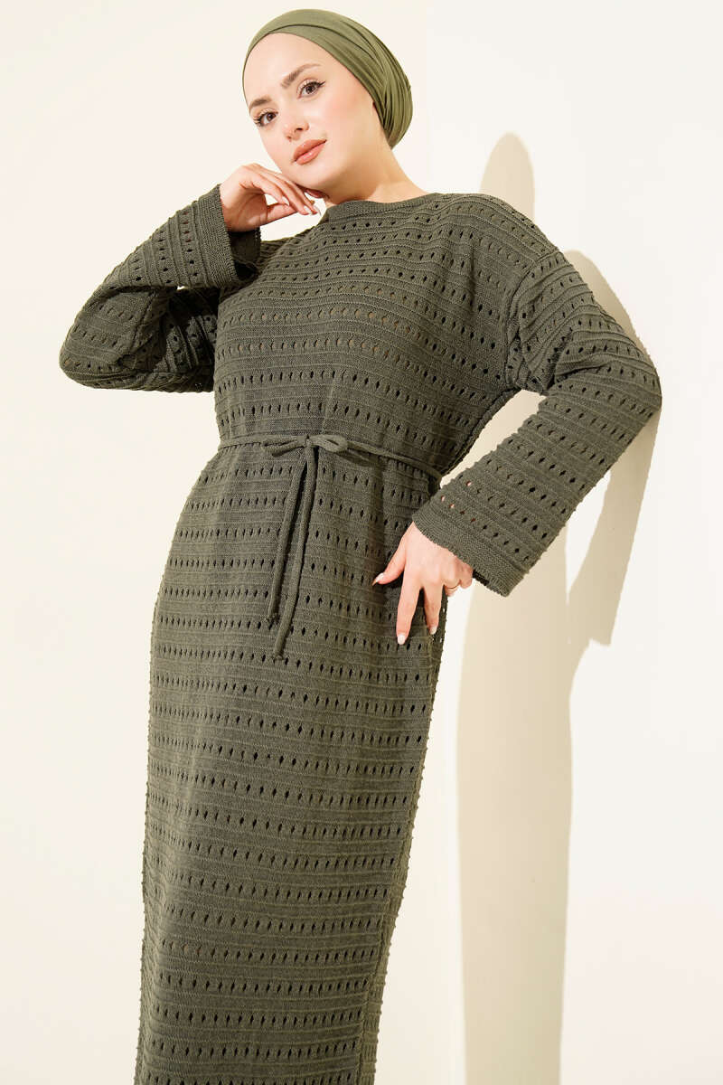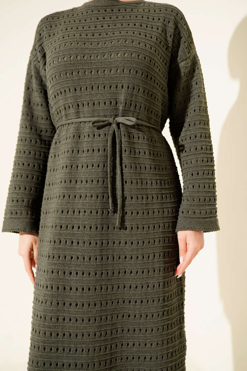 Yatay Ajurlu İp Kuşaklı Triko Elbise Zümrüt Yeşili