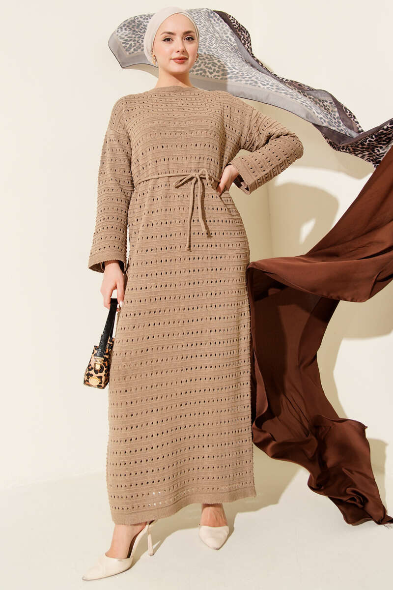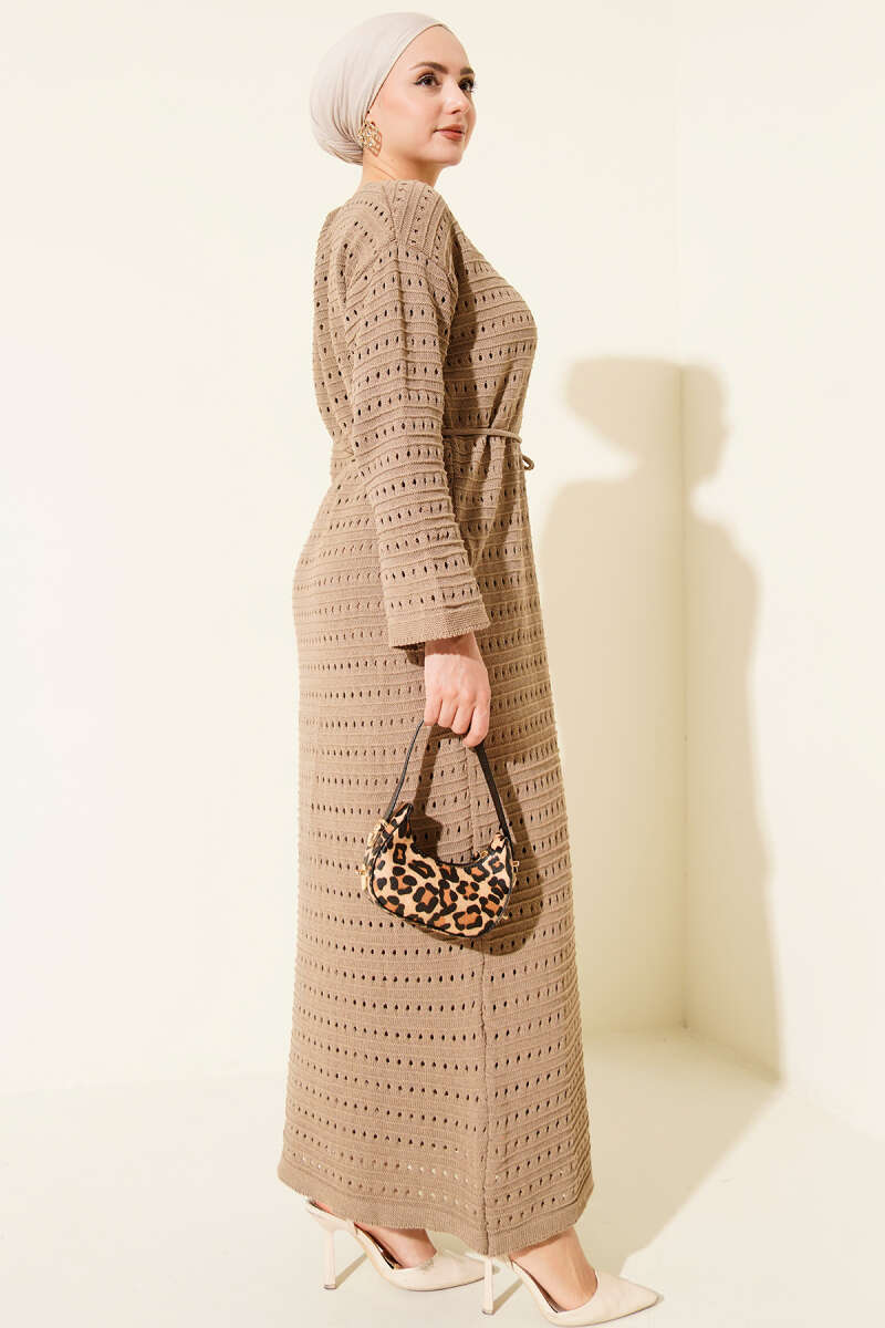 Yatay Ajurlu İp Kuşaklı Triko Elbise Taş