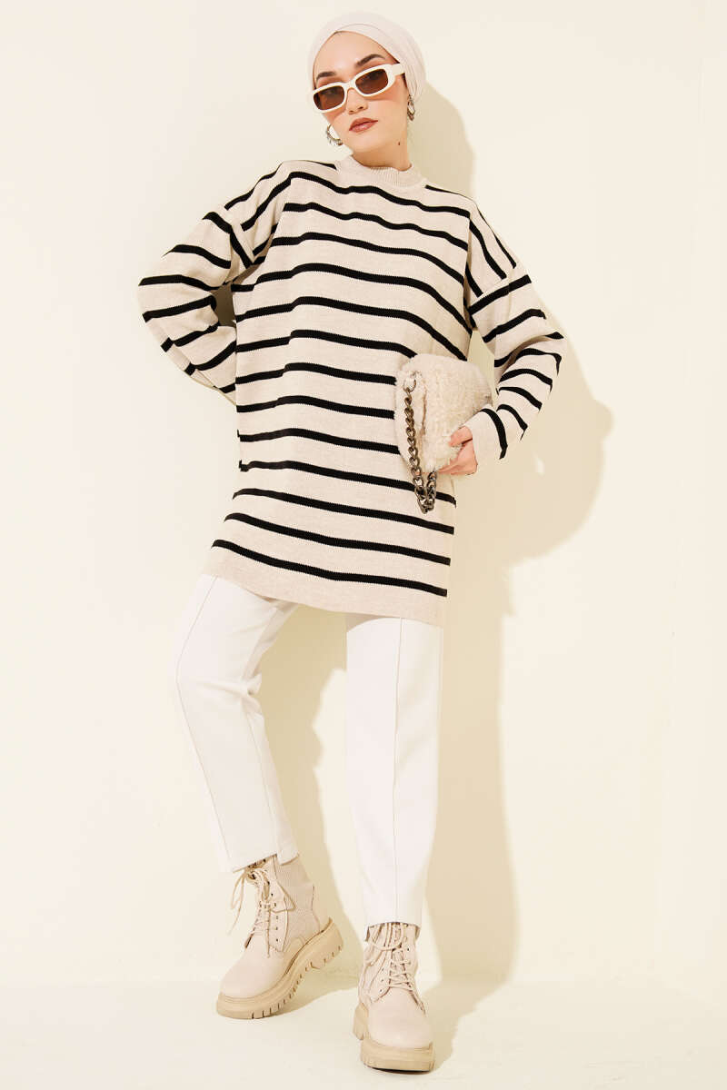 Yatay Çizgi Detaylı Basic Triko Tunik Bej