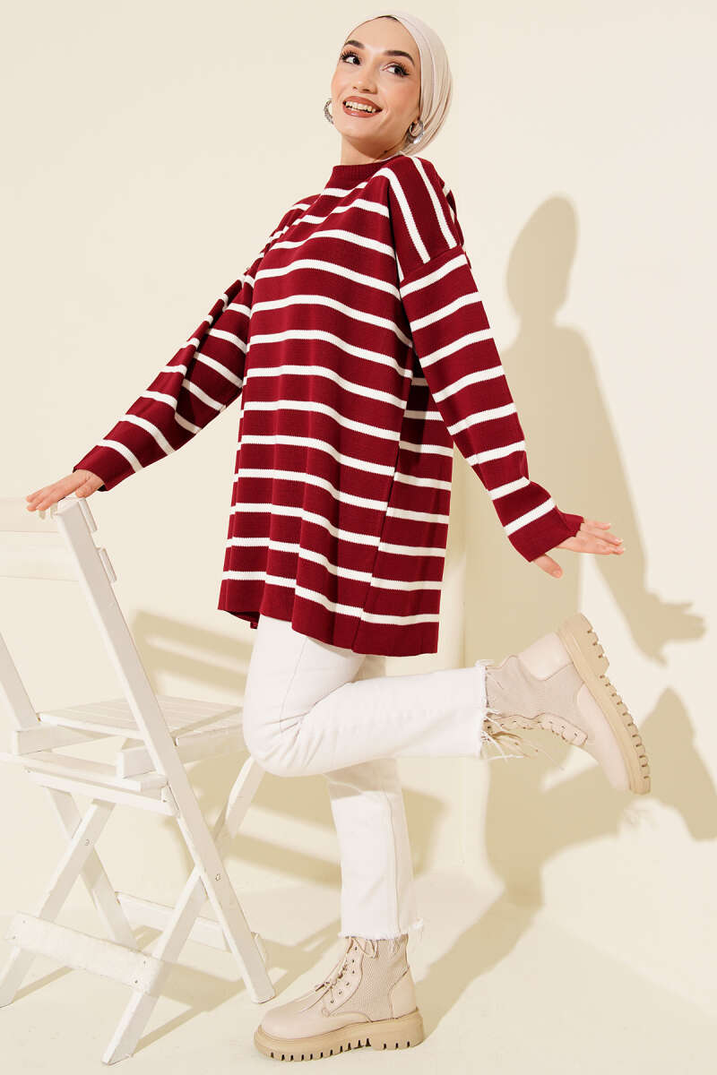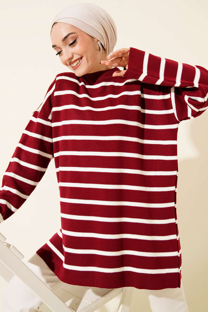 Yatay Çizgi Detaylı Basic Triko Tunik Bordo