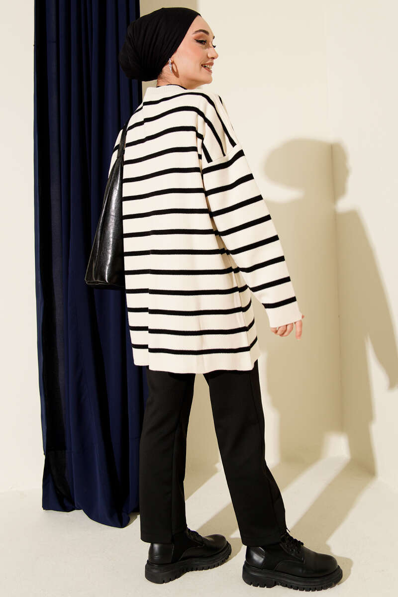 Yatay Çizgi Detaylı Basic Triko Tunik Ekru