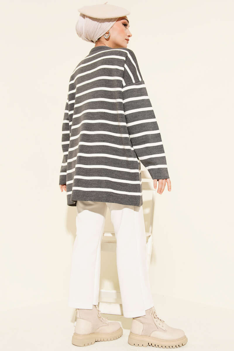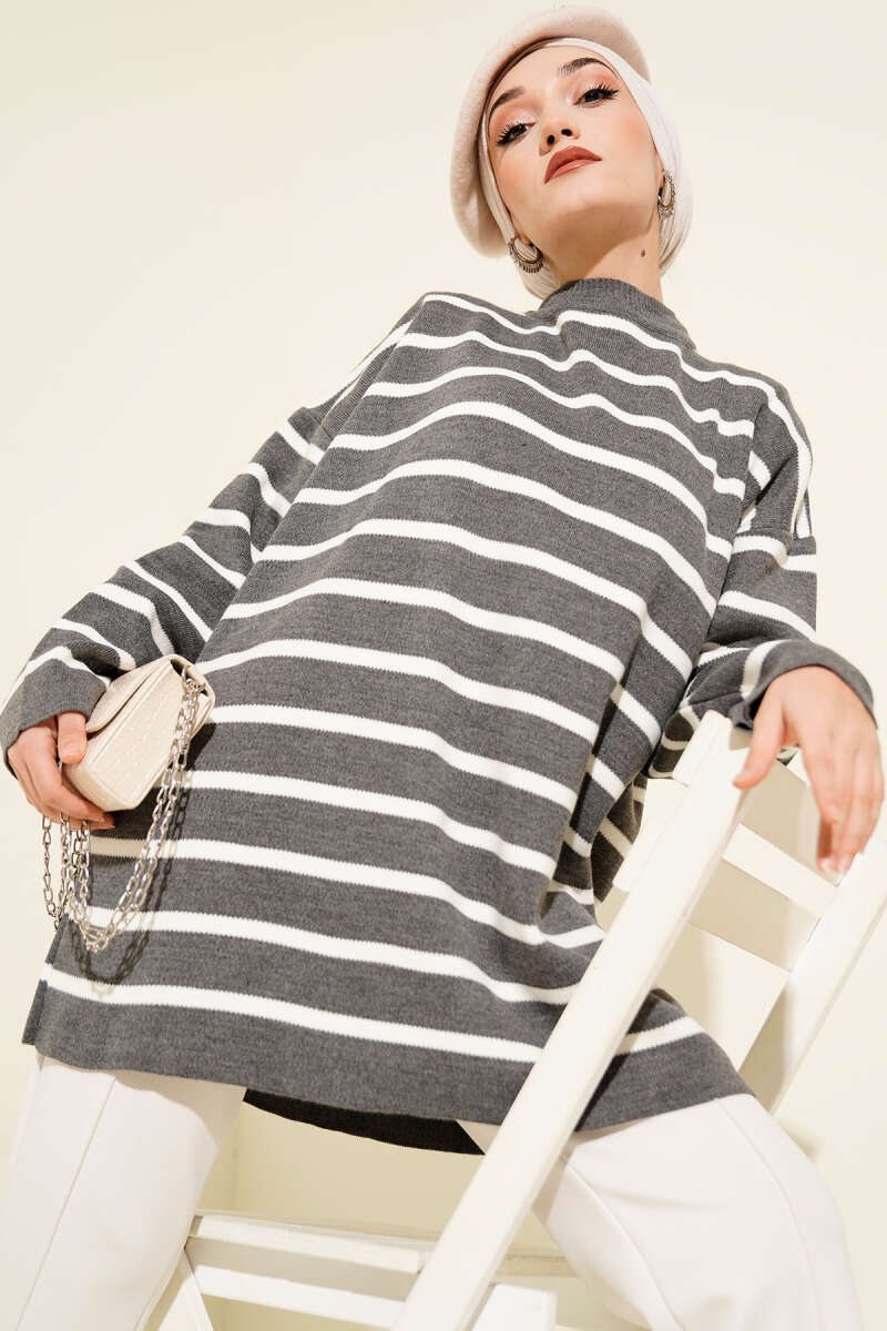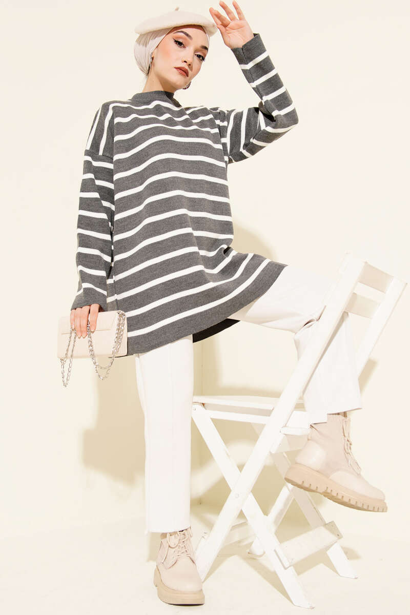 Yatay Çizgi Detaylı Basic Triko Tunik Gri