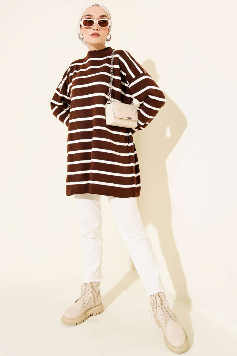 Yatay Çizgi Detaylı Basic Triko Tunik Kahve
