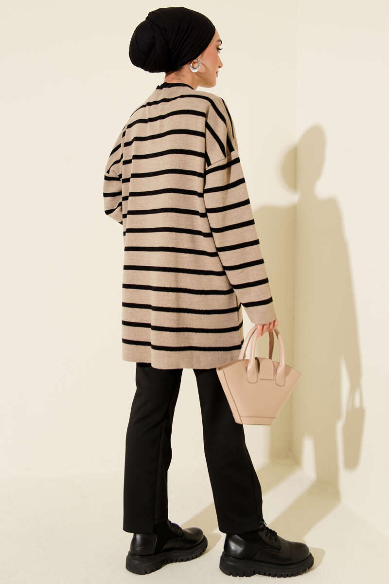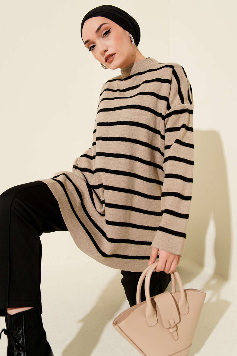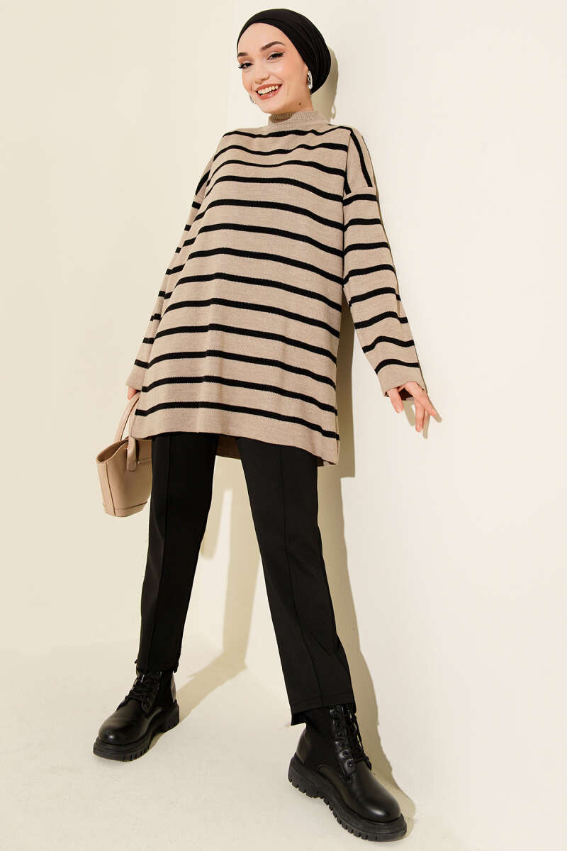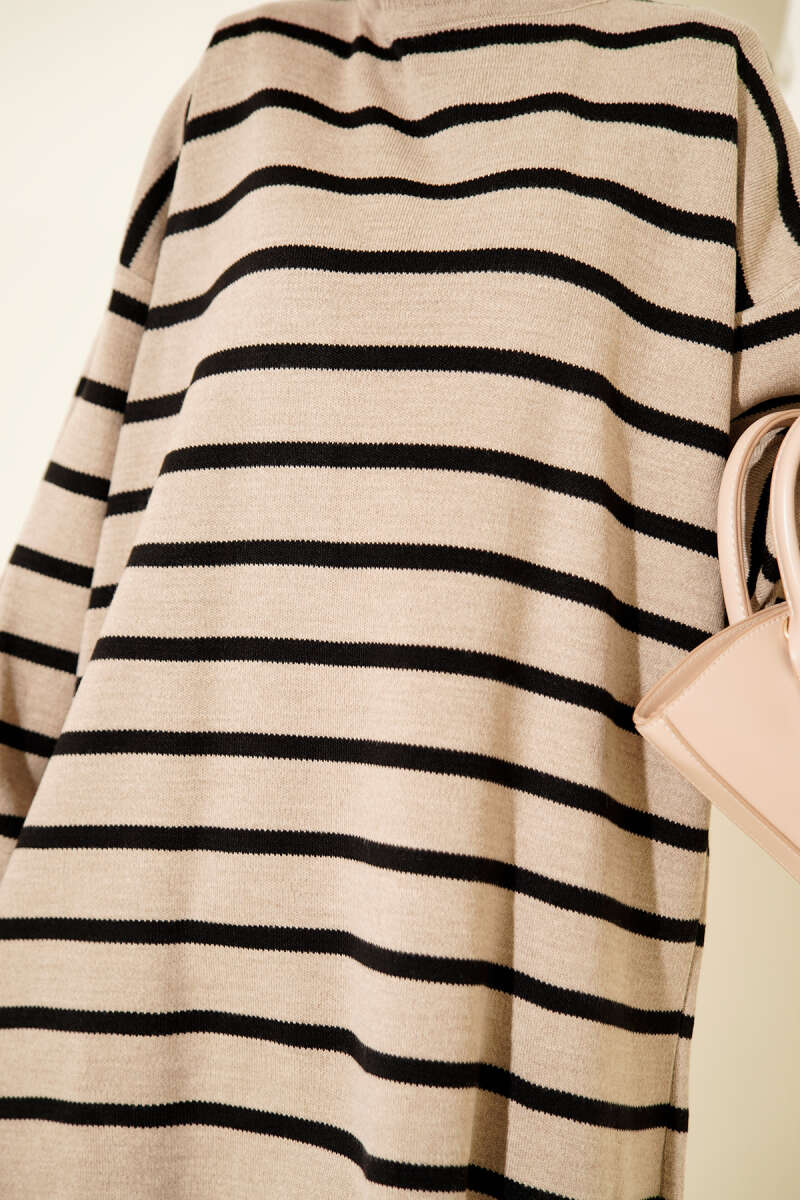 Yatay Çizgi Detaylı Basic Triko Tunik Bej