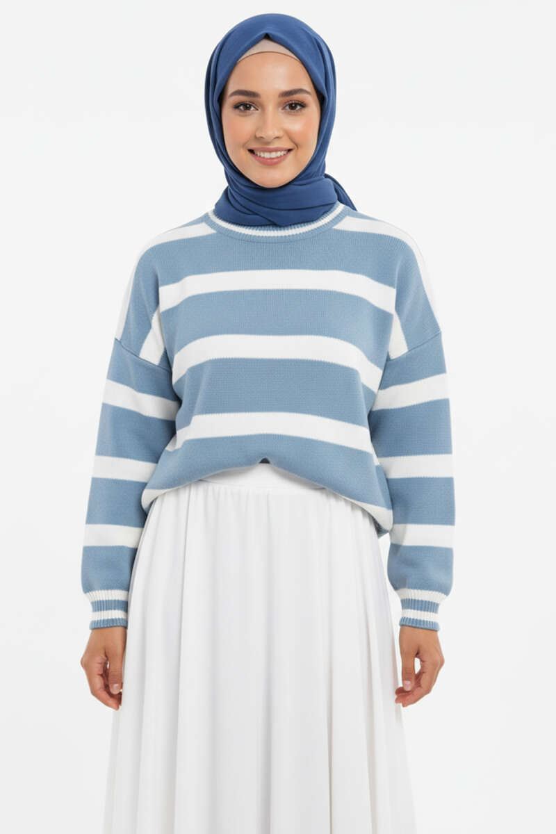 Balon Kol Çizgili Triko Tunik Lacivert