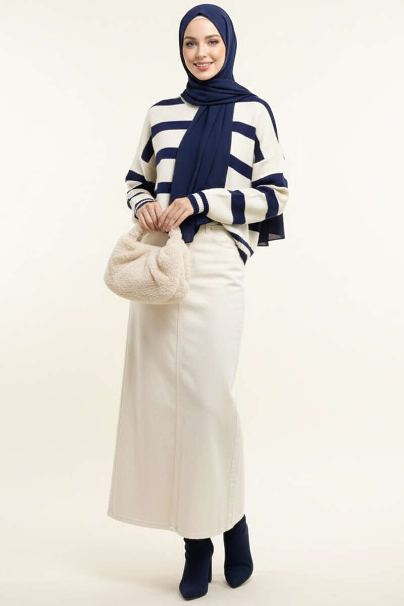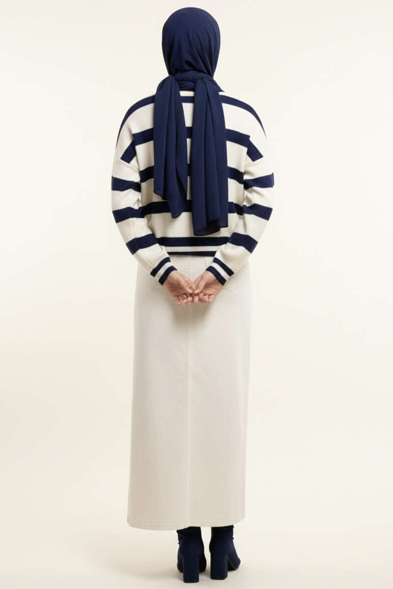 Yatay Çizgi Detaylı Kısa Triko Kazak Füme Ekru