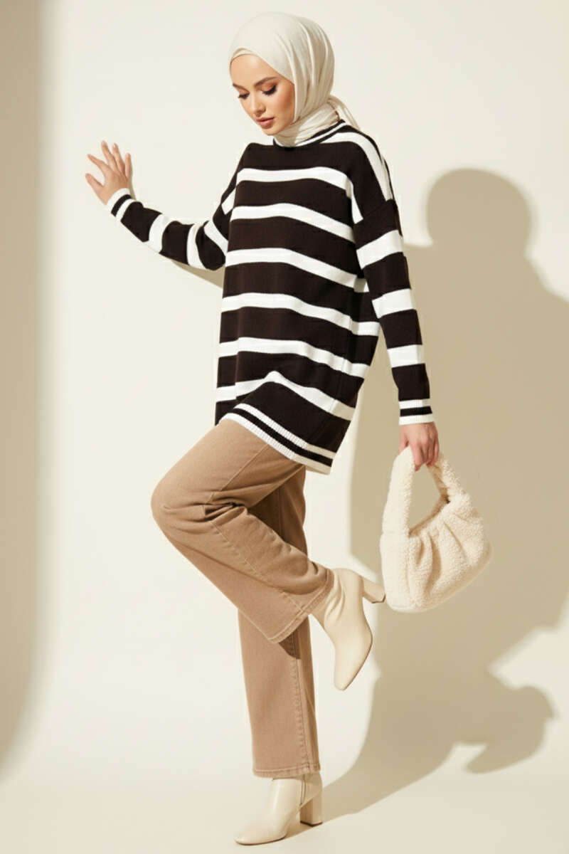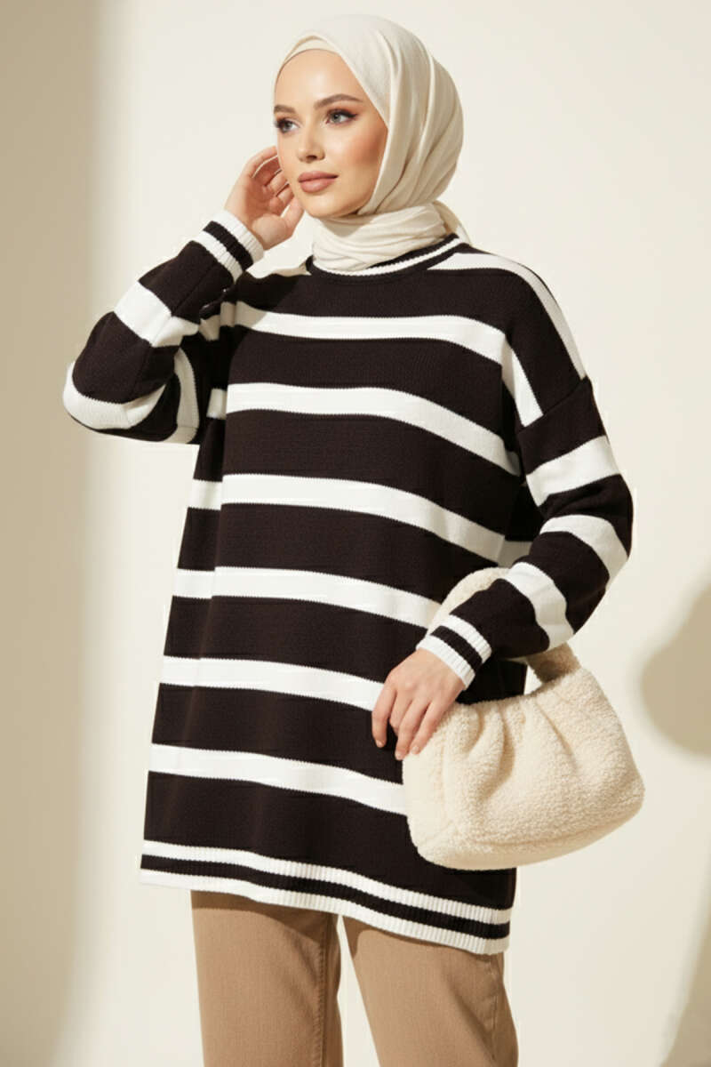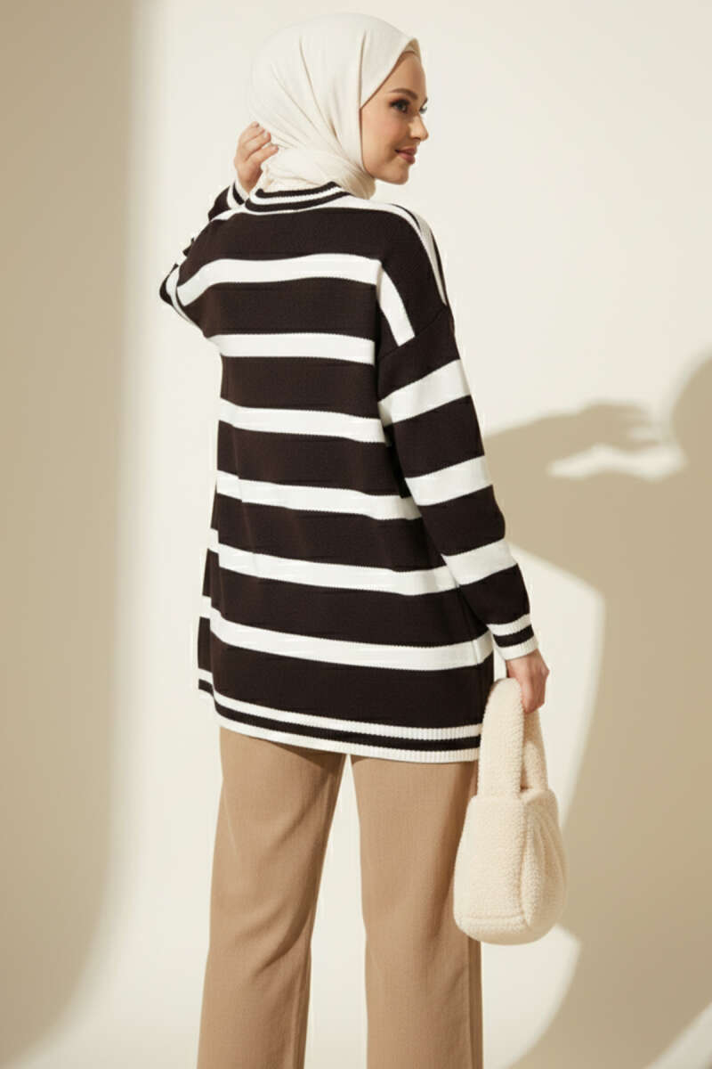Yatay Çizgi Detaylı Triko Tunik Kahve