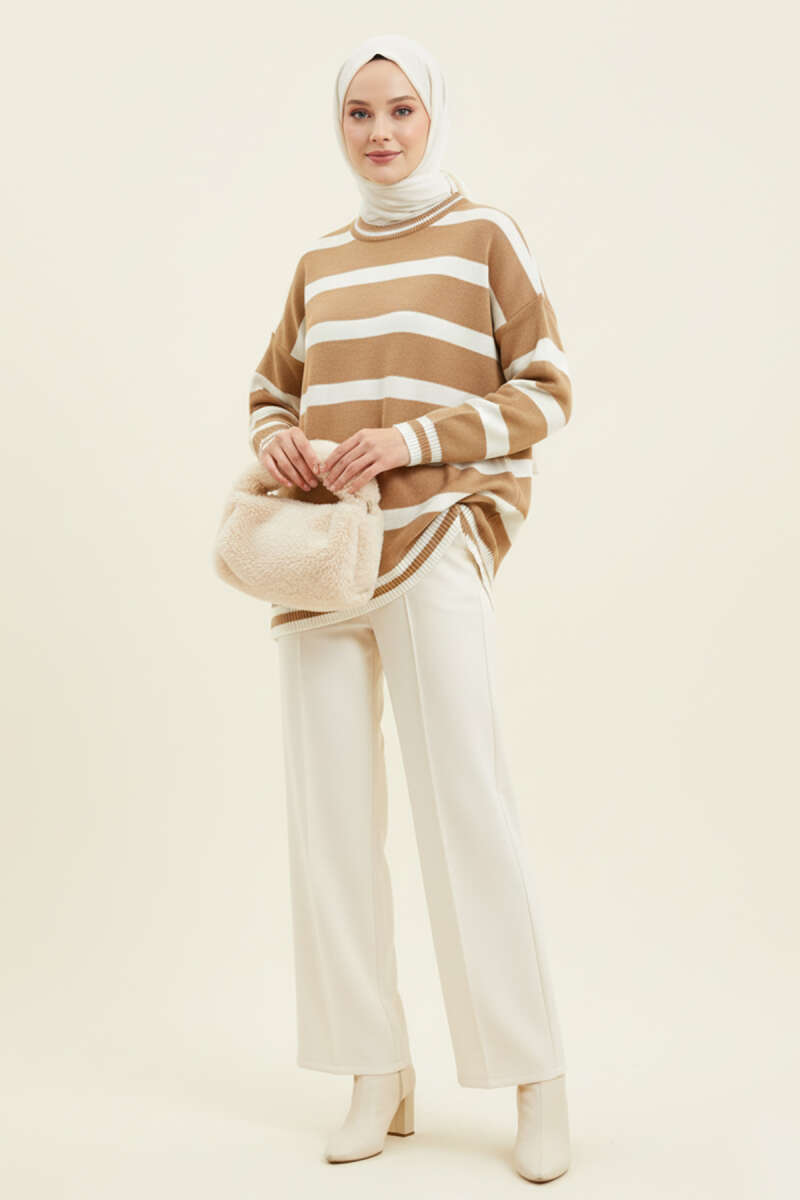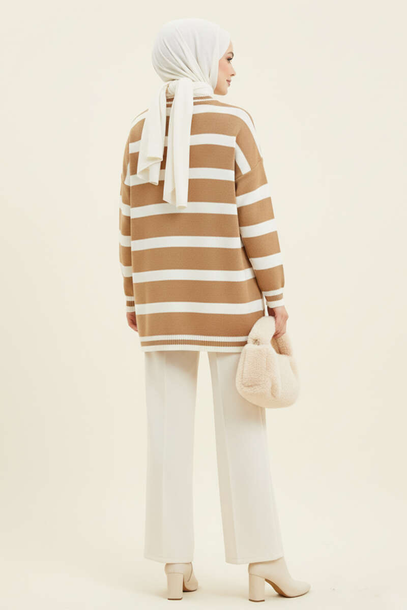 Yatay Çizgi Detaylı Triko Tunik Bej Lacivert