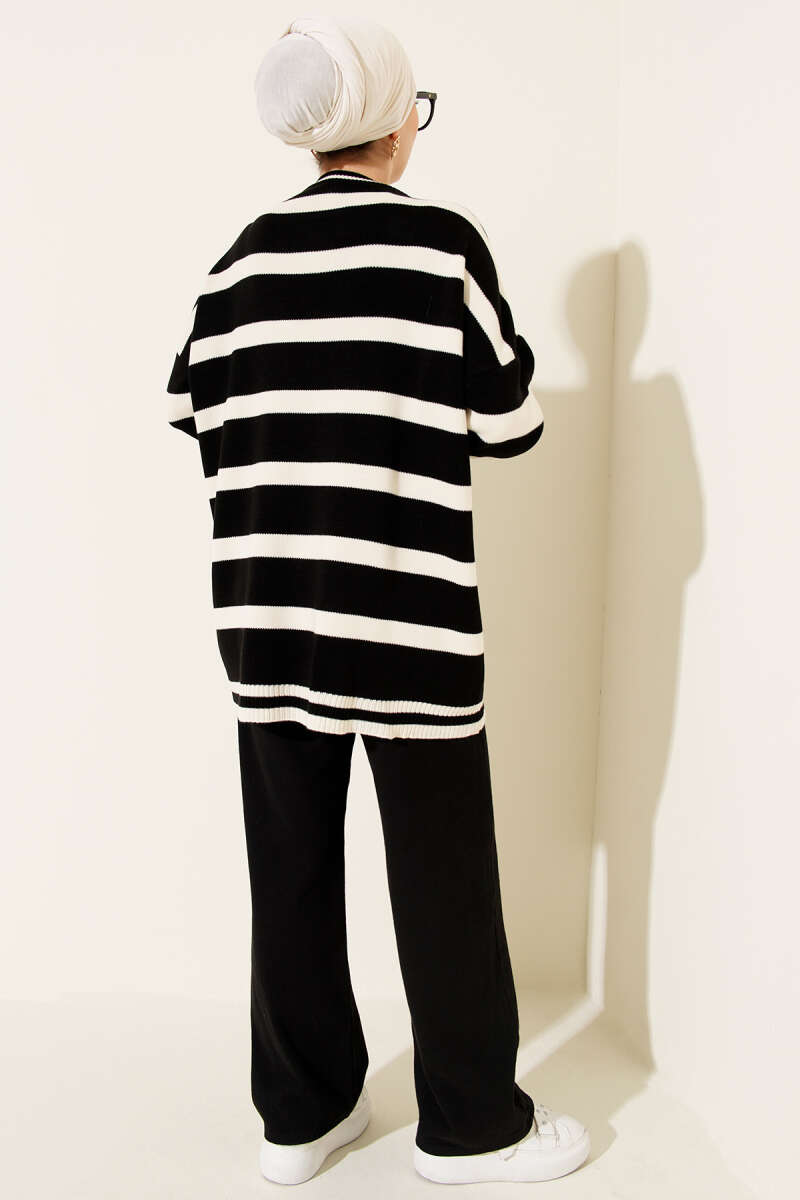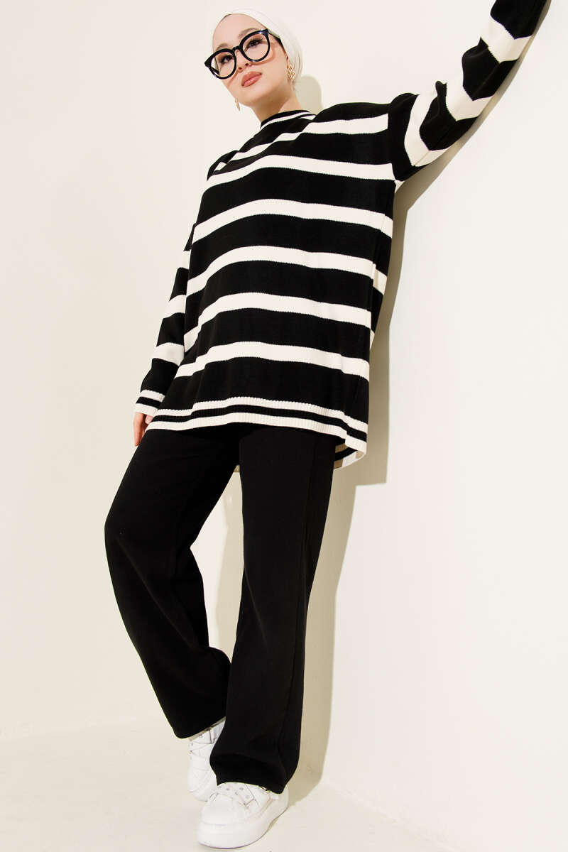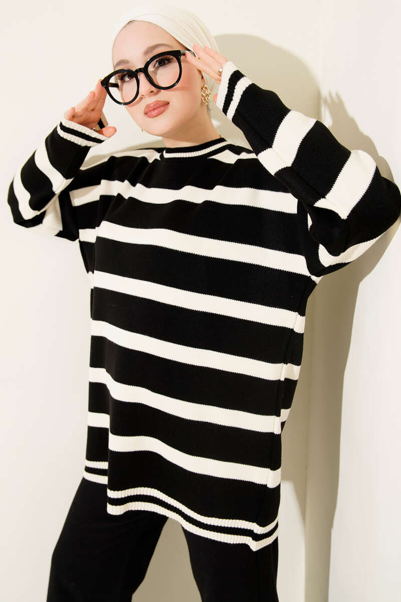 Yatay Çizgi Detaylı Triko Tunik Siyah