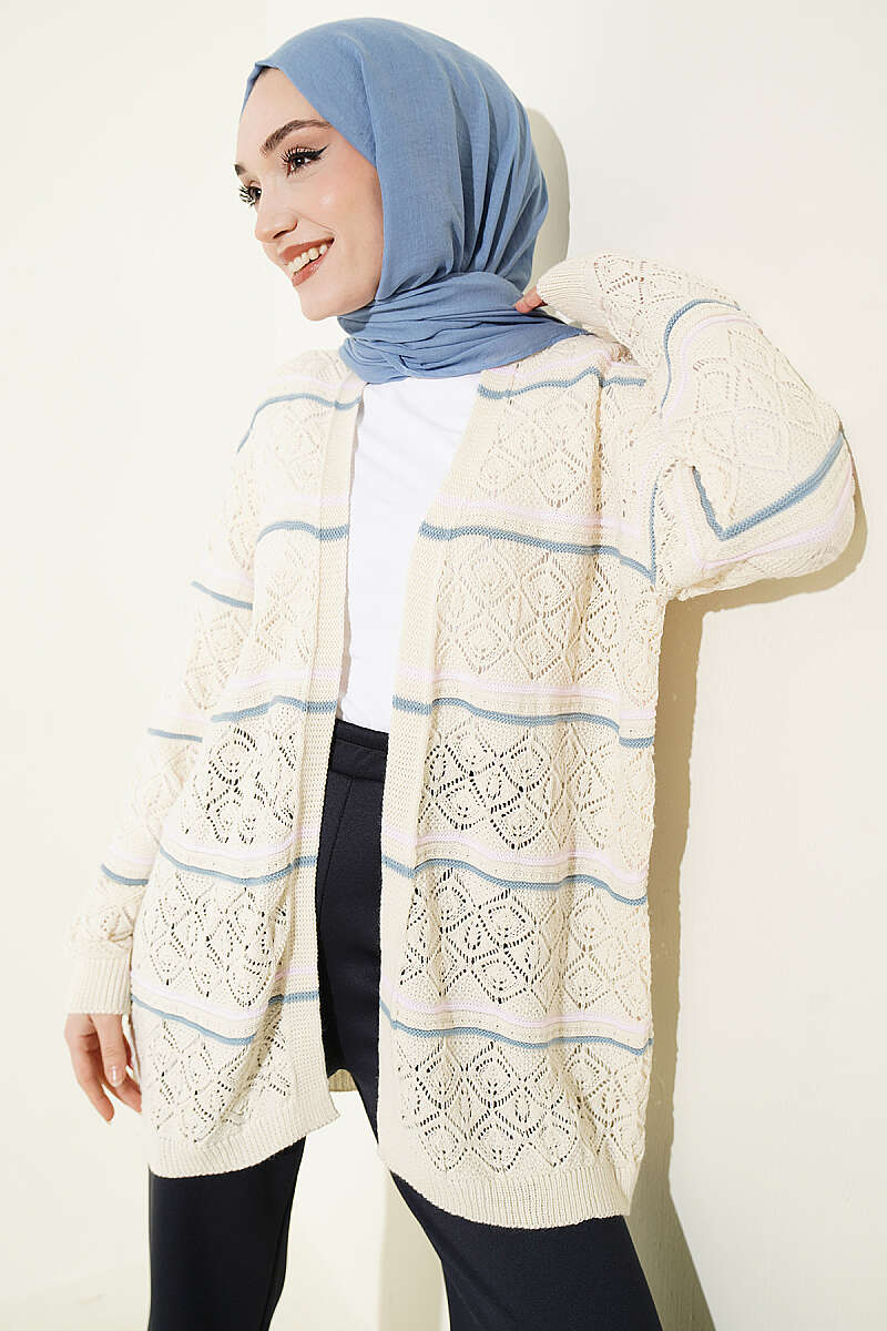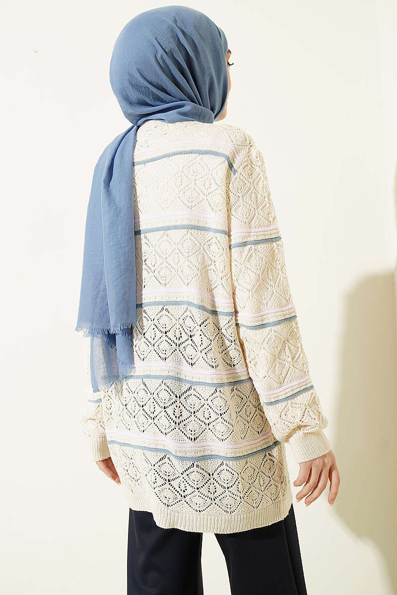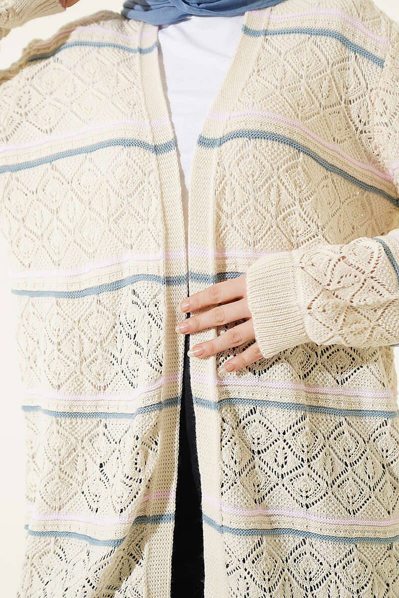 Yatay Çizgili Ajurlu Triko Hırka Bej