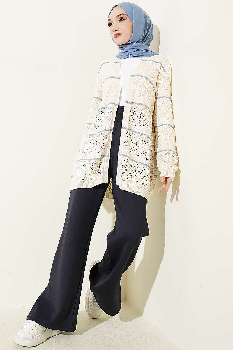 Bu hırka, ajurlu örgü tekniğiyle oluşturulan zarif desenleri ve yatay çizgi detaylarıyla bahar ve yaz aylarının hafifliğini stilinize taşır. Tasarımındaki delikli doku, hem nefes alan bir yapı sunar hem de hırkaya romantik ve sofistike bir hava katar. Önü açık kesimi ve dökümlü formu sayesinde farklı alt giyim parçalarıyla zahmetsizce kombinlenebilir, günlük şıklığınızı estetik bir şekilde tamamlar. Yumuşak triko dokusu ve modern çizgileriyle gardırobunuzun en konforlu ve çok yönlü parçalarından biri olmaya adaydır.